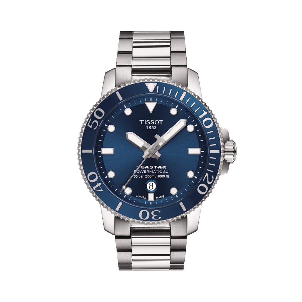 The Tissot Seastar 1000 merges style and performance without compromising either. With its water resistance up to 30 bar (300 m/1000 ft), screw-down crown and case back, it is the ultimate diving watch, now combined with the energy of the Powermatic 80 movement offering up to 80 hours of power...