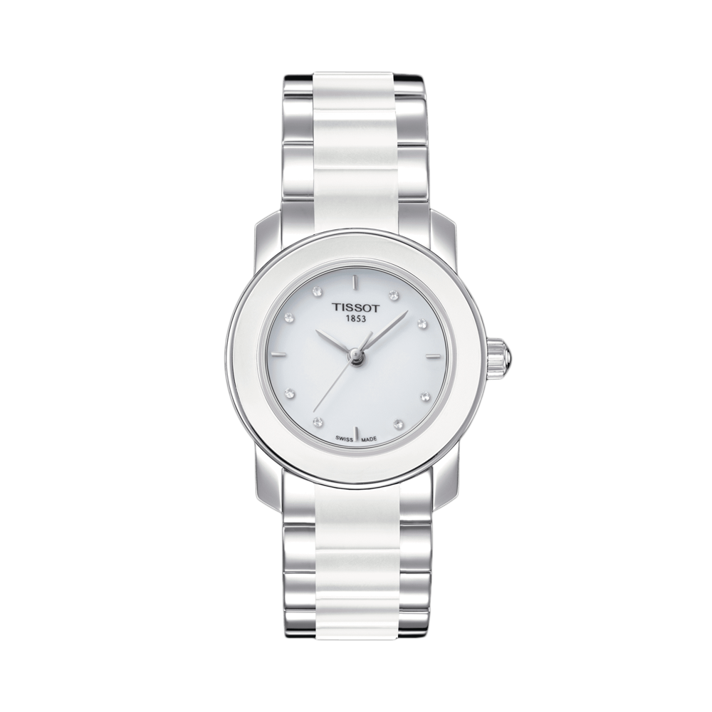 Stainless steel case with a stainless steel bracelet with white ceramic center links. Fixed stainless steel bezel with a white ceramic inlay. White dial with silver-tone hands and diamond hour markers. Dial Type: Analog. ETA caliber F03.111 quartz movement. Scratch resistant sapphire crystal. Pull / push crown. Solid case back. Case size: 28 mm. Case thickness: 6 mm. Round case shape. Band width: 16 mm. Band length: 7 inches. Fold over clasp. Water resistant at 30 meters / 100 feet. Functions: hour, minute, second. Casual watch style. Watch label: Swiss Made.