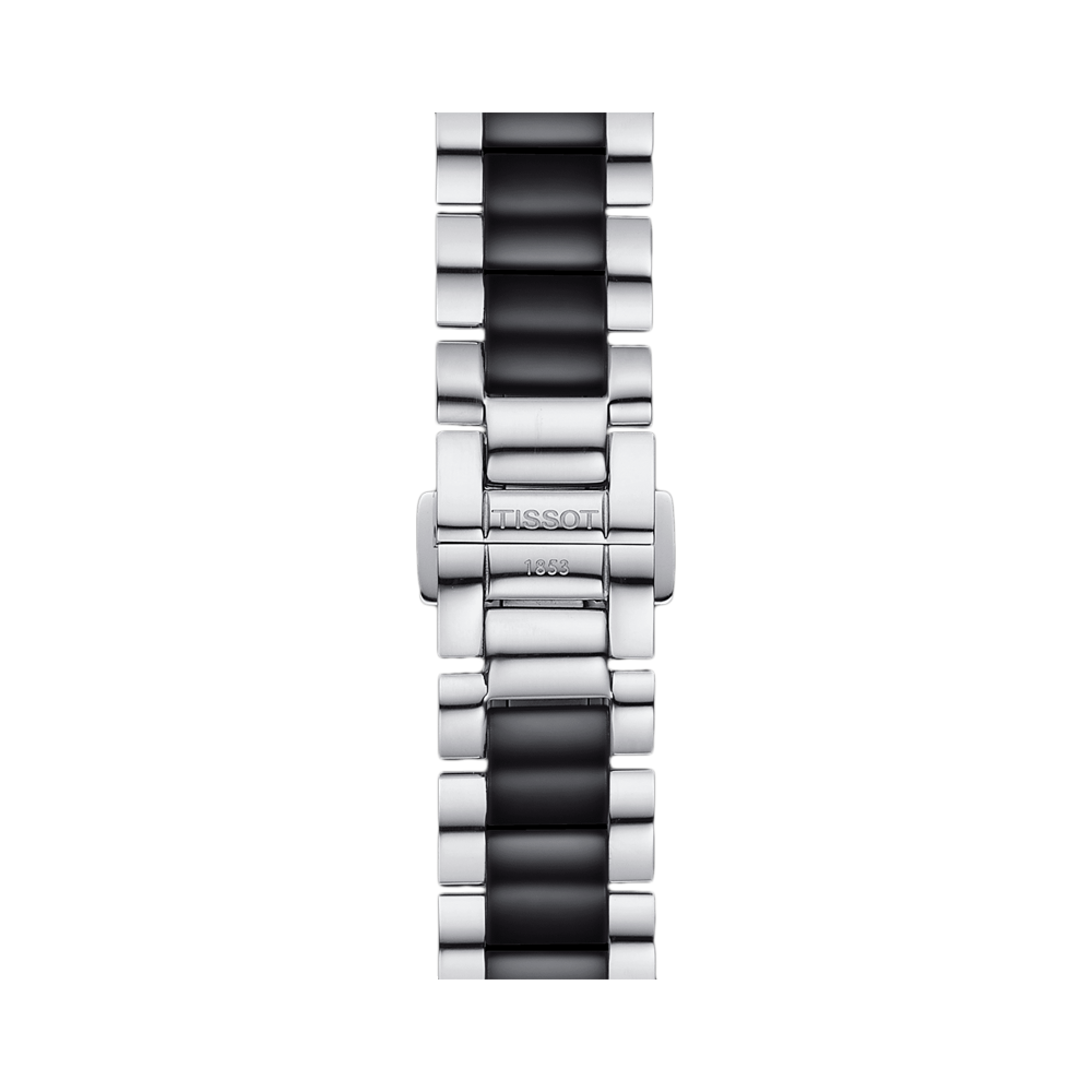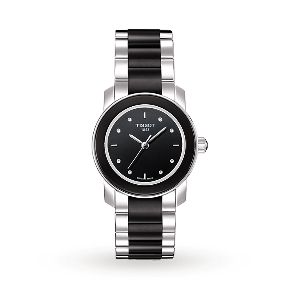 Stainless steel case with a stainless steel bracelet with black ceramic center links. Fixed stainless steel bezel with a black ceramic inlay. Black dial with silver-tone hands and diamond hour markers. Dial Type: Analog. ETA Caliber F03.111 quartz movement. Scratch resistant sapphire crystal. Pull / push crown. Solid case back....