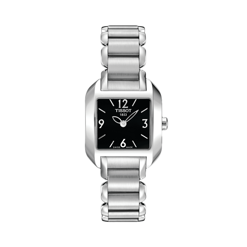 Stainless steel case with a stainless steel bracelet. Fixed stainless steel bezel. Black dial with silver-tone skeleton hands and stick hour markers. Arabic numerals mark the 3, 6, 9 and 12 o'clock positions. Dial Type: Analog. ETA caliber 901.001 quartz movement. Scratch resistant sapphire crystal. Pull / push crown. Solid...