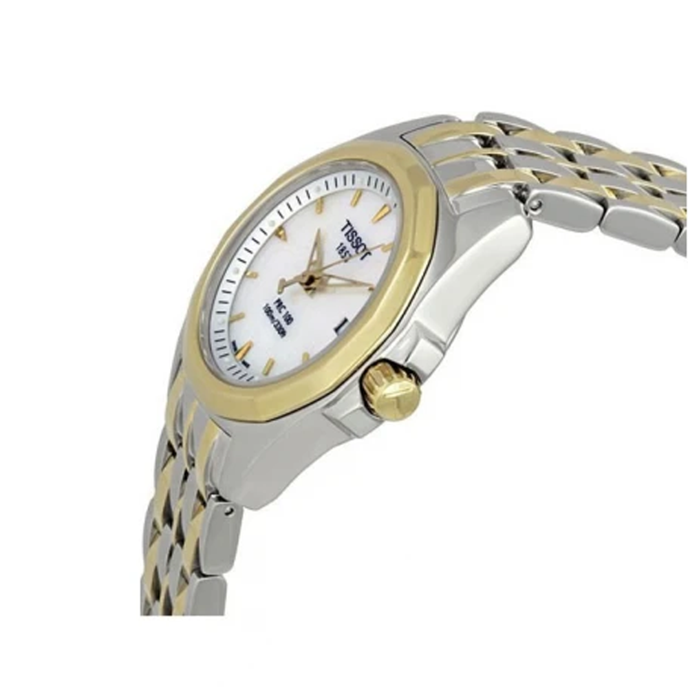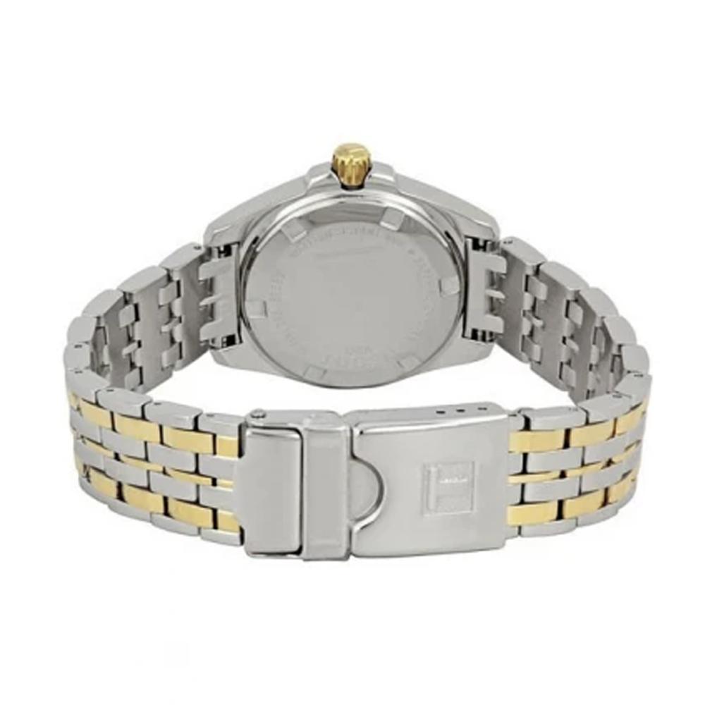 Silver-tone stainless steel case with a two-tone (silver-tone and gold-tone) stainless steel bracelet. Fixed gold-tone bezel. Mother of pearl dial with luminous gold-tone hands and stick hour markers. Minute markers around the outer rim. Dial Type: Analog. Luminescent hands and markers. Date display at the 3 o'clock position. ETA Caliber...
