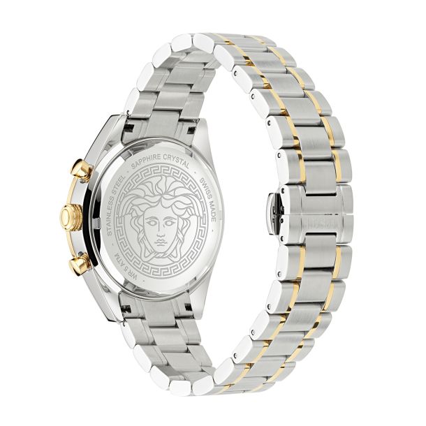 Introducing the Versace V-Code Chrono Watch, featuring the iconic Medusa head at 12h. This two-tone stainless steel bracelet watch is perfect for everyday wear and boasts a reliable chrono movement. Experience luxury and precision with this premium timepiece from a trusted watch retailer since 1947. Shop now at Krishna Watch...