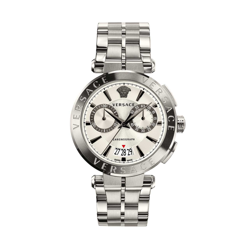 A bi-compax chronograph with a sporty but highly stylish attitude: this, in brief, is the new Aion chronograph presented by Versace. Its strong look is given by the XL case, solid central lugs, and large geometrical pushbuttons that activate the chrono functions. The Swiss Made quartz movement guarantees precise short-time...