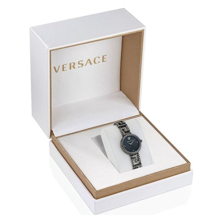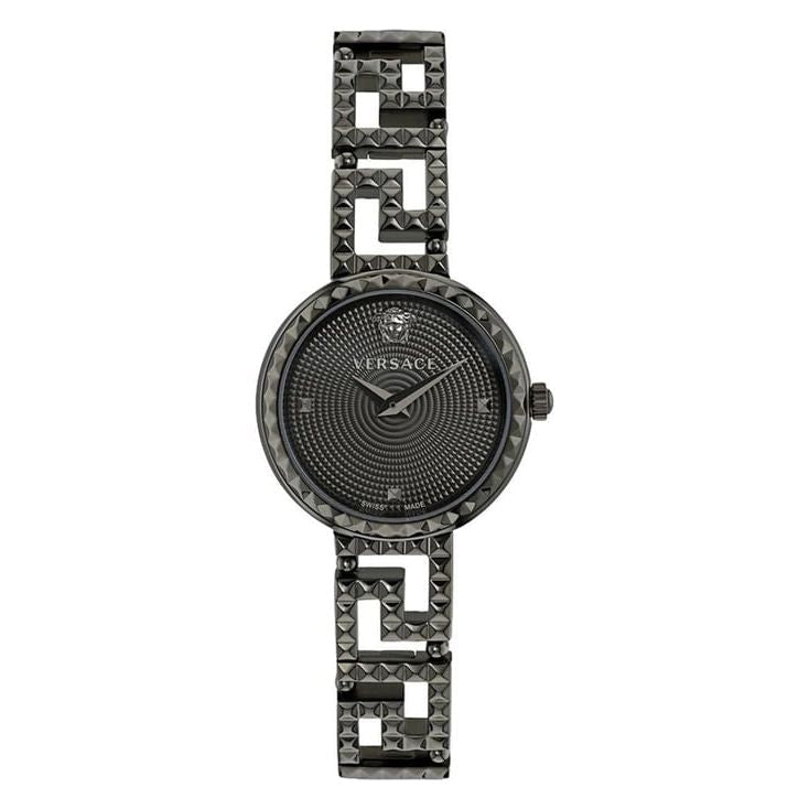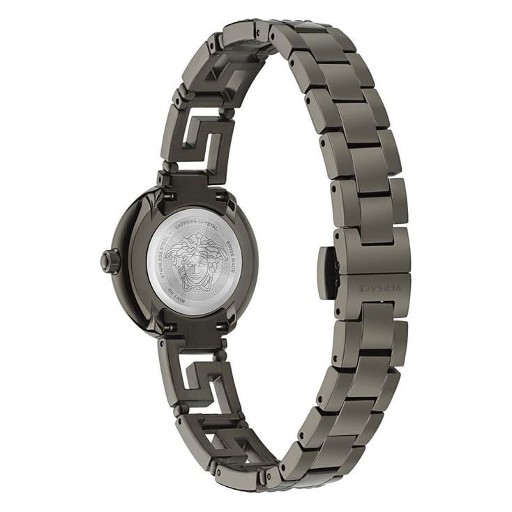 Set your fashion parameters high with this women's analog watch from the Greca Goddess collection by Versace. Protected by a sapphire crystal with anti-reflective coating, the black round dial is housed in a 28 mm case. It exudes plain two hands. The stainless steel strap vaunts a grey hue that...