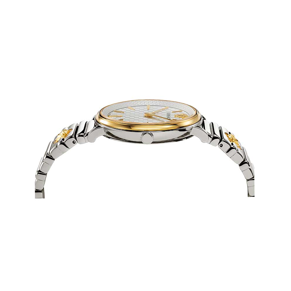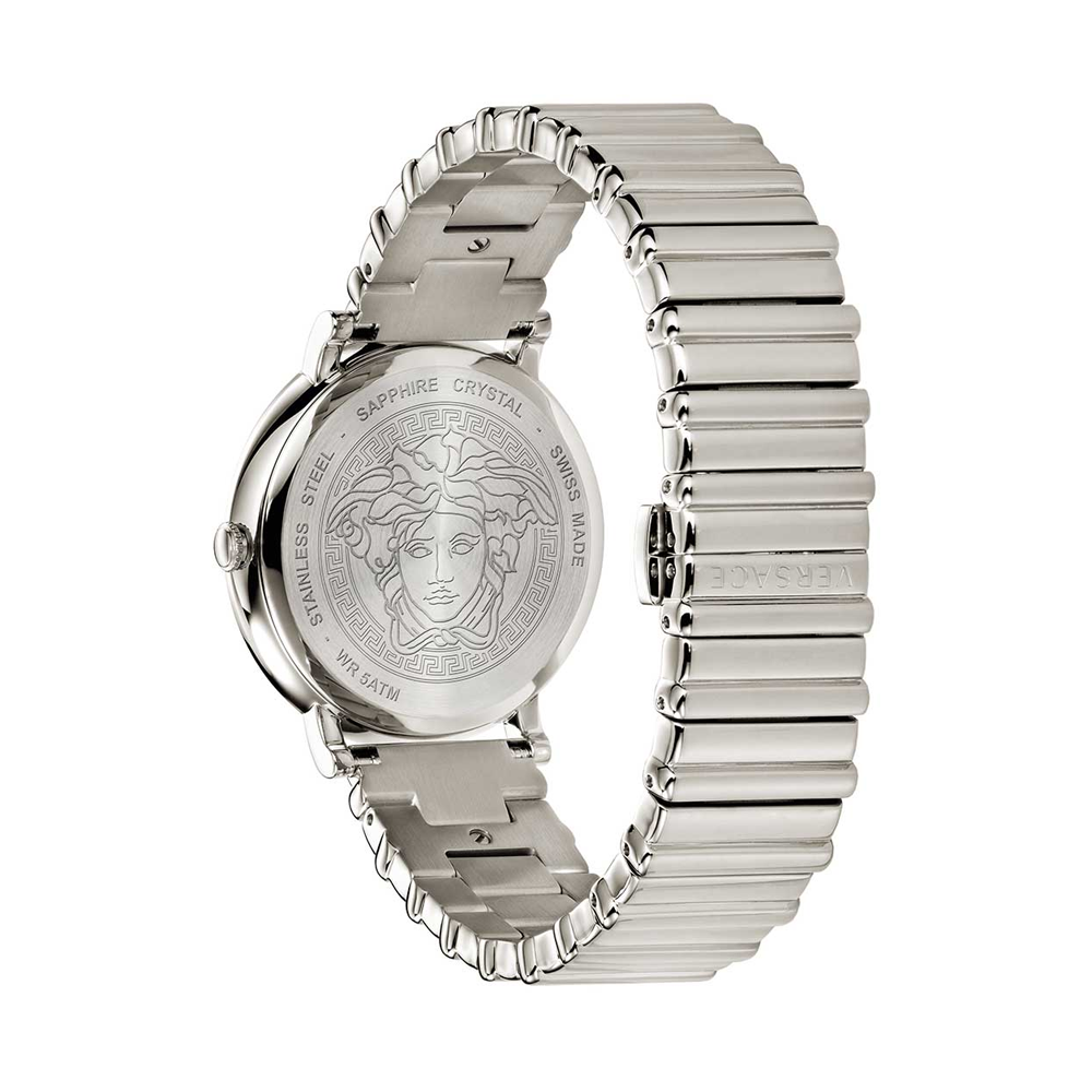 V Circle/Logomania Edition has a strong character, perfect for the true Versace lovers. The bold Medusa stands out on the bracelet, giving an iconic and playful touch to the minimal design of its 38mm slim case.