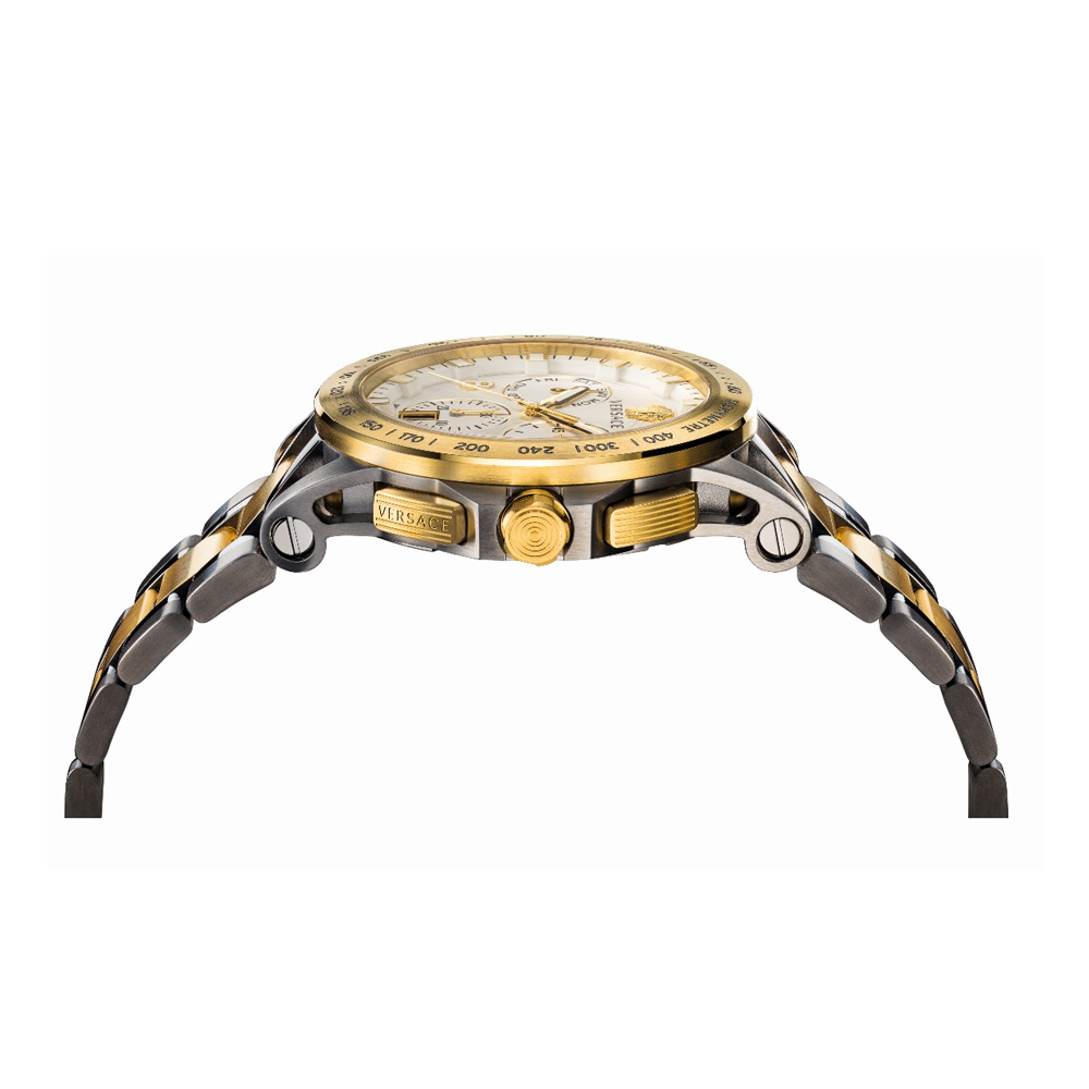 Stainless steel case with a two-tone (silver-tone and yellow gold-plated) stainless steel bracelet. Fixed yellow gold-plated bezel showing tachymeter marking. White dial with luminous yellow gold-tone hands and index hour markers. Minute markers around the outer rim. The Medusa Head logo appears below the 12 o'clock position. Dial Type: Analog. Luminescent hands and markers. Date display at the 6 o'clock position. Two sub-dials displaying: 60 second and 30 minute. Day of the week sub-dial. Quartz movement. Scratch resistant sapphire crystal. Solid case back. Round case shape. Case size: 45 mm. Case thickness: 11.8 mm. Bracelet width: 23.4 mm. Butterfly clasp. Water resistant at 100 meters / 330 feet. Functions: chronograph, date, hour, minute, second. Sport Tech Series. Dress watch style. Watch label: Swiss Made.