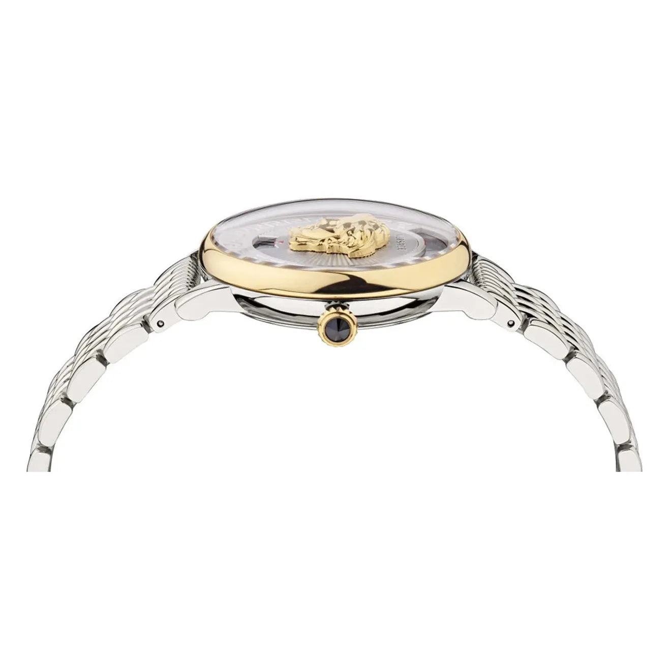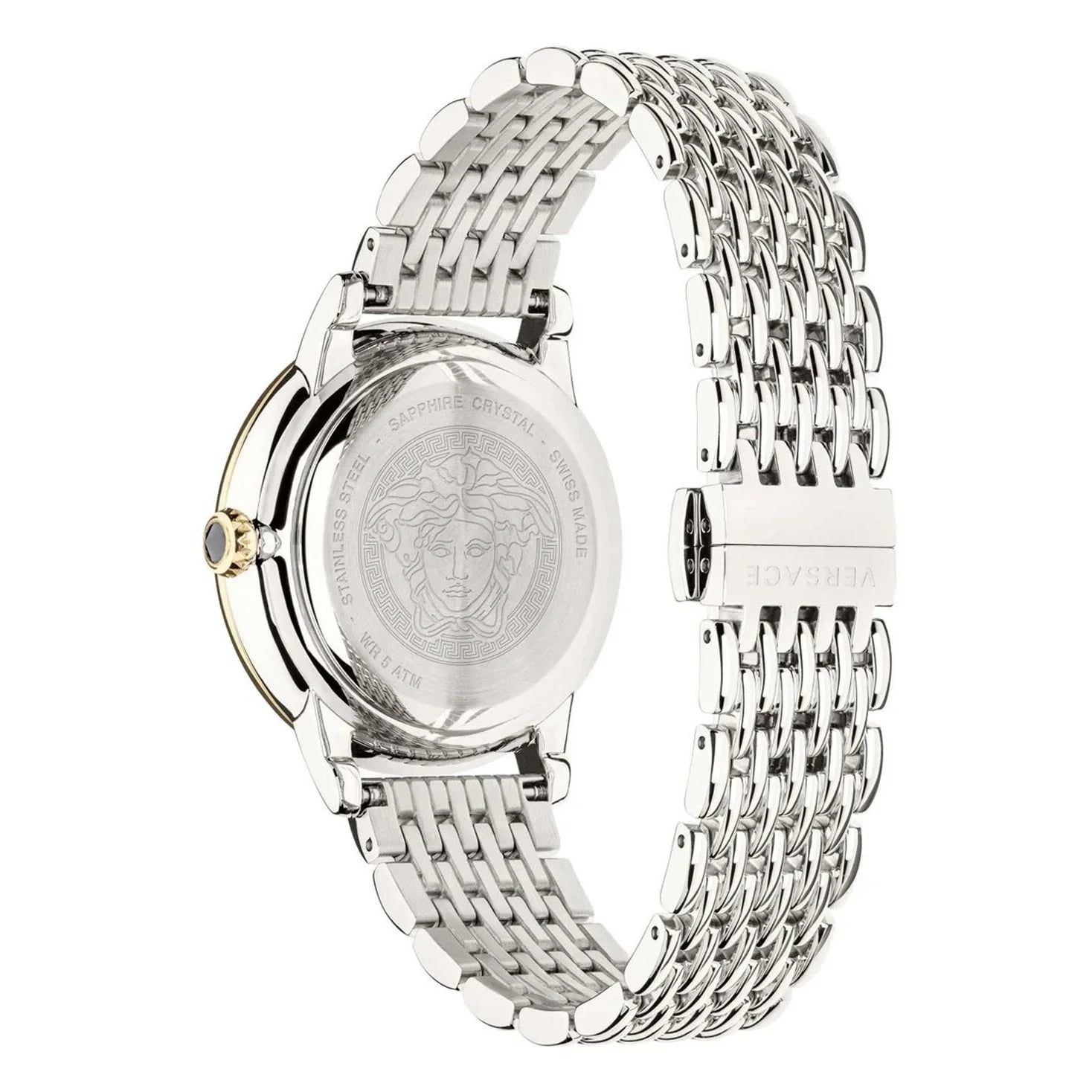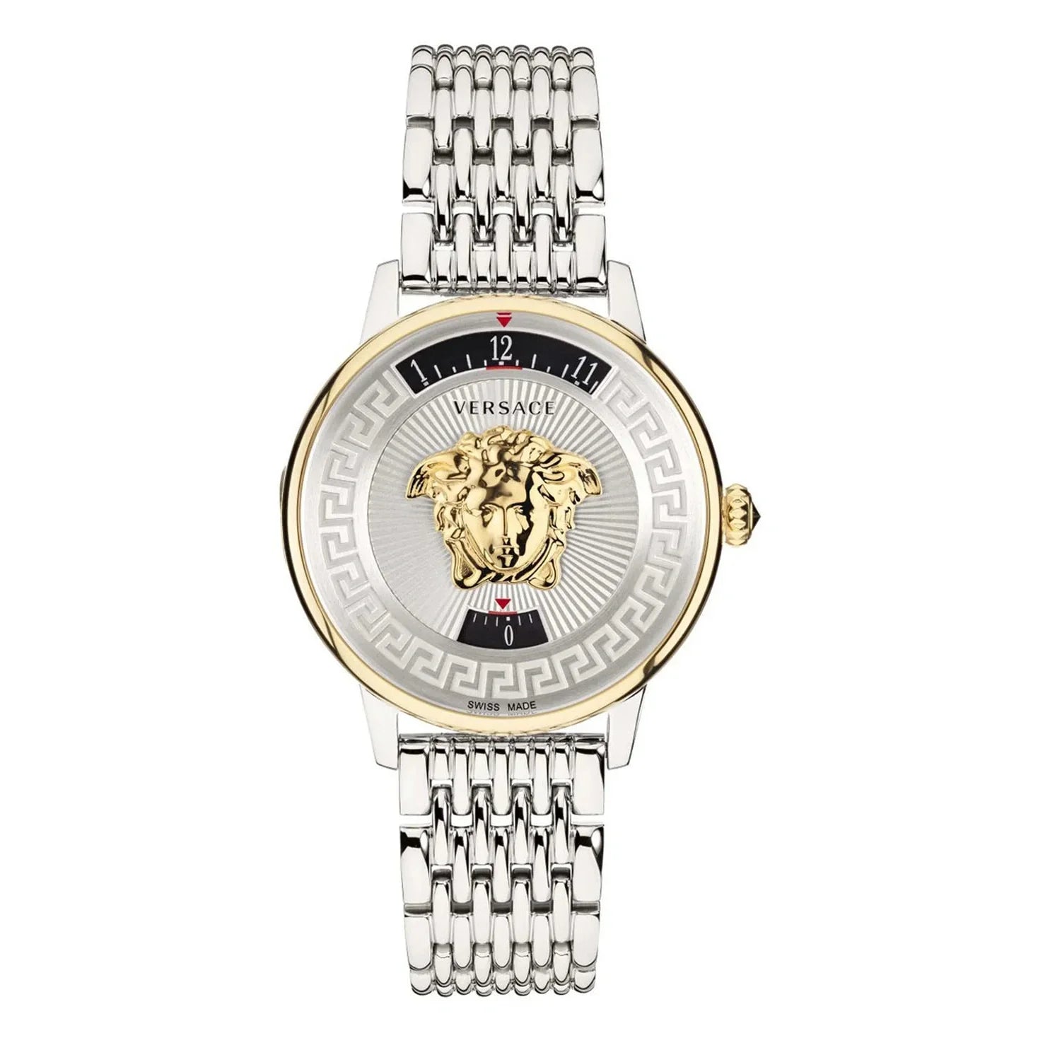 Elevate your style with the Versace Men's Watch. This Swiss-made watch features a 38 mm dial with a three-dimensional Medusa in the center surrounded by the signature Greca pattern. Its Ronda 712/3 Swiss quartz movement ensures accuracy, while the engraved greca texture and iconic Versace logo add sophistication. Make a...