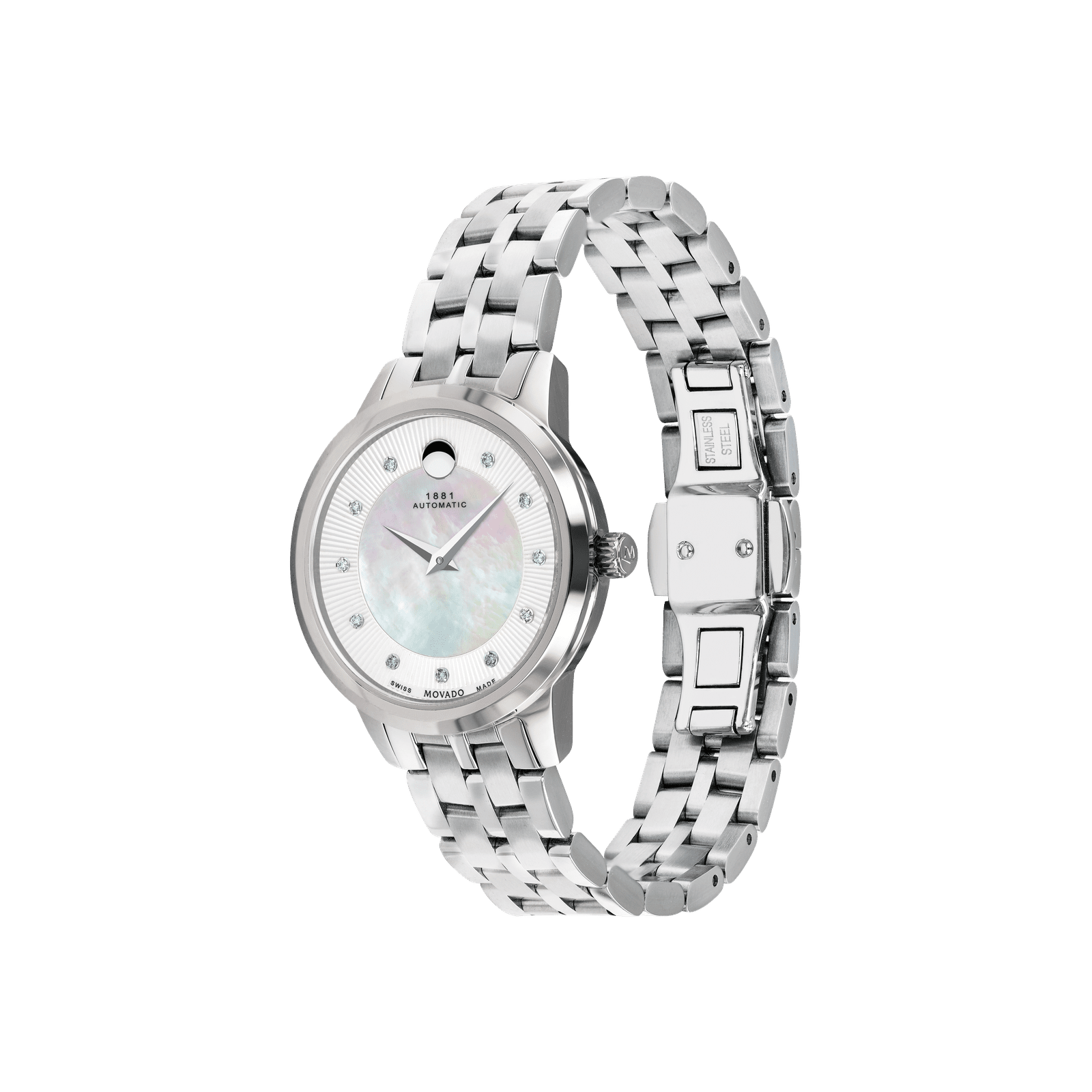 Movado 1881 Automatic, 30 mm stainless steel case and bracelet with white mother-of-pearl textured dial & 11 Diamond markers. Caseback features an exposed automatic movement. Automatic watches do not contain batteries. They are charged by the movement of your wrist. If the watch is not worn it will stop running...