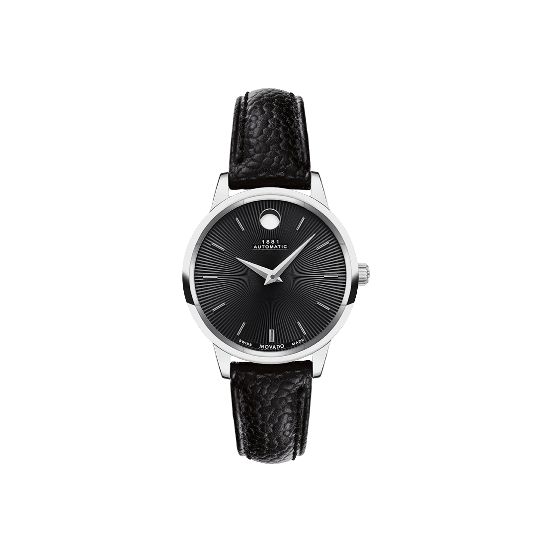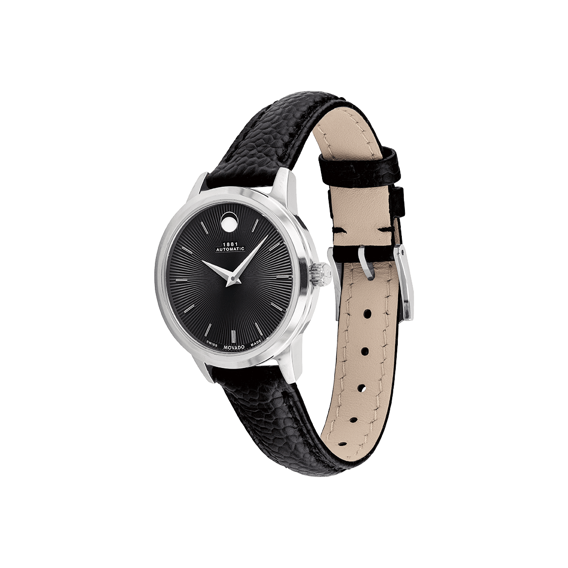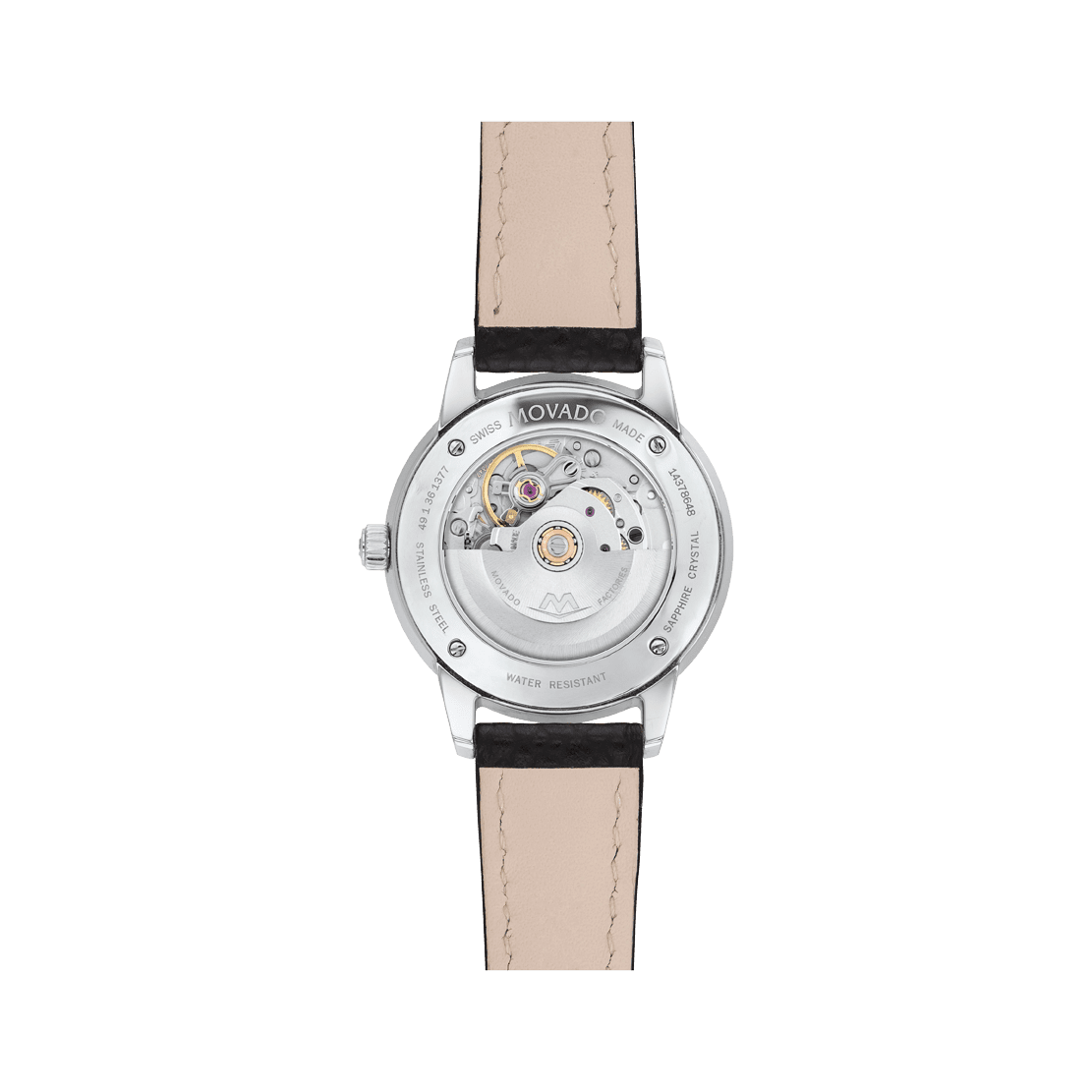Movado 1881 Automatic, 30 mm stainless steel case with black textured dial and black calfskin leather strap. Caseback features an exposed automatic movement.