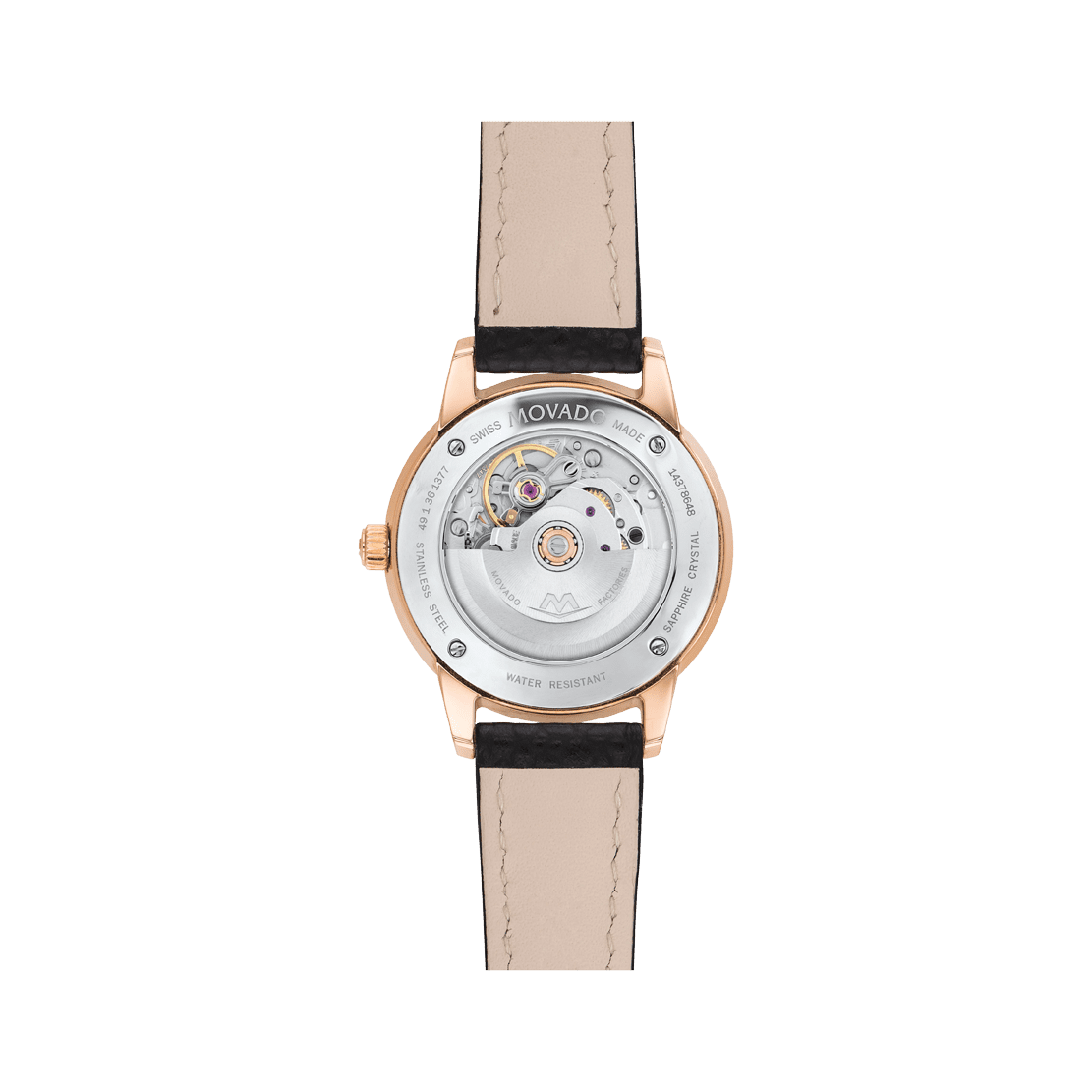 Movado 1881 Automatic, 30 mm rose gold PVD-finished stainless steel case with black textured dial and black calfskin leather strap. Caseback features an exposed automatic movement.