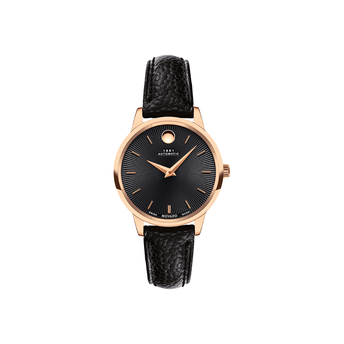 Movado 1881 Automatic, 30 mm rose gold PVD-finished stainless steel case with black textured dial and black calfskin leather strap. Caseback features an exposed automatic movement. Automatic watches do not contain batteries. They are charged by the movement of your wrist. If the watch is not worn it will stop...