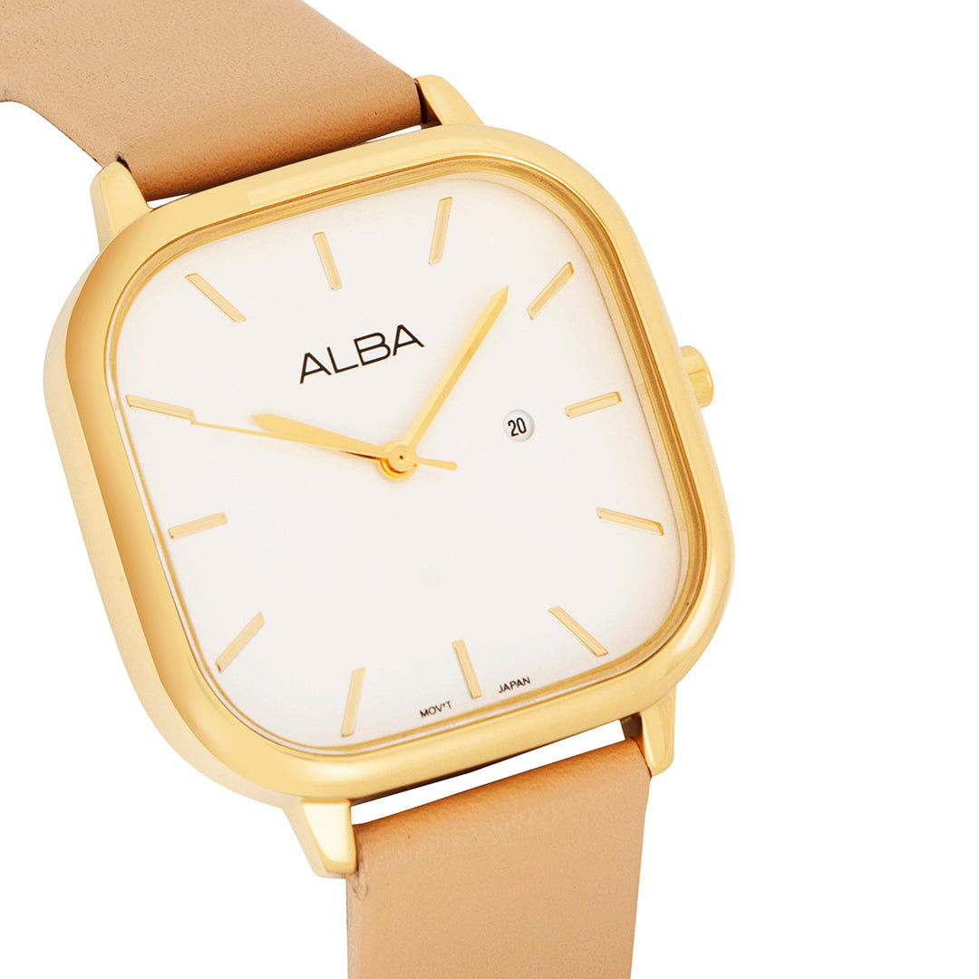 L/G: Women's Movement : Quartz Material : Stainless Steel Case Size: 32mm Glass: Mineral crystal Band : Genuine Leather Water Resistant: 5 Bar Date : Date Movement Calibre : VJ22