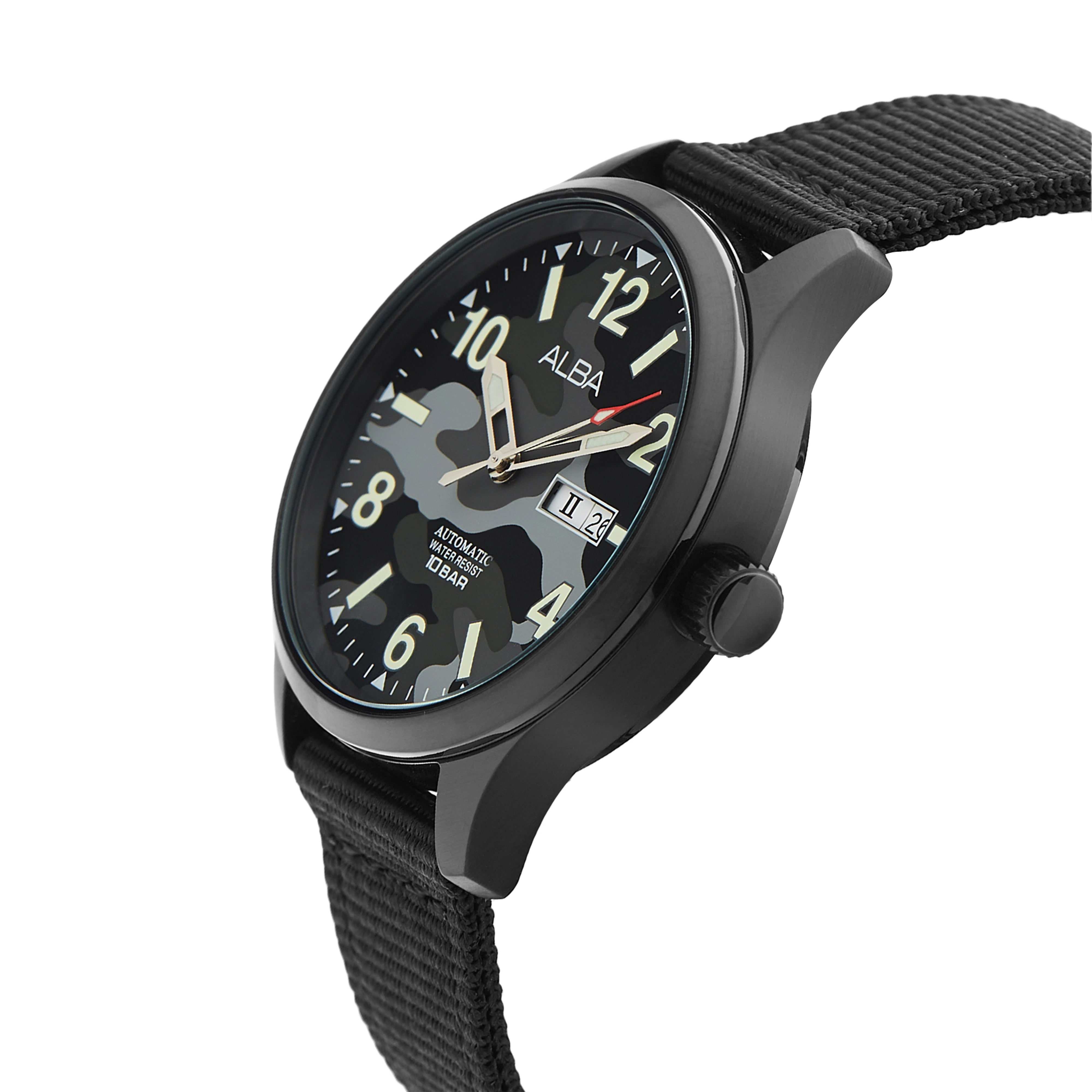 L/G: Men's Dial: Black/Grey Date: Day, date Movement: Mechanical Water Resistant: 10 Bar Material: Stainless steel case and screw see-through case back Band: Nylon Glass: Mineral crystal Case Size: 42mm Luminous: Luminous Hands & Markers Movement: Y676