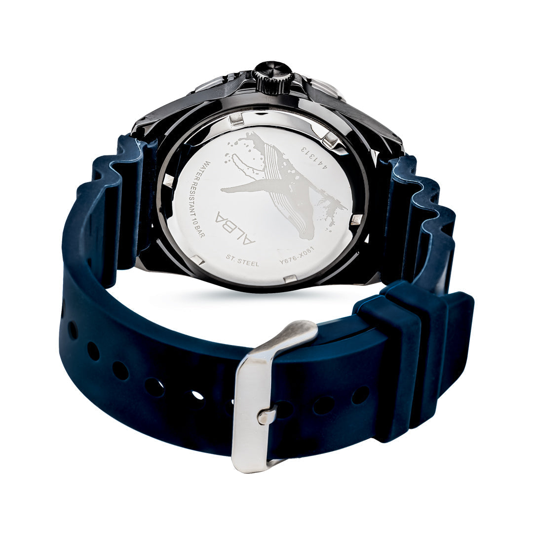 L/G: Men's Dial: Black & Blue Date: Day, date Water Resistant: 10 Bar Material: Stainless steel Case back: Screw case back Band: Silicon Glass: Mineral crystal Bezel: Rotating Bezel Case Size: 43mm Luminous: Luminous Hands & Markers Movement: Y676