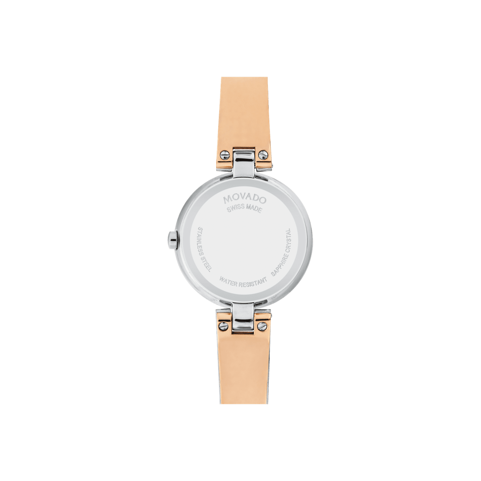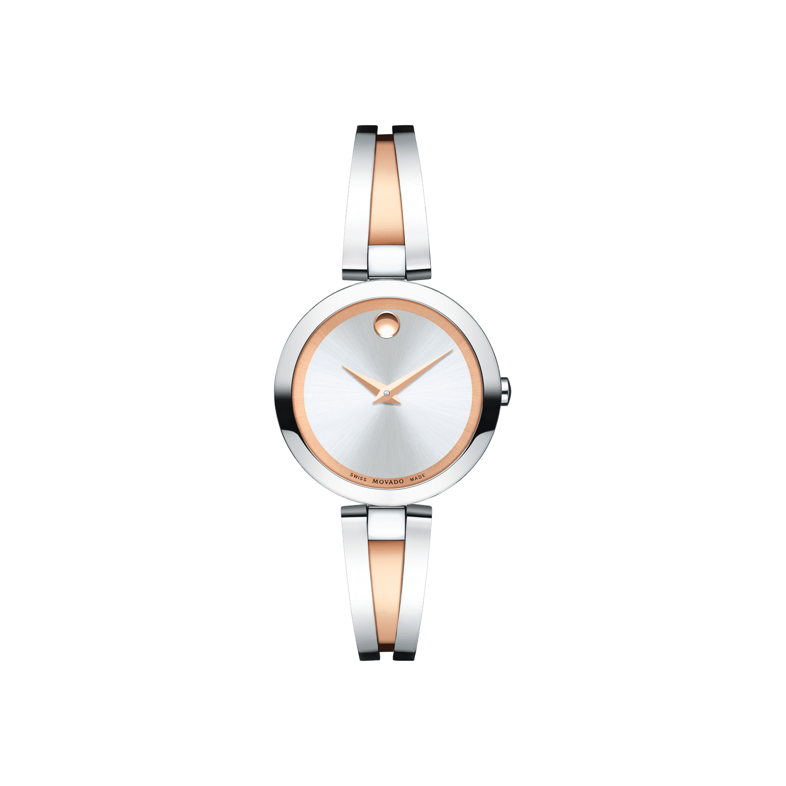 Movado Aleena, 27 mm stainless steel case and rose gold PVD-finished bangle-style bracelet with a stainless steel dial and rose gold PVD-finished inner circle.
