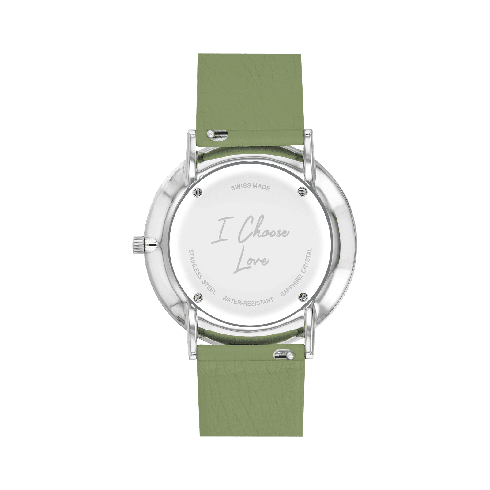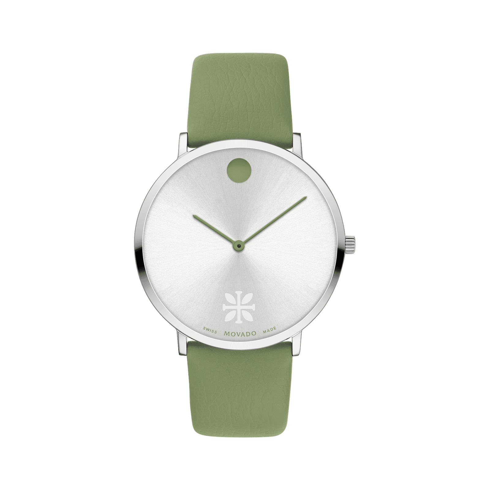 Limited Edition. Alexi x Movado, 40 mm stainless steel case with an engraved earth symbol on dial representing one of the four doorways to veganism. Featured on a fern green 100% vegan strap including a special caseback engraved with one of Alexi Lubomirski's life mottos. Packaging is made out of...