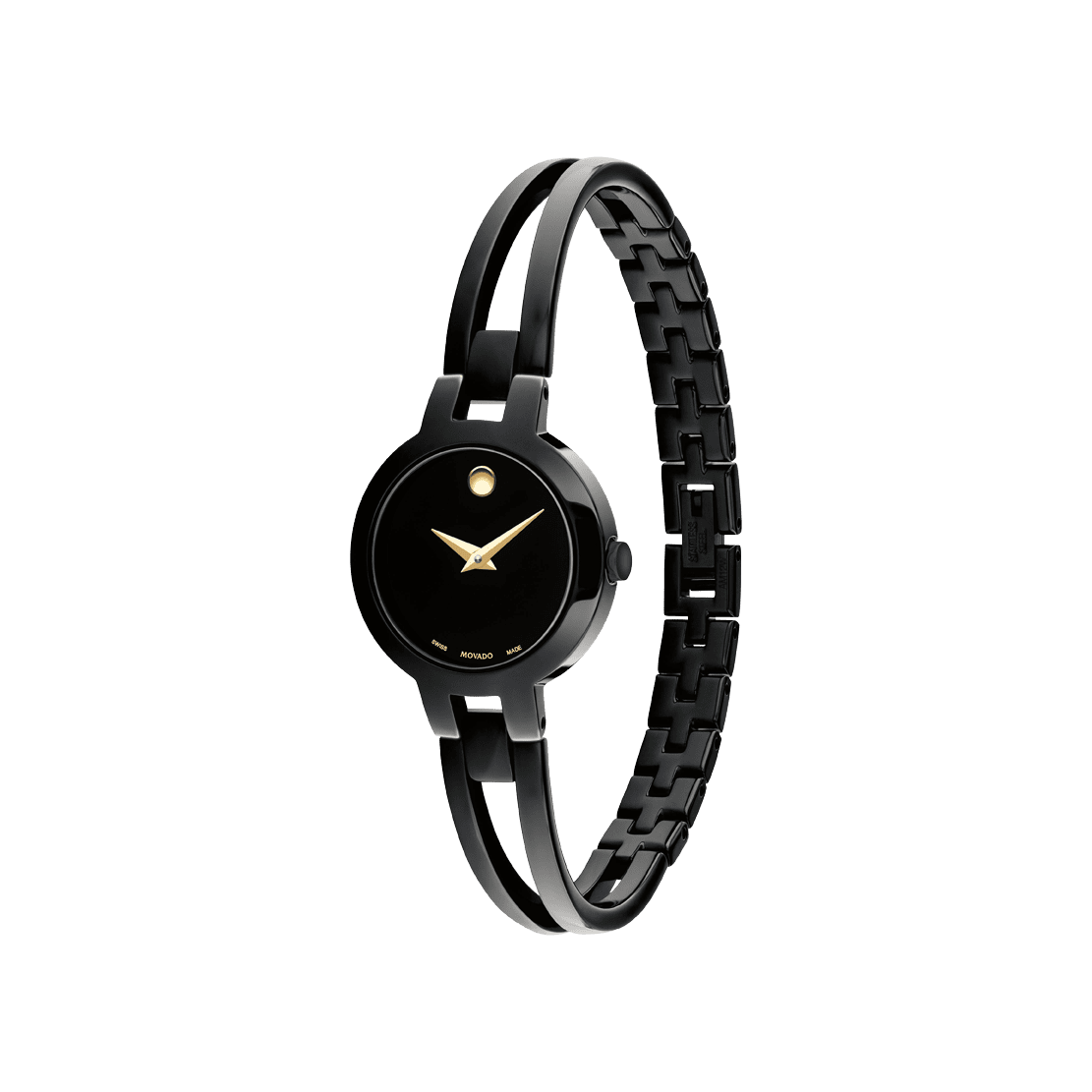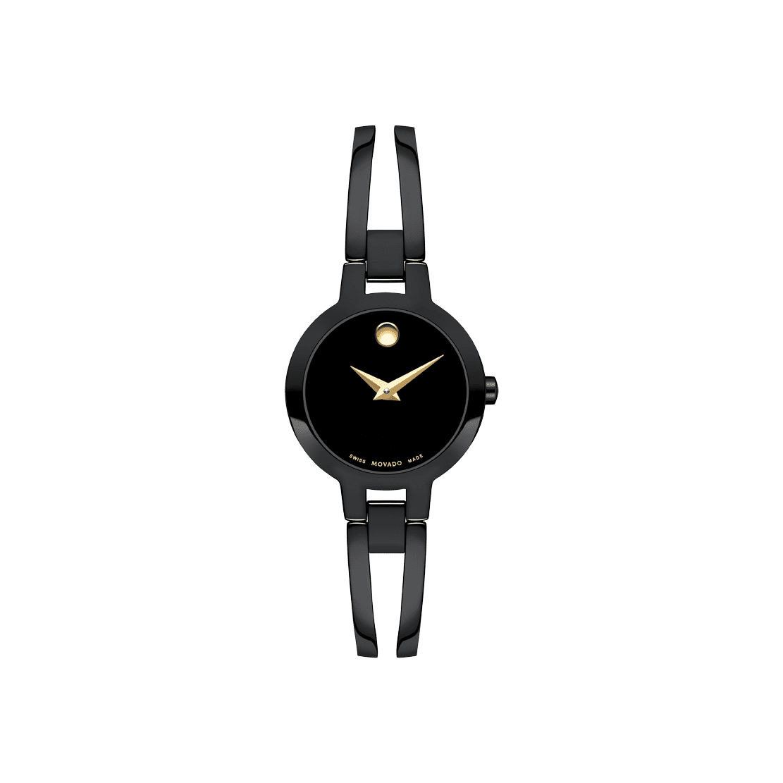 Modern elegance with a sleekly sculpted silhouette. We’ve paired our iconic Museum Dial to a slender jewelry-inspired bangle watch to create an effortlessly chic essential. This timepiece is crafted from black PVD and features a petite 24mm case, gleaming yellow gold-toned accents, a double-bar bangle bracelet with back sizing links and a jewelry clasp closure.