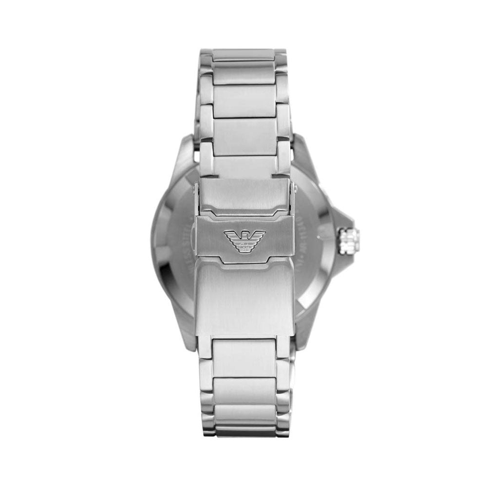 The Diver from Emporio Armani is a timepiece for the new age dandy man who not only demands craftsmanship but also a refined aesthetic. A blue bezel and sunray dial creates a brilliant contrast with the silver toned stainless steel bracelet and silver indices. This 42 mm analogue watch also...