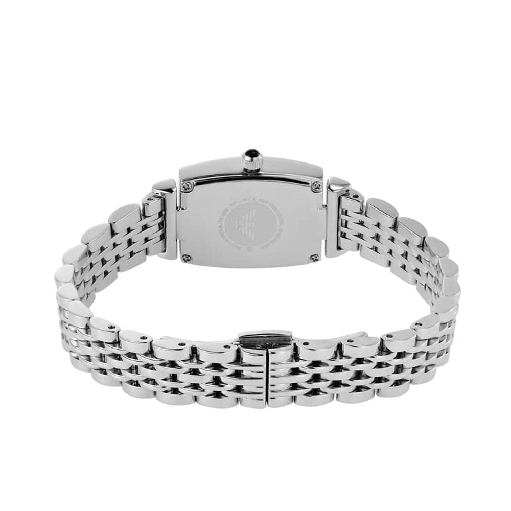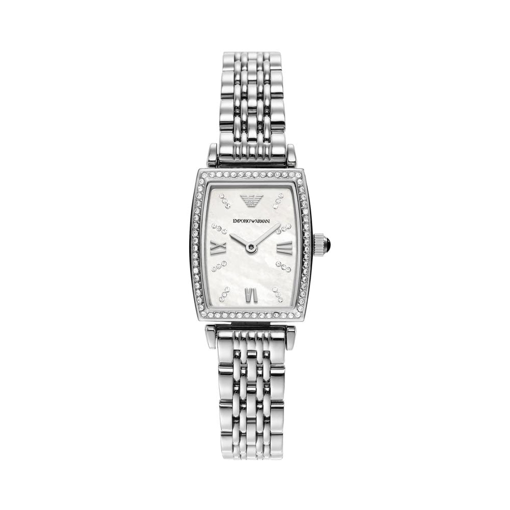 Emporio Armani's 26mm watch features a white sunray dial, glitz indexes with Roman numerals, two-hand movement and stainless steel bracelet.