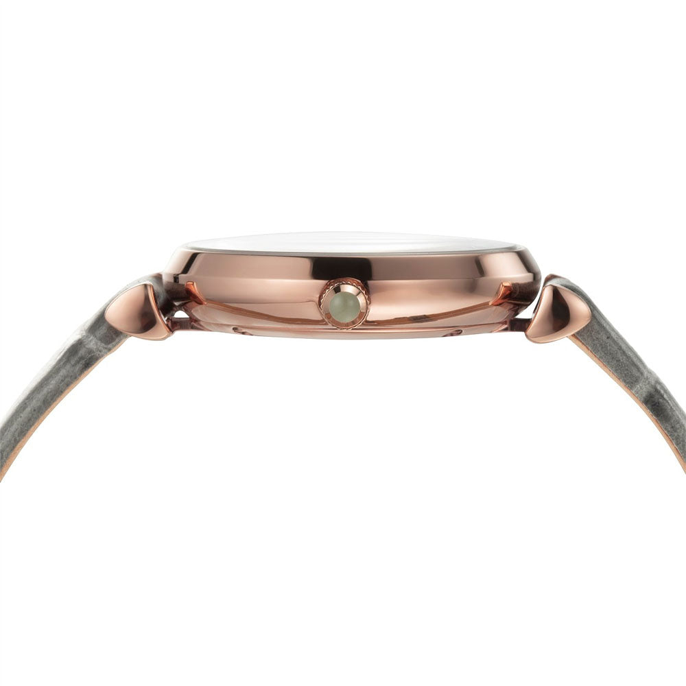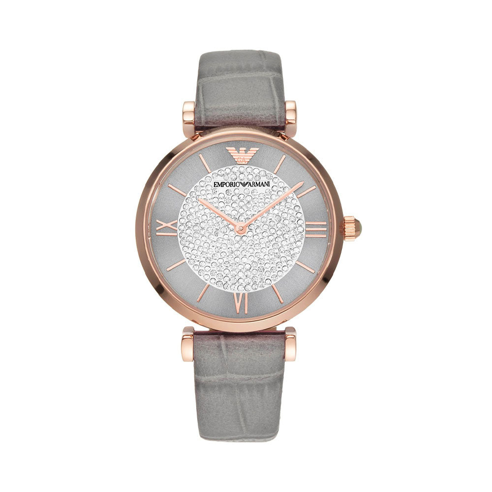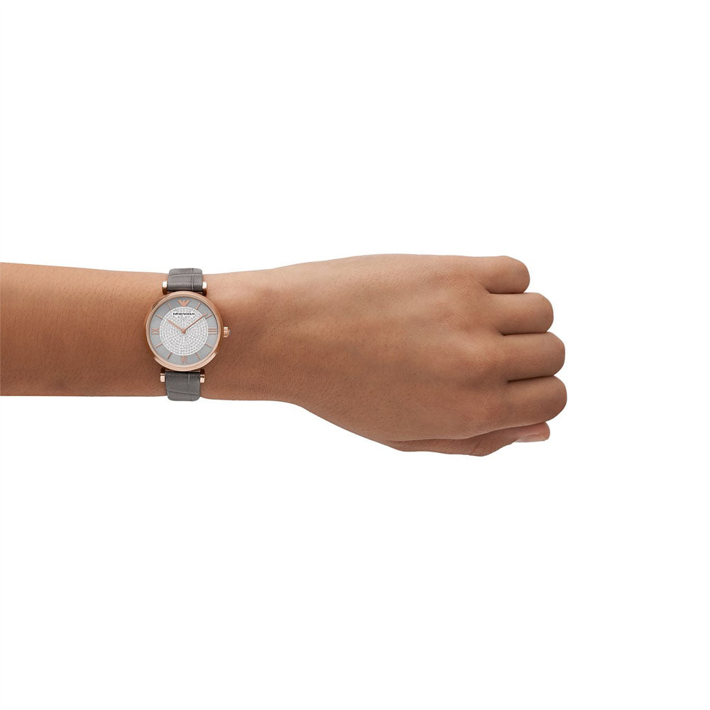 Go to the shopAR11502 Emporio Armani's 32mm watch features a sunray gray dial with full pavè, at least 50% recycled stainless steel case, two-hand movement and gray leather.