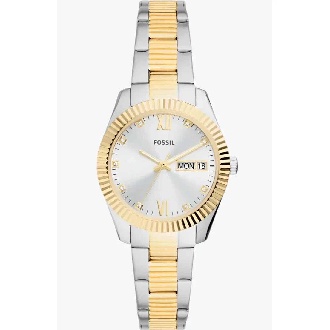 This Fossil women's watch set includes a 32mm Scarlette watch with a silver sunray dial and three-hand day-date movement. The two-tone stainless steel bracelet and accompanying bangle offer a timeless and sophisticated look. Stay punctual and stylish with this elegant timepiece.