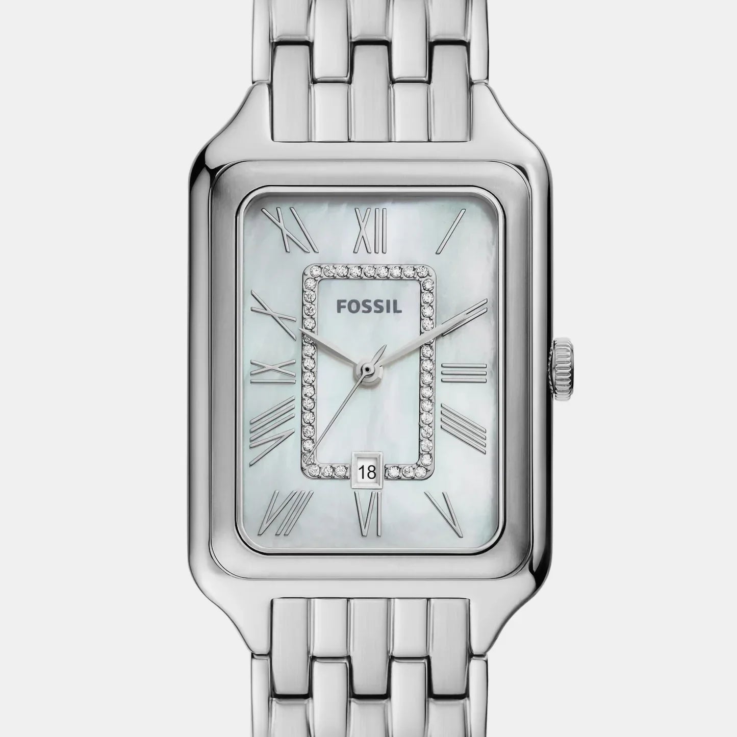 Experience timeless elegance with the Fossil Women's Watch. The 26mm rectangular case and silver dial offer a sleek and classic design, while the quartz movement ensures accurate timekeeping. The 14mm silver leather strap provides comfort and style, and the 5 ATM water-resistance allows for worry-free wear. Made in the USA...