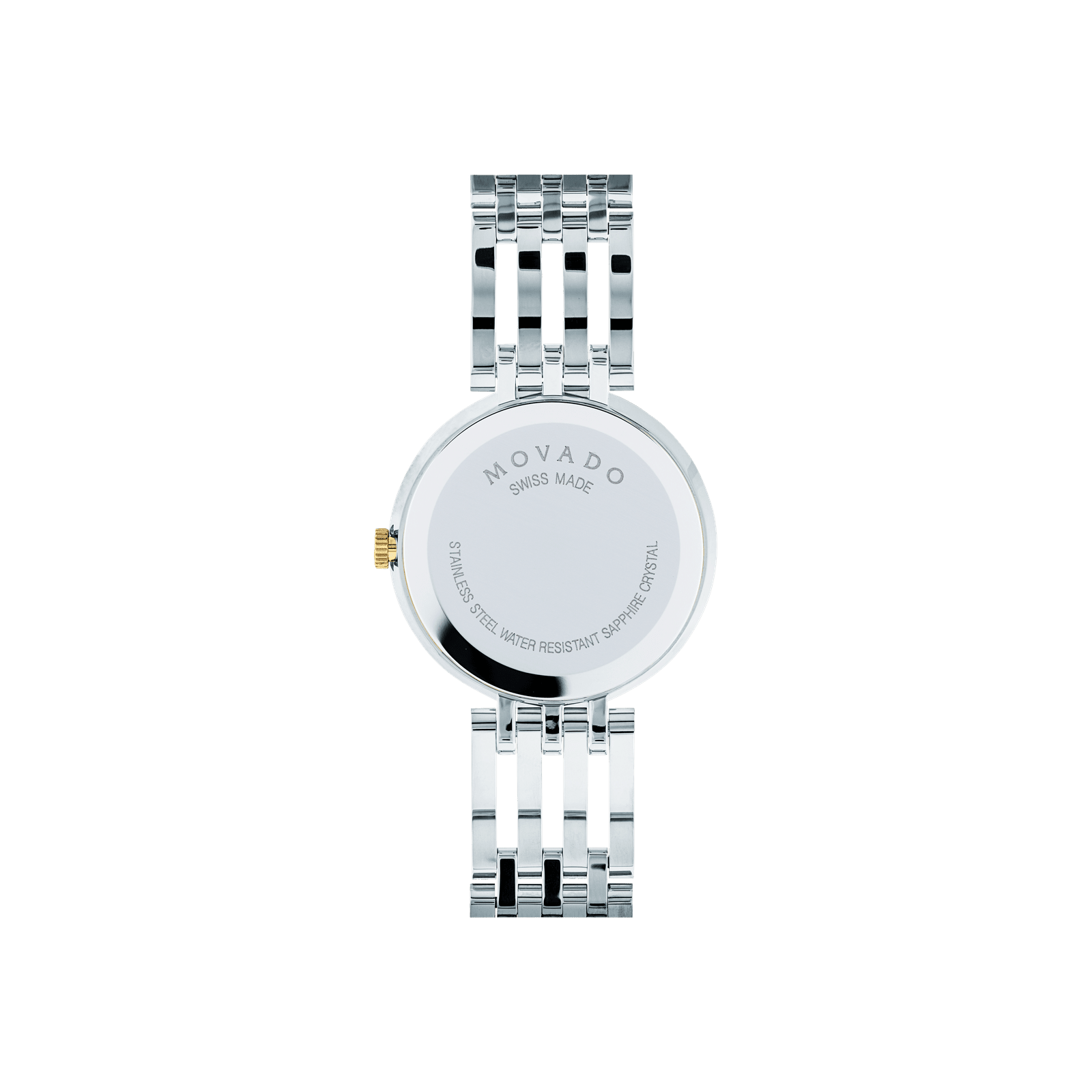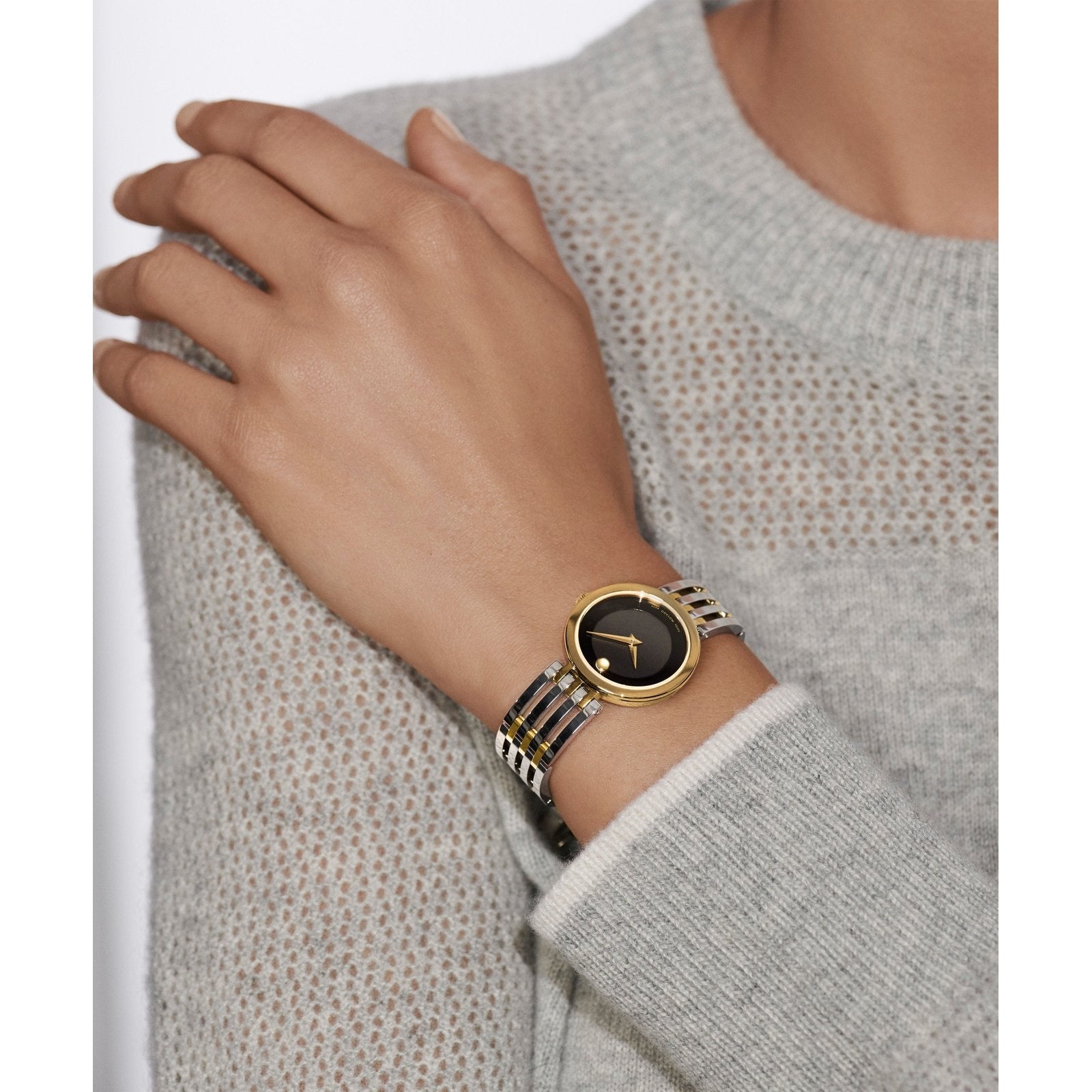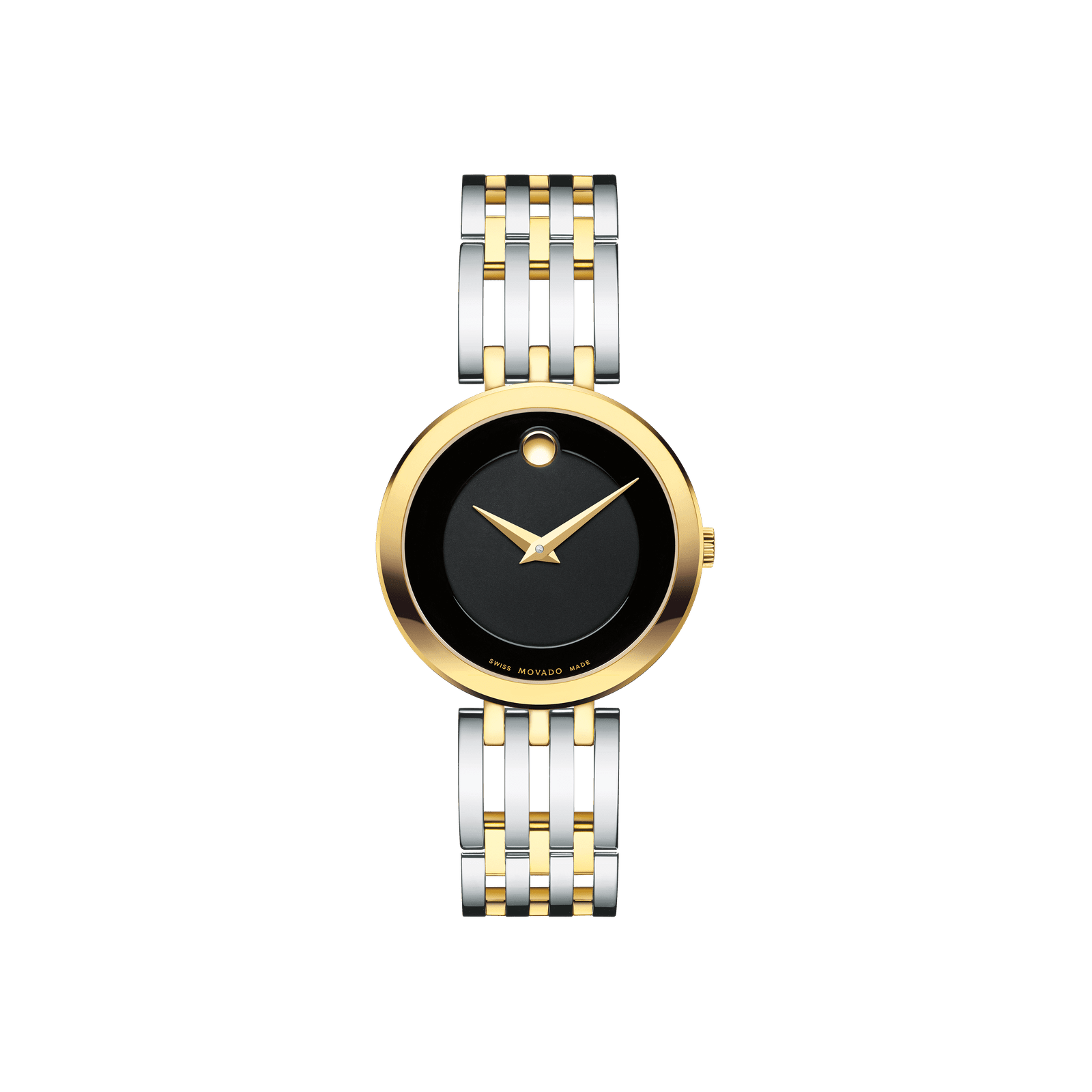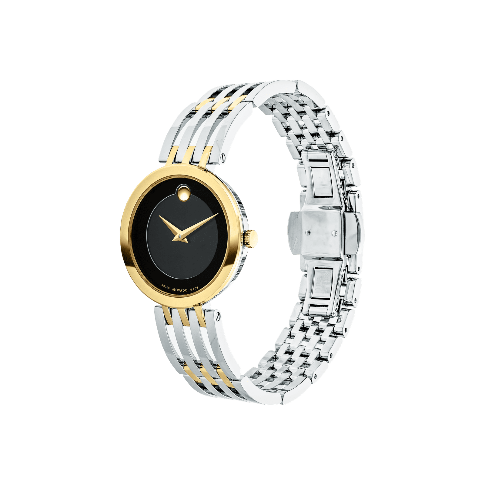 Go to the shopMovado Esperanza, 28 mm stainless steel and yellow gold PVD-finished case and free-falling bracelet design with matte black Museum dial.