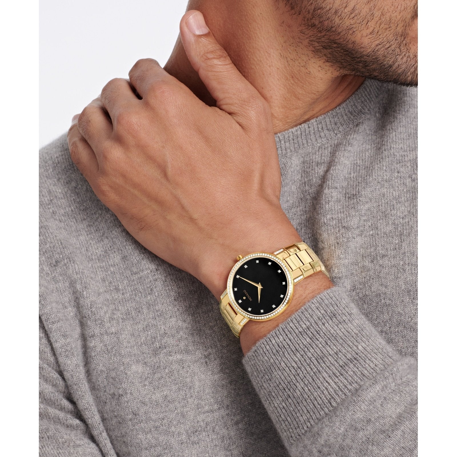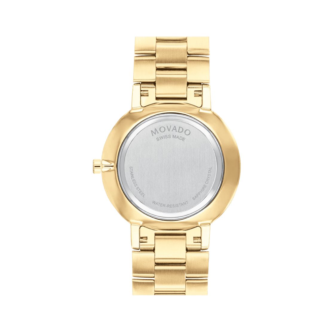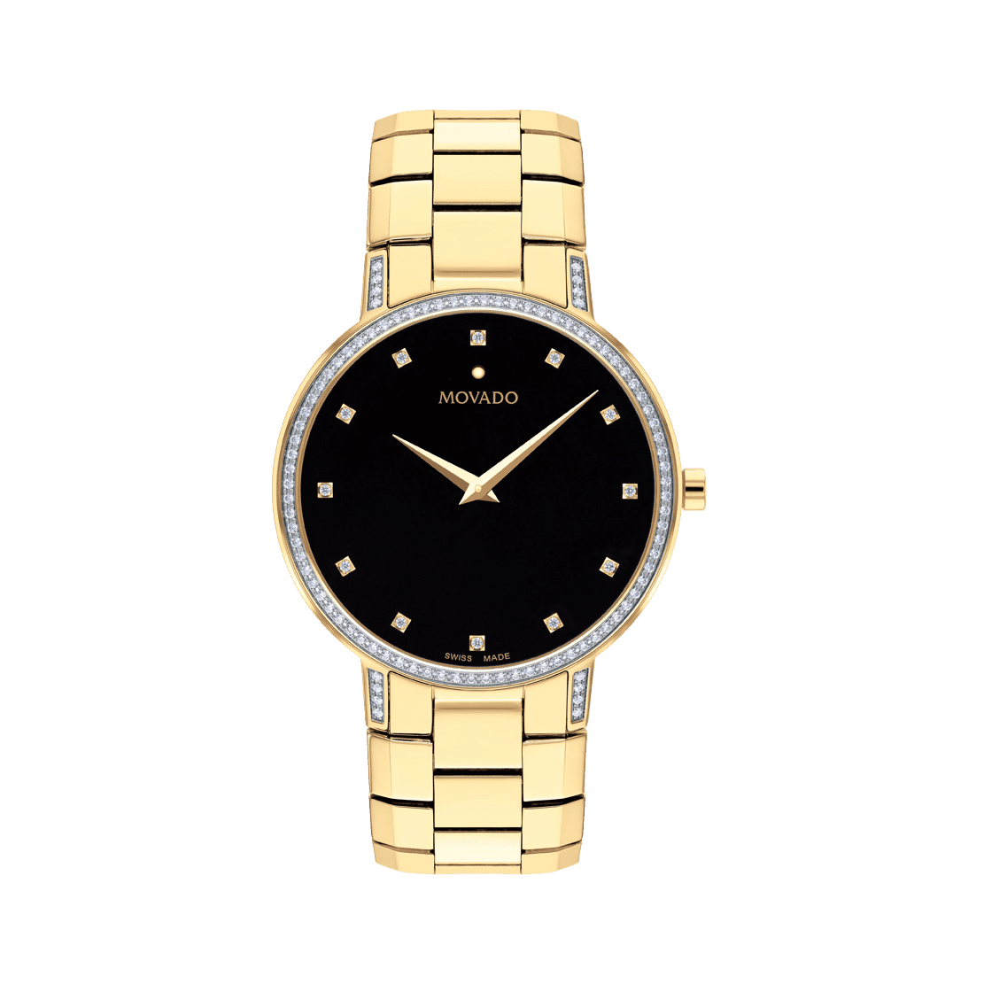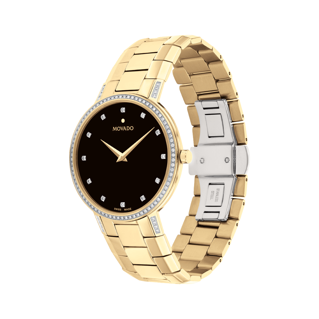 Movado Faceto, 39mm yellow gold PVD-finished stainless steel case and bracelet with diamond set lugs. Features a black dial with 12 diamond markers & diamond set bezel.
