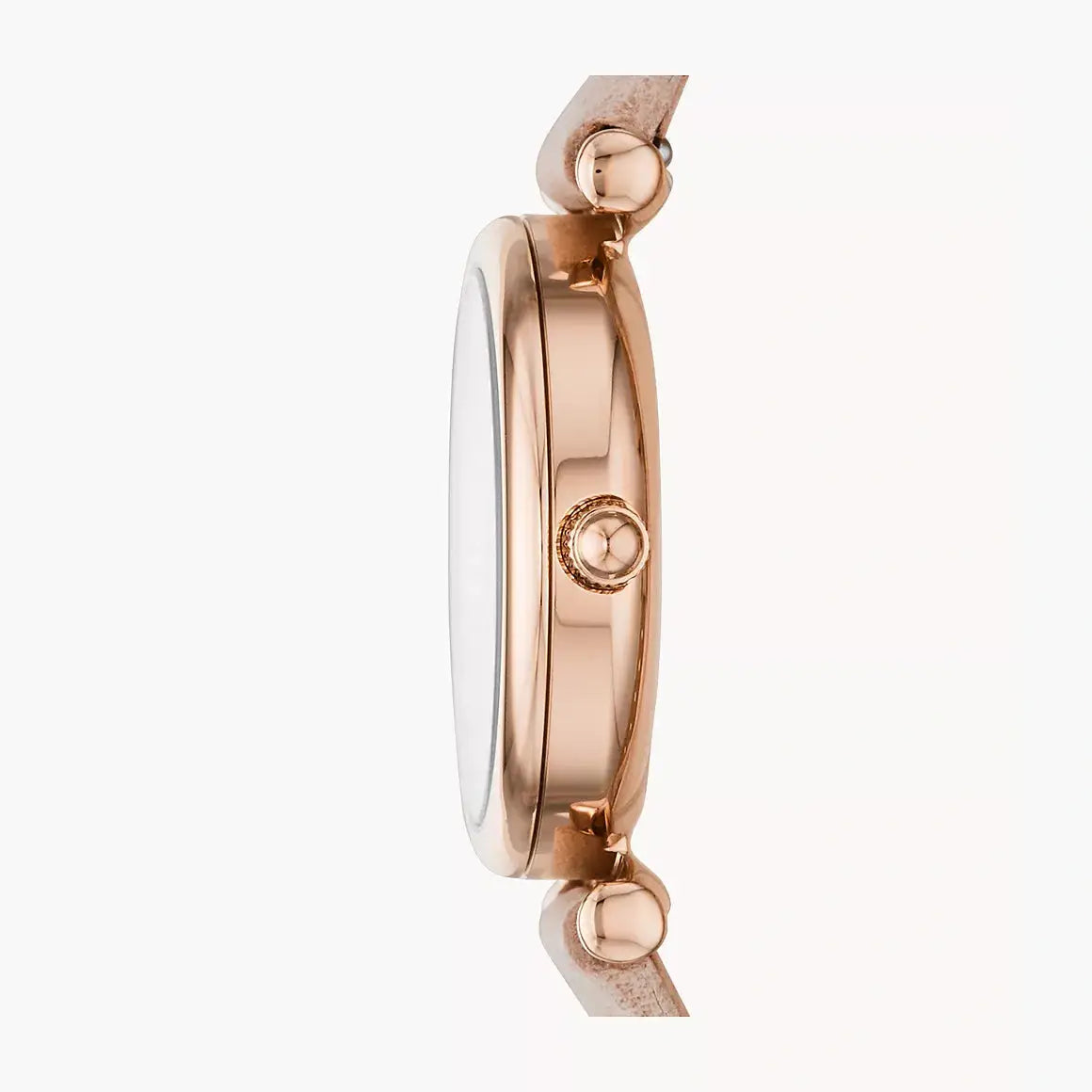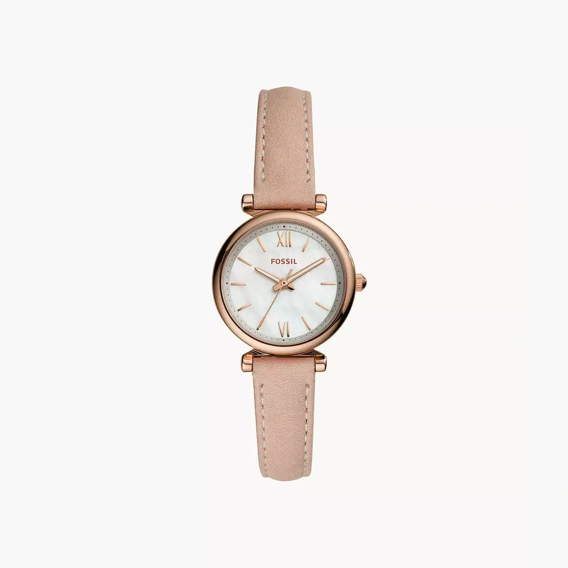 Go to the shopThis 28-mm Carlie Mini features a white mother-of-pearl dial with Roman numeral and stick indices, three-hand movement and a blush leather strap.