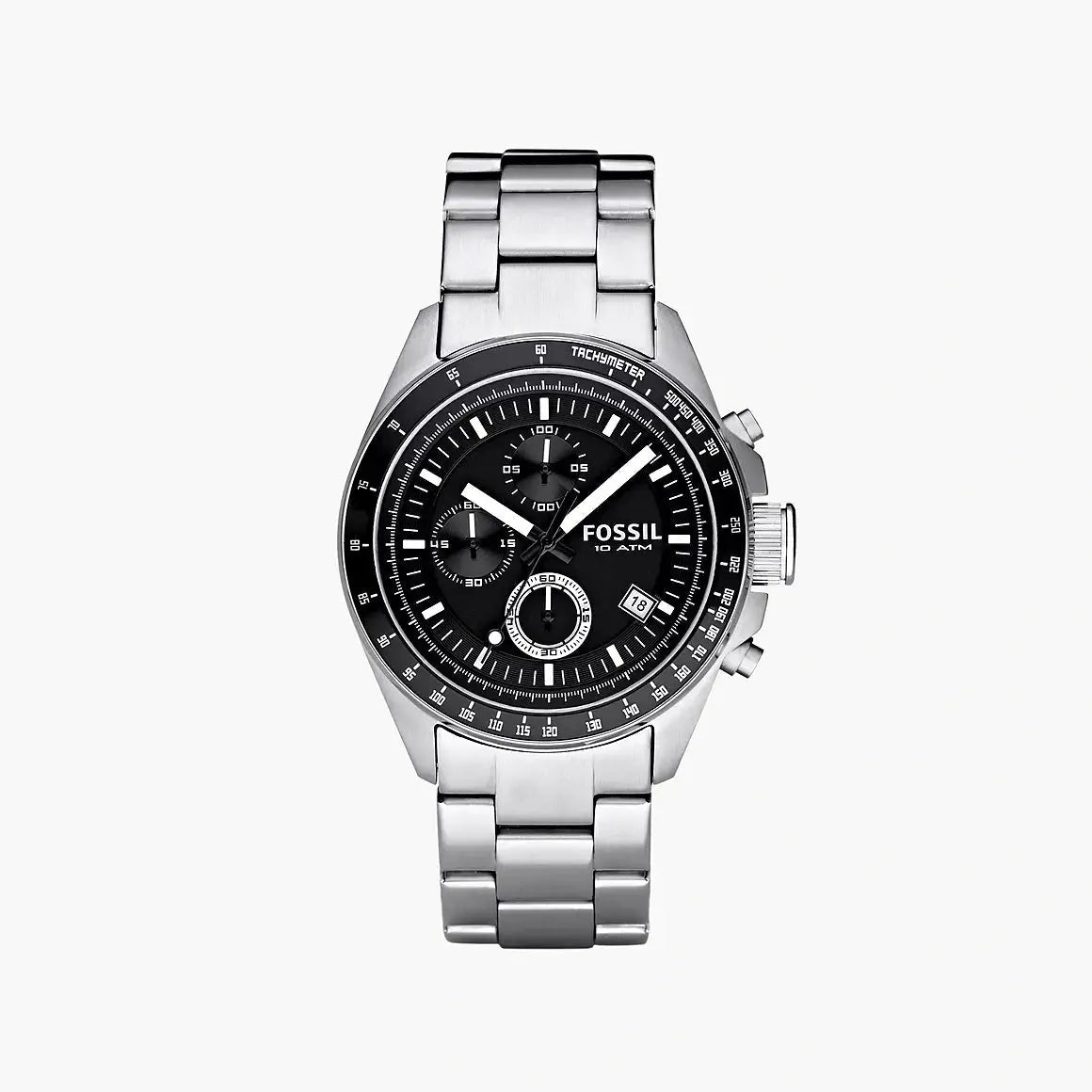 Our hardy Decker watch adds a bit of adventure to any look. The black chronograph dial (with lum indexes) sits inside of a stainless steel case. To add texture, the bracelet has both brushed and shiny stainless steel.