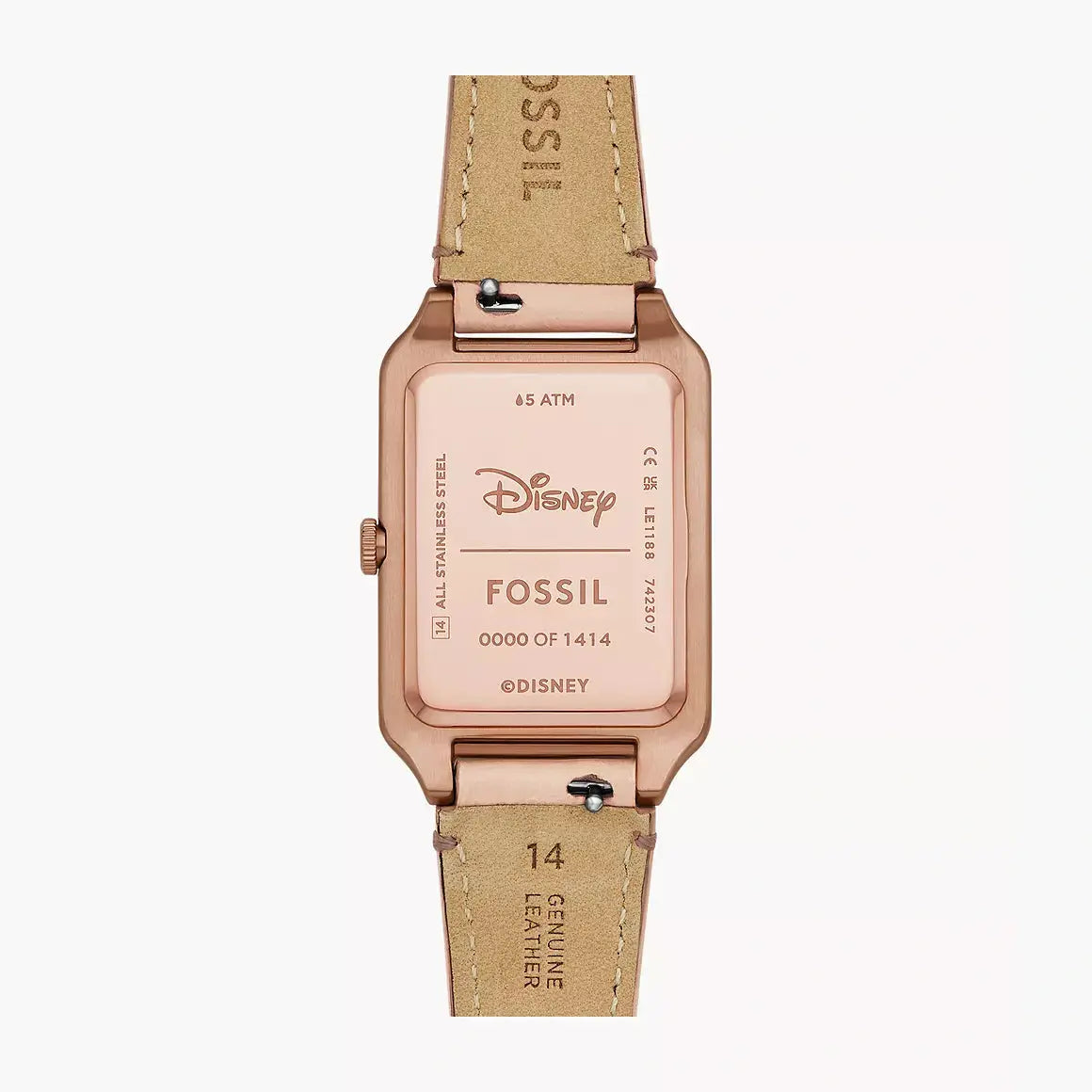 Find the wonder in every moment with the Disney Fossil collection. This limited-edition take on our classic Raquel watch features Disney’s most iconic couple, a rose gold-tone rectangular case and blush LiteHide™ leather strap.