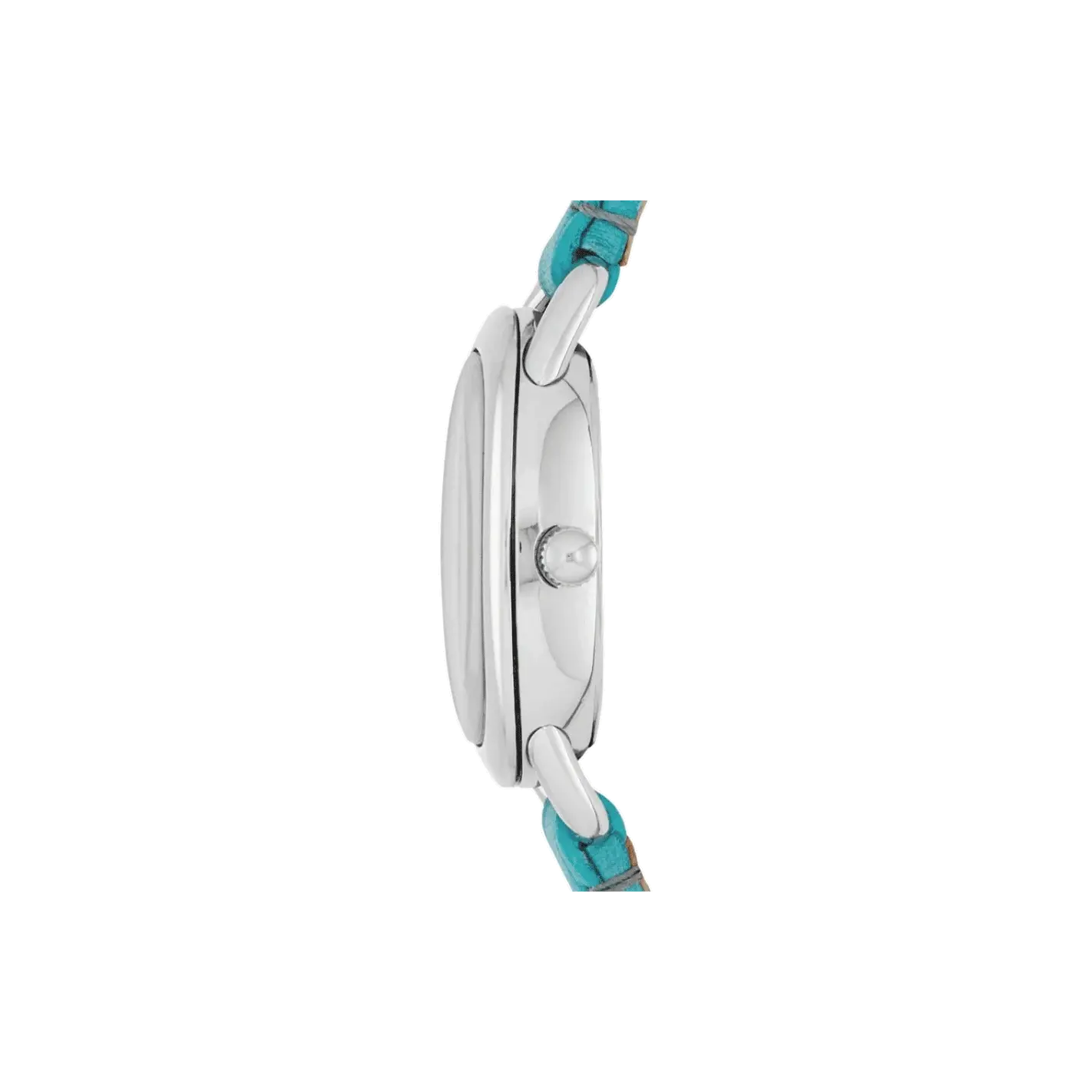 If you plan on making your presence felt, wear this minimalistically modern women's analog watch from the House of Fossil. This stack-worthy Sculptor watch features a subtly shaped case with a blue leather strap. It is surely going to leave its subject in awe with its design and performance when you'll pair it up with it's coordinating bracelet.