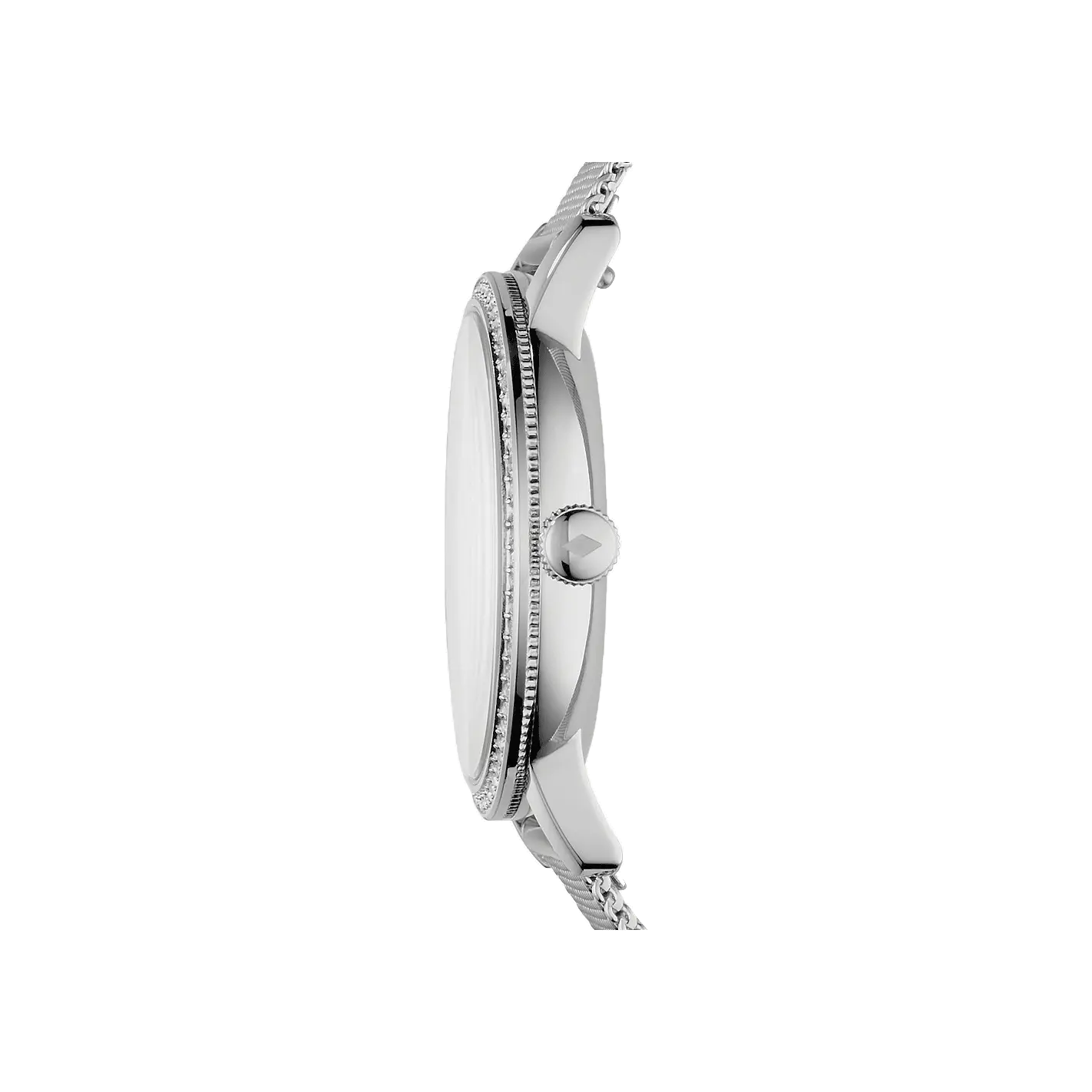 Very few watches have the potential to captivate you in the very first glance. This Neely features a mother of pearl dial with a crystal embellished accents at all hour and three lum hand movements. This watch is encased in a silver case with a silver mesh bracelet which is secured with a safety mesh buckle. This watch is completed by a dainty silver tone pave charm. Adorn your wrist by wearing this timeless piece again and again.