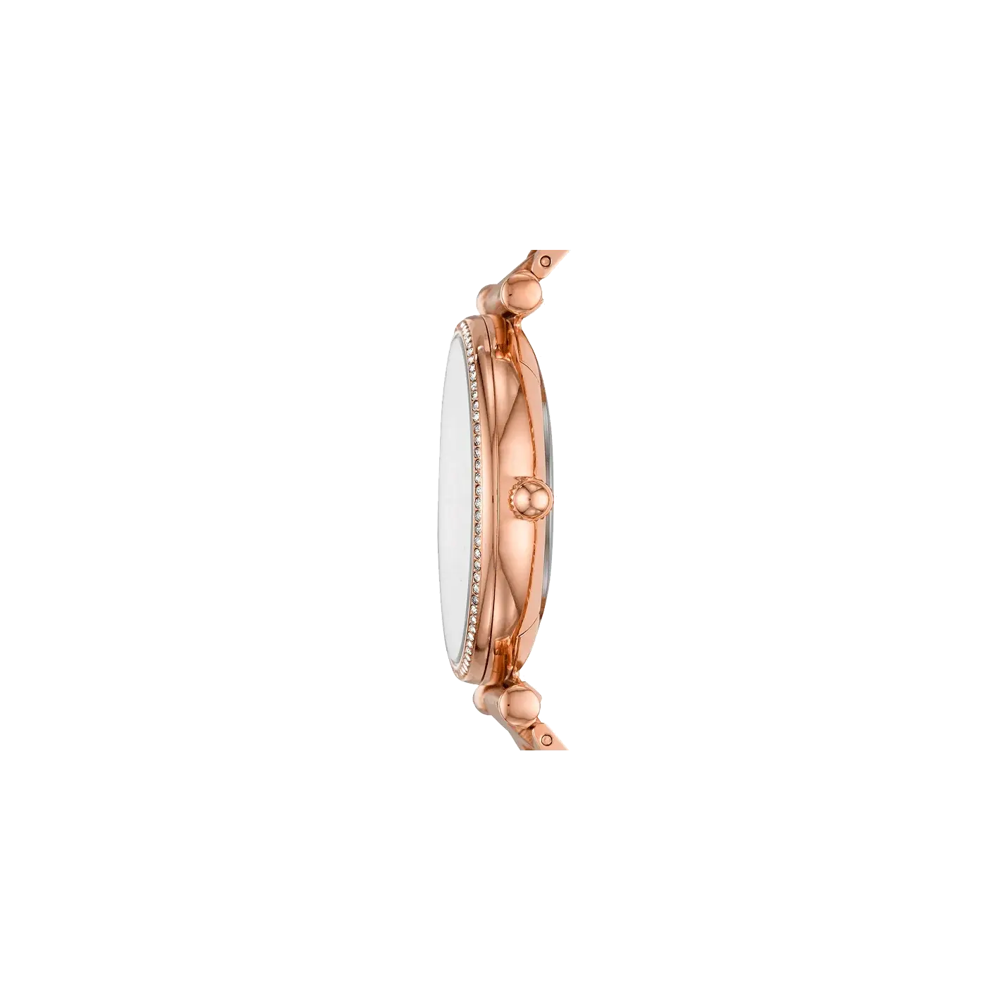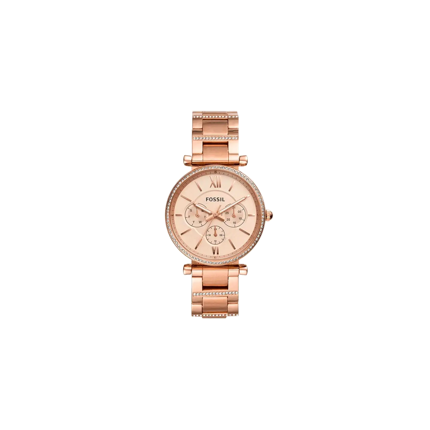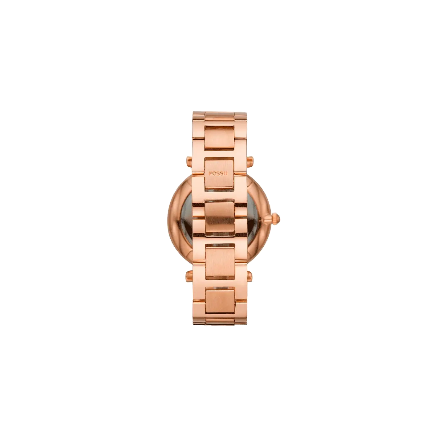 Minimalistically elegant, this women's multi-function watch from the House of Fossil makes a perfect choice for everyday wear. The Carlie series takes a turn for the sophisticated, incorporating a rich rose-gold pave embellished H-link bracelet, a sleek stainless steel case and a rose-gold multi-function dial with three lum hand movement...