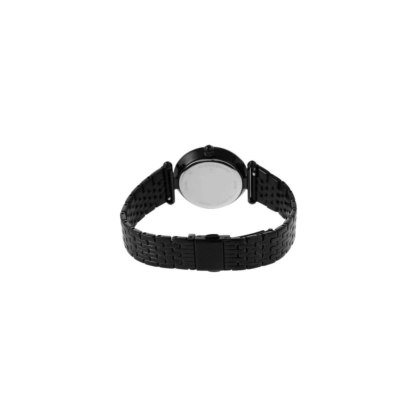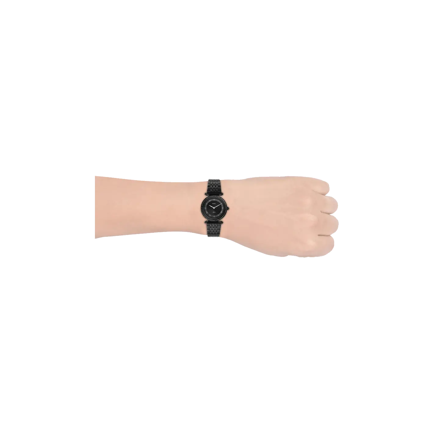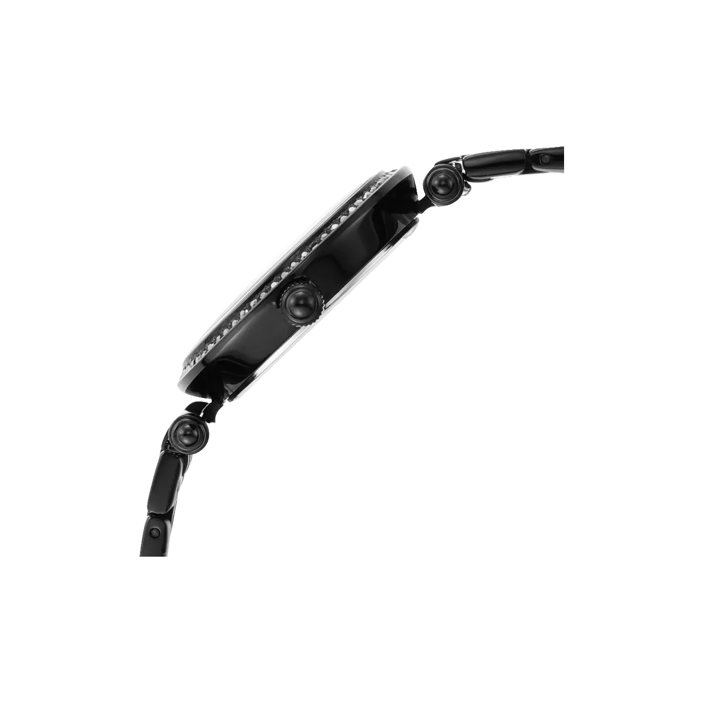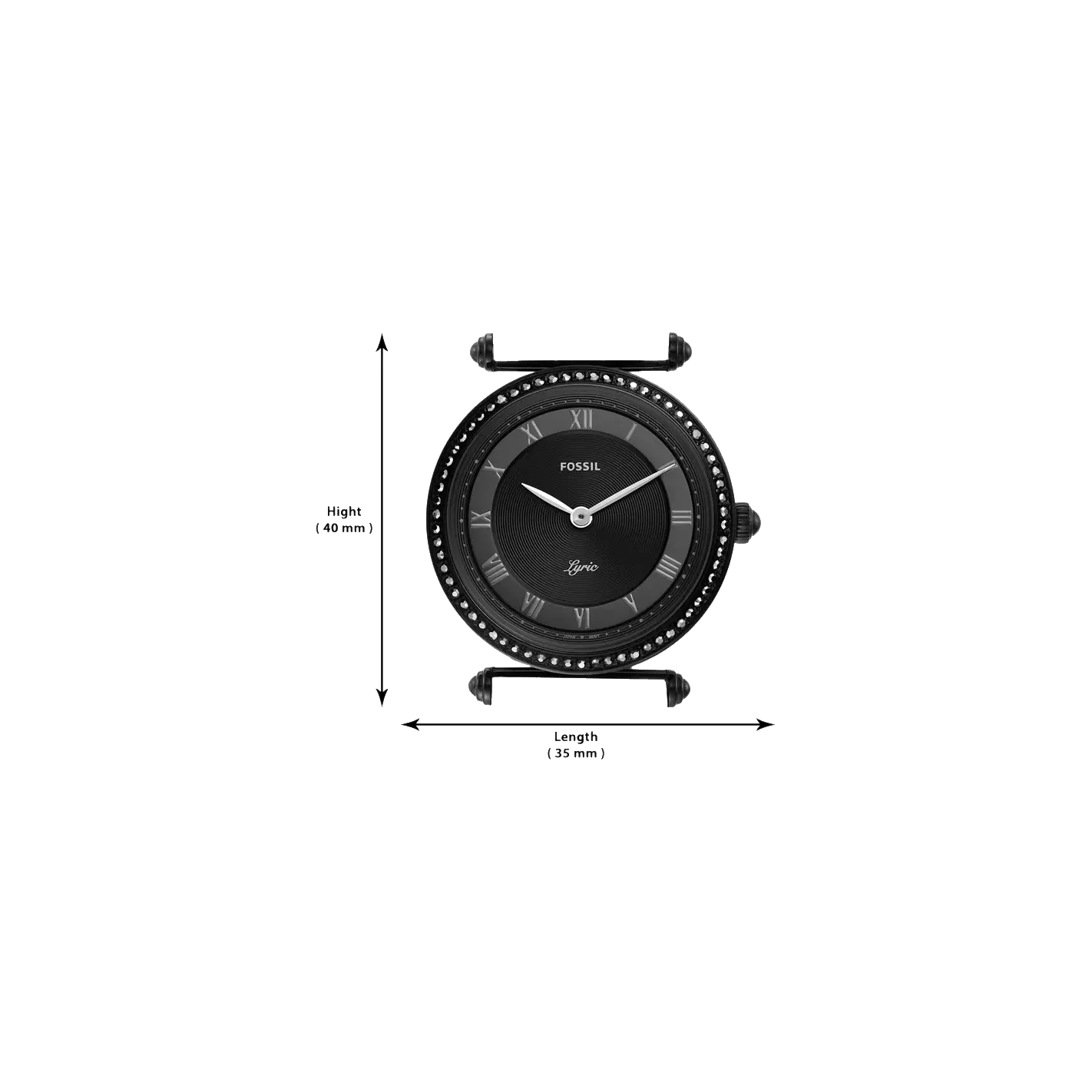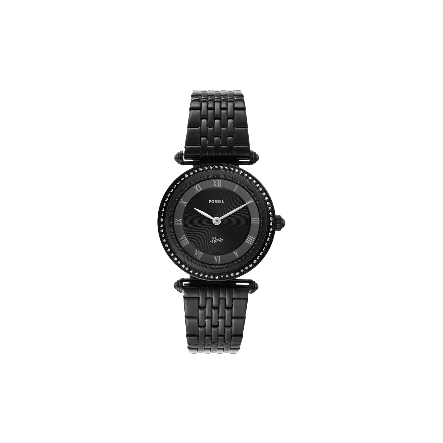 Make their heads turn while you walk with Fossil's Lyric black analog watch on your wrist. This chic timepiece is crafted with sparkling pavé stones bezel for an elegant, uptown sensibility. The stainless steel seven-link bracelet and round face accented with black CD finish make for a timeless design, while roman numeral adds a glamorous touch. Wear this feminine watch with everything in your closet, from a simple knit and jeans to a sexy cocktail dress.