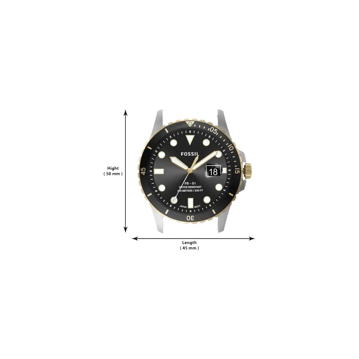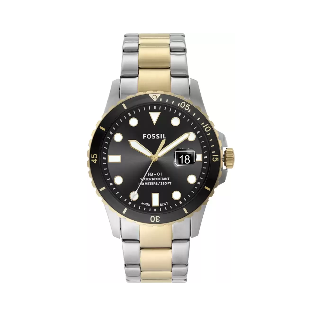 Effectively combining functionality and modern-day style, this men's analog watch from the Fb-01 collection by Fossil is a must-have timepiece. This electronic timekeeper features a quartz crystal that oscillates when current is applied to it. Its stainless steel strap vaunts combined shades of silver and gold that enhances the look of the watch. Encompassed in a 42 mm case, its black round dial displays plain three hands, hour markings at five-minute intervals, a date display window and a crown for time adjustment. Furthermore, it can be interchanged with 22 mm straps to customize your look.