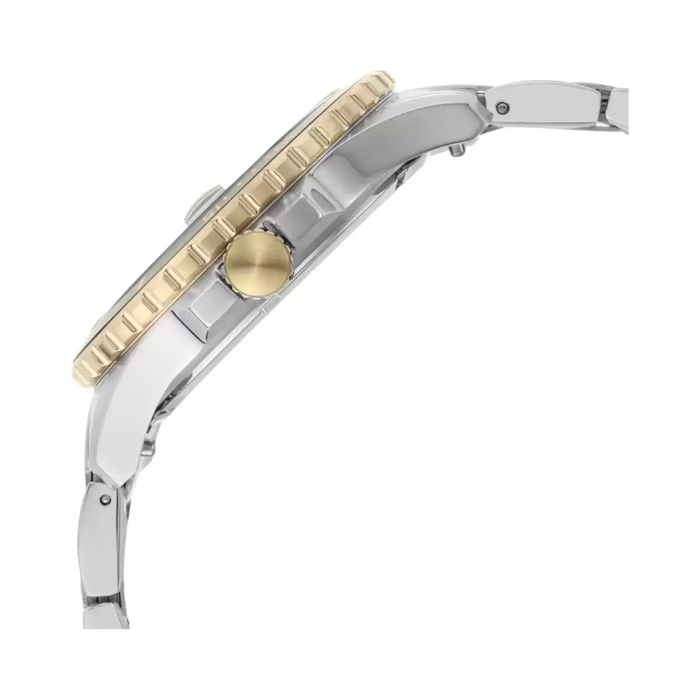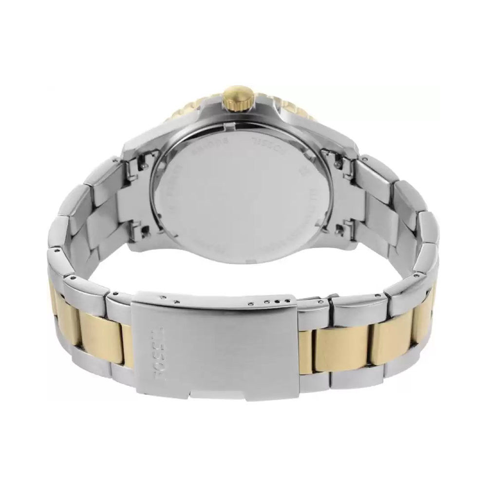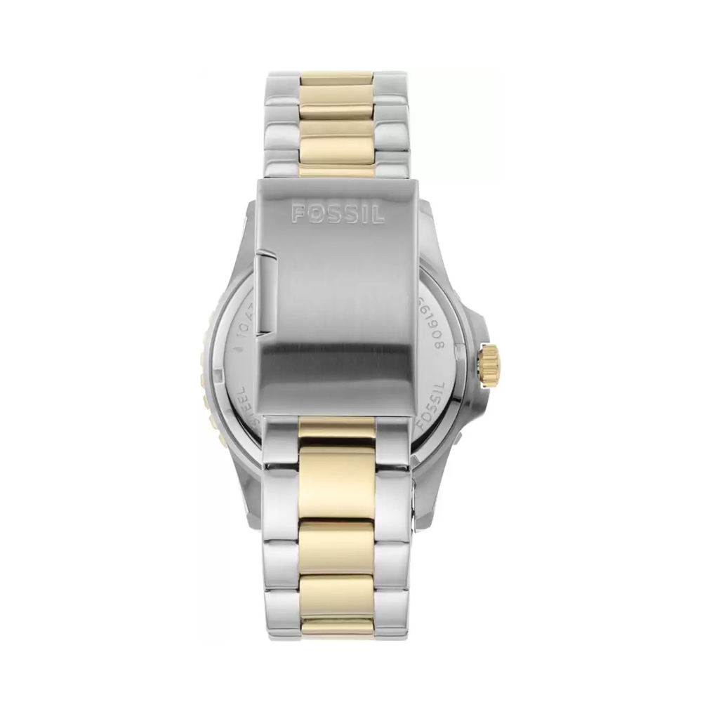 Effectively combining functionality and modern-day style, this men's analog watch from the Fb-01 collection by Fossil is a must-have timepiece. This electronic timekeeper features a quartz crystal that oscillates when current is applied to it. Its stainless steel strap vaunts combined shades of silver and gold that enhances the look...