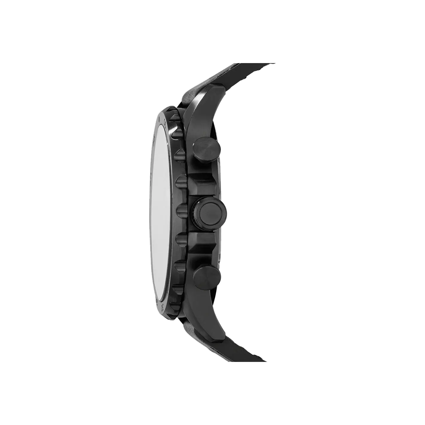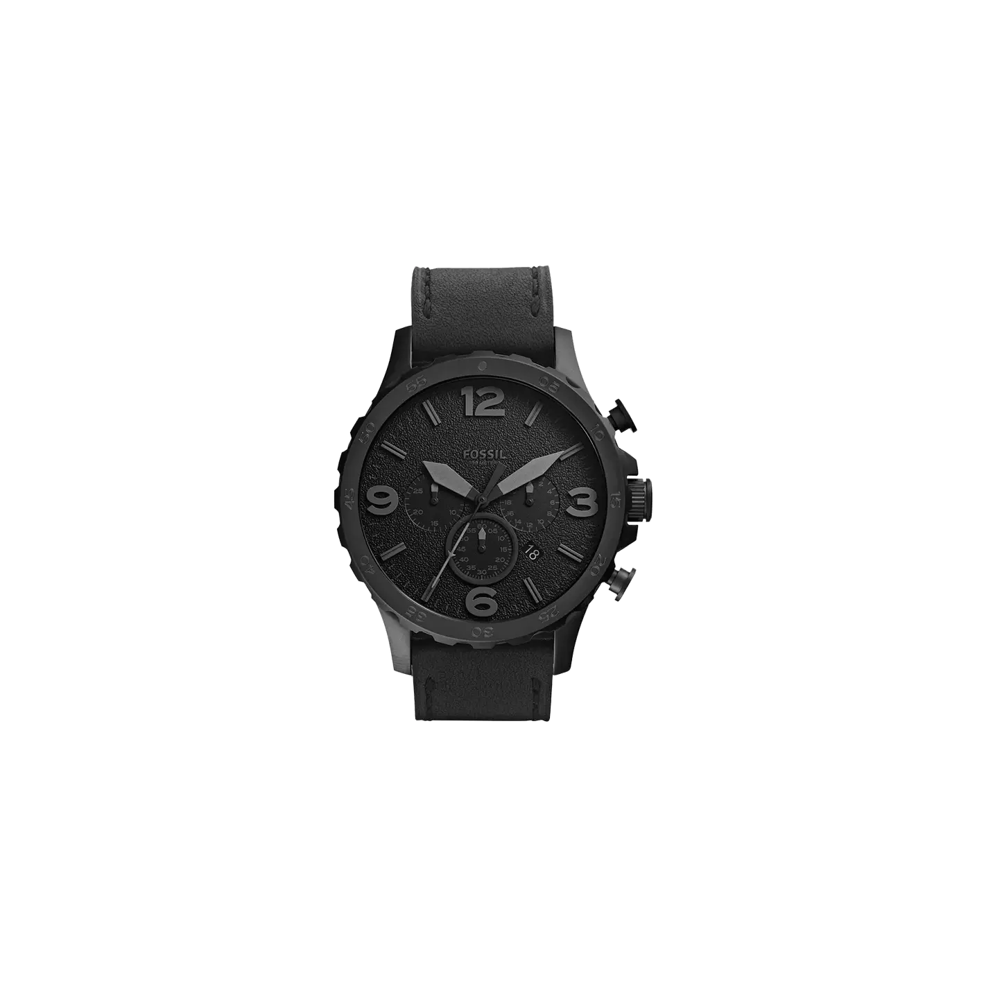 Aesthetically tasteful, this men's chronograph watch by Fossil. Add this military-inspired style to your wrist with our matte black stainless steel watch. A casual black leather strap and grey indices add instant polish to any look. This Nate watch also features a chronograph movement.lt