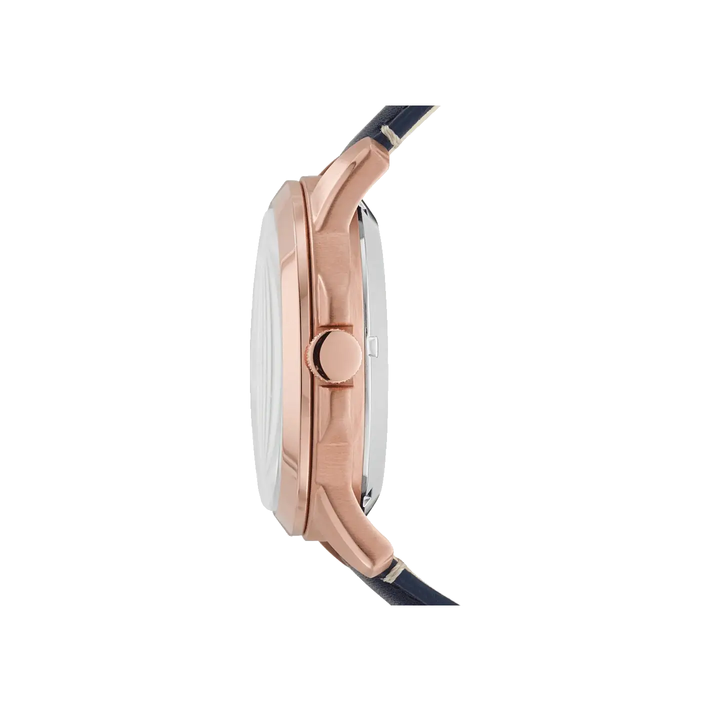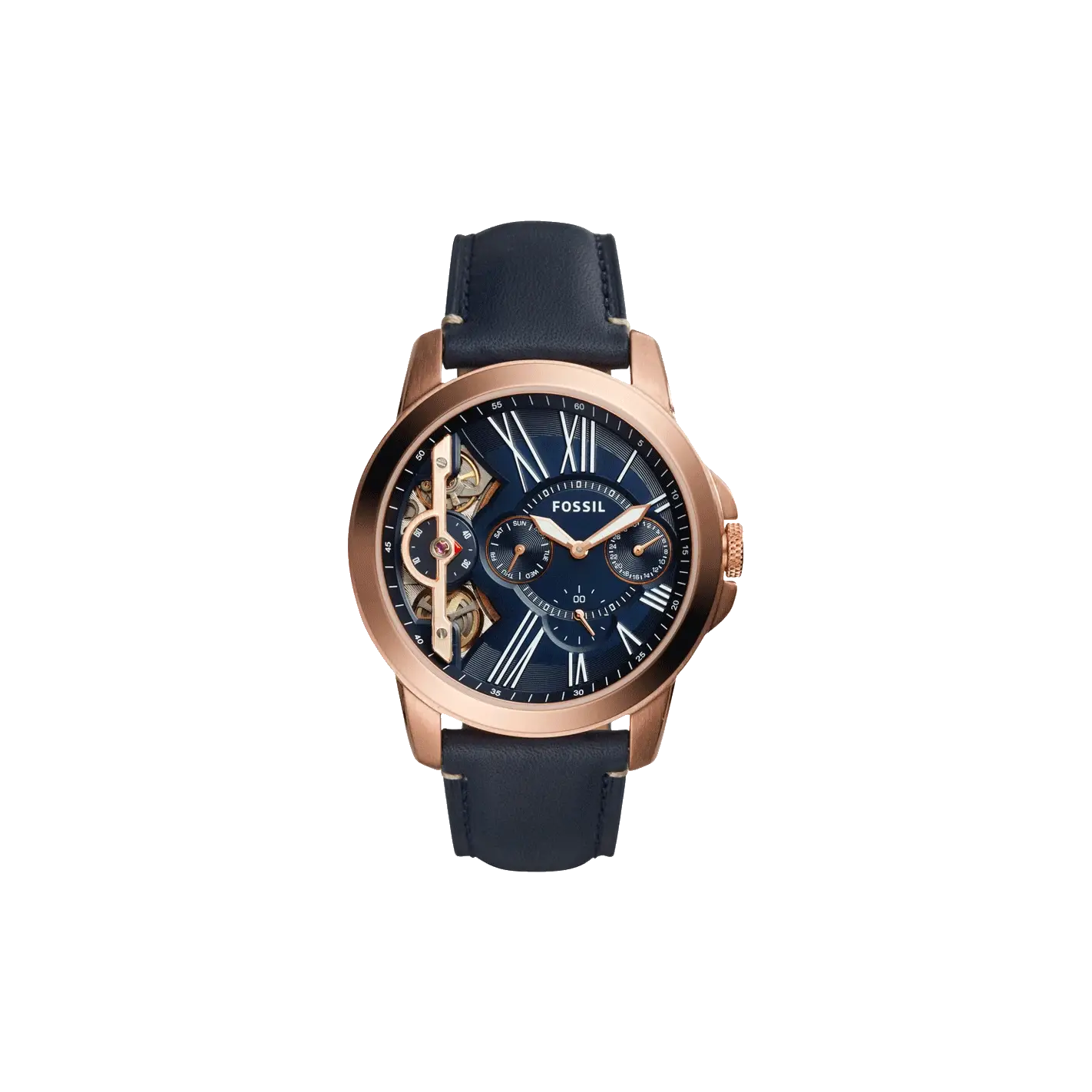 This men's analog watch by Fossil is an absolute stunner. The simple navy blue leather strap, with a buckle closure, ensures that the watch doesn't go overboard with the stunning details of the dial. Encased in a rose gold stainless steel case is a blue colored dial with three sub...