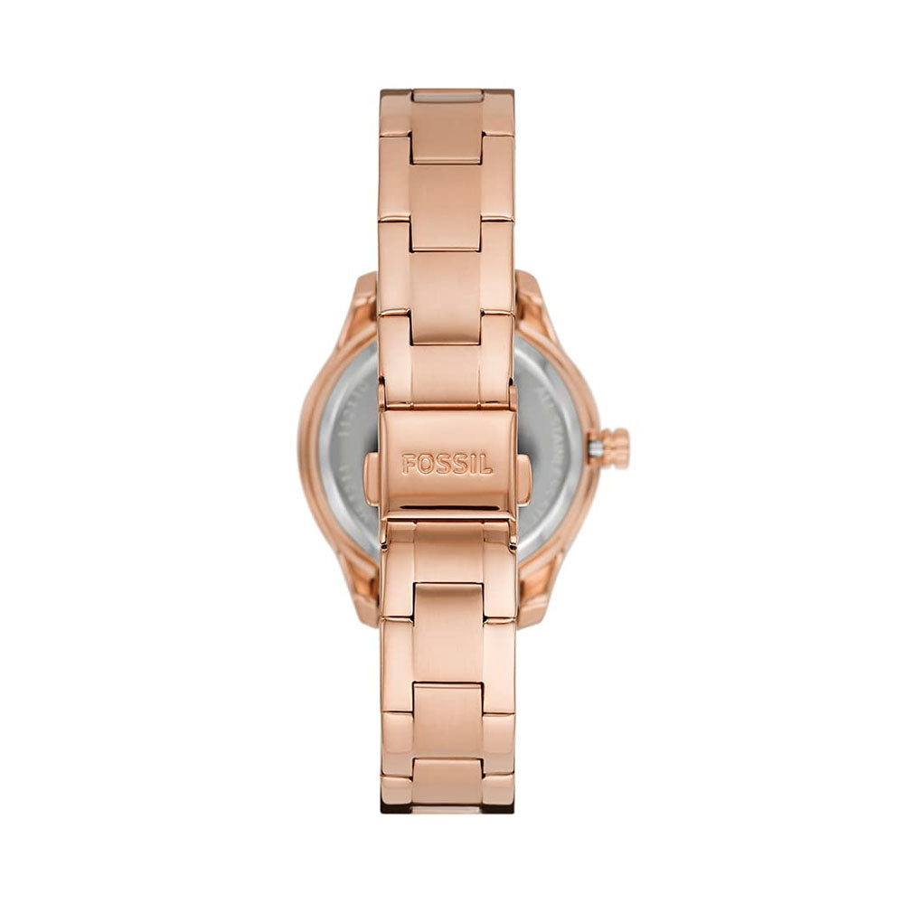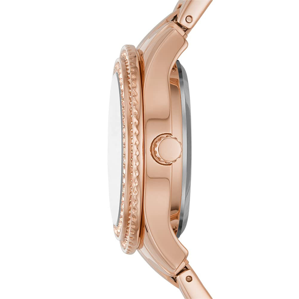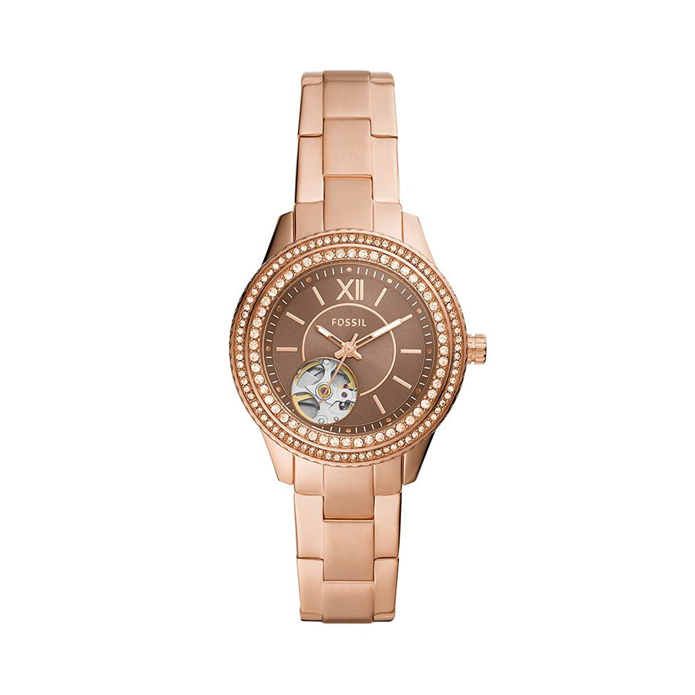 Add a hint of charm to your look with this women's analog watch from the Stella collection by Fossil. Its stainless steel strap flaunts a rose gold hue that accentuates the look of the watch. The brown round dial is nestled in a 34 mm case. It exudes plain three...