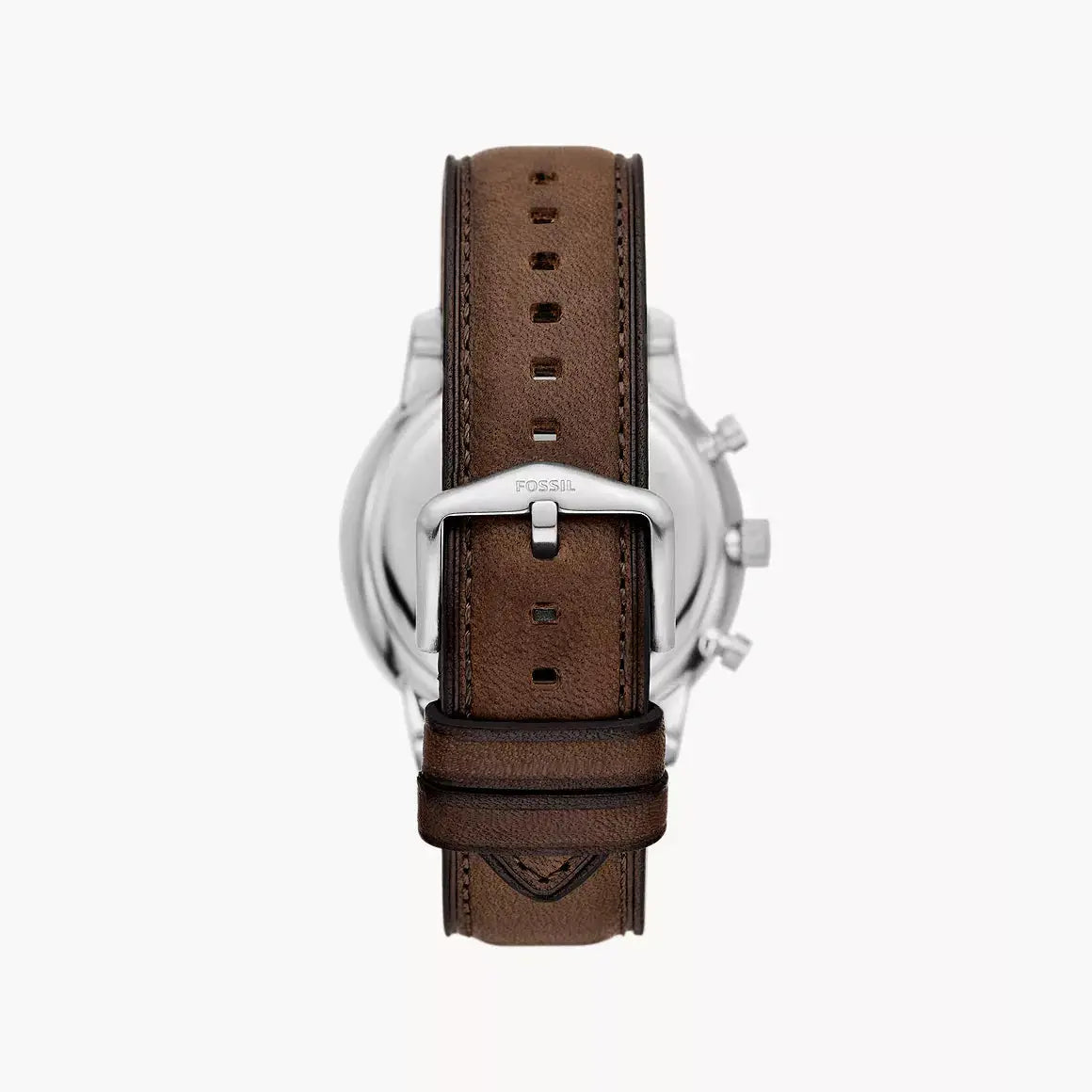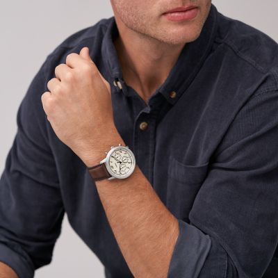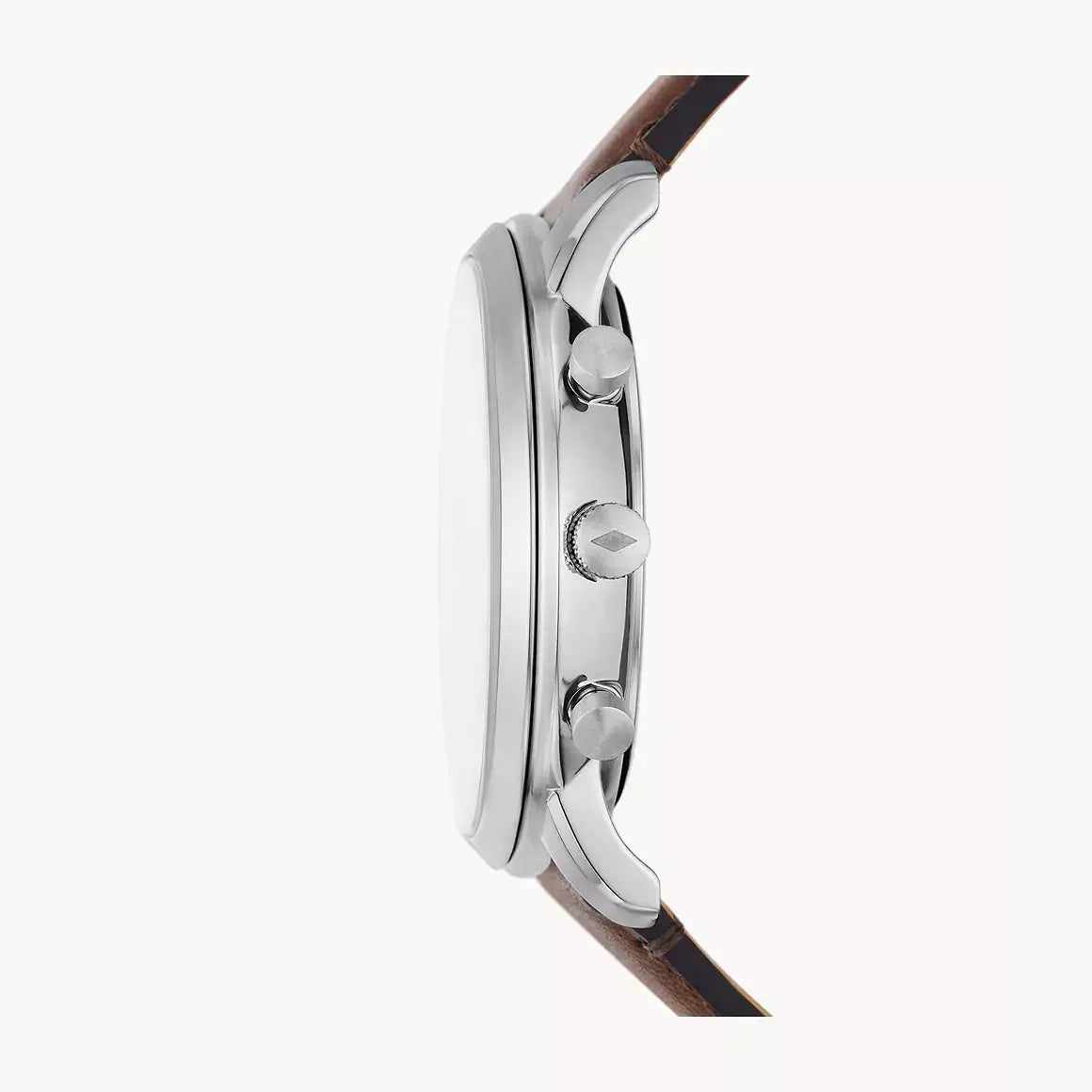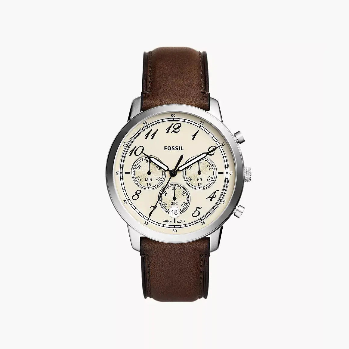 Inspired by architecture with its simple proportions and symmetry, this functional Neutra Chronograph is refined and versatile. It features an updated numeral font, stainless steel case, parchment-hued sunray dial, brown leather strap with nubuck lining and subdials for 24-hour time and stopwatch.