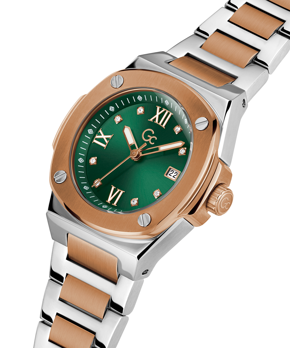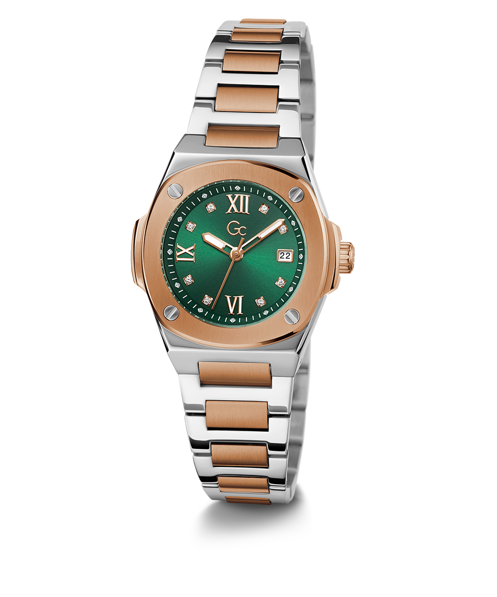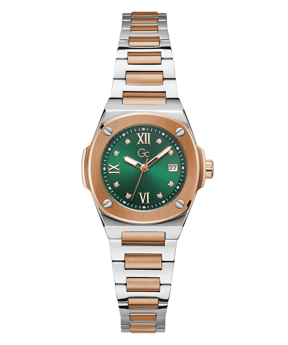 Revamp your style, with Gc Coussin shape Mini and its square case. Rose Gold sophistication, and dazzling crystals give this timepiece an elegant allure. The charismatic case have screw design details on the bezel. The two-tone silver & rose gold version has a green dial with rose gold hands. This...