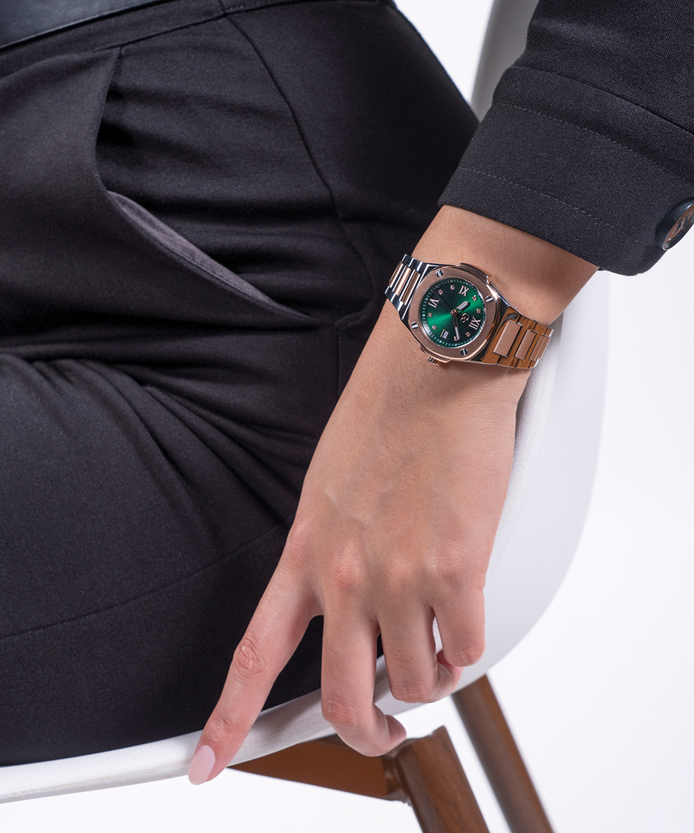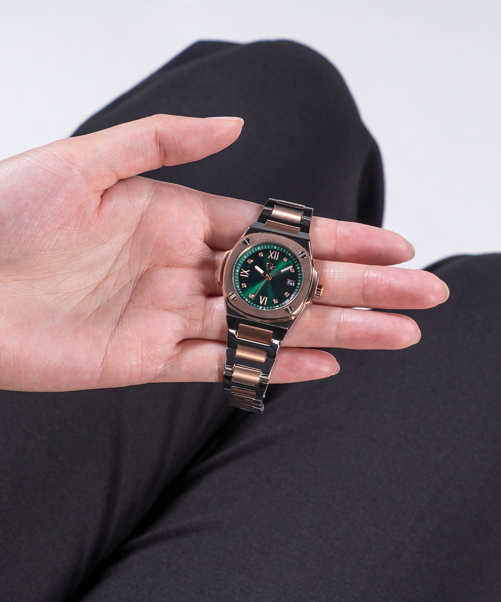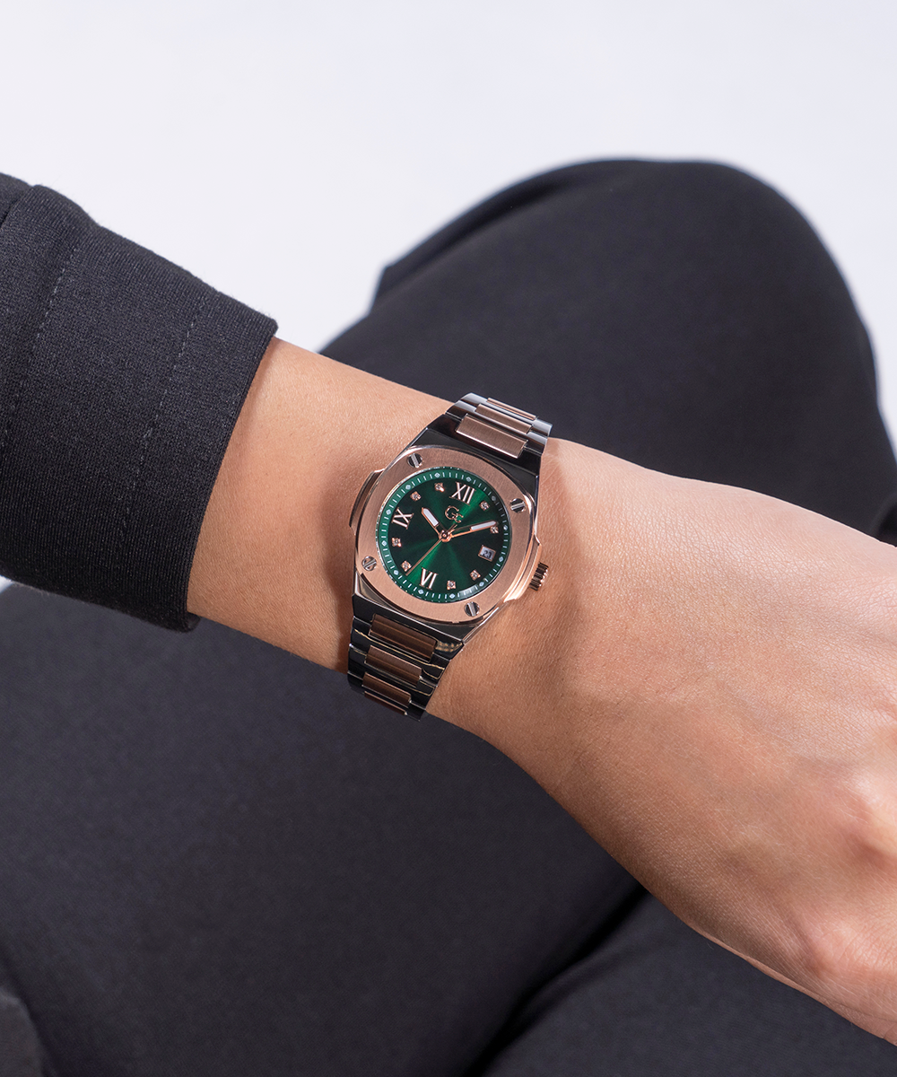 Revamp your style, with Gc Coussin shape Mini and its square case. Rose Gold sophistication, and dazzling crystals give this timepiece an elegant allure. The charismatic case have screw design details on the bezel. The two-tone silver & rose gold version has a green dial with rose gold hands. This...