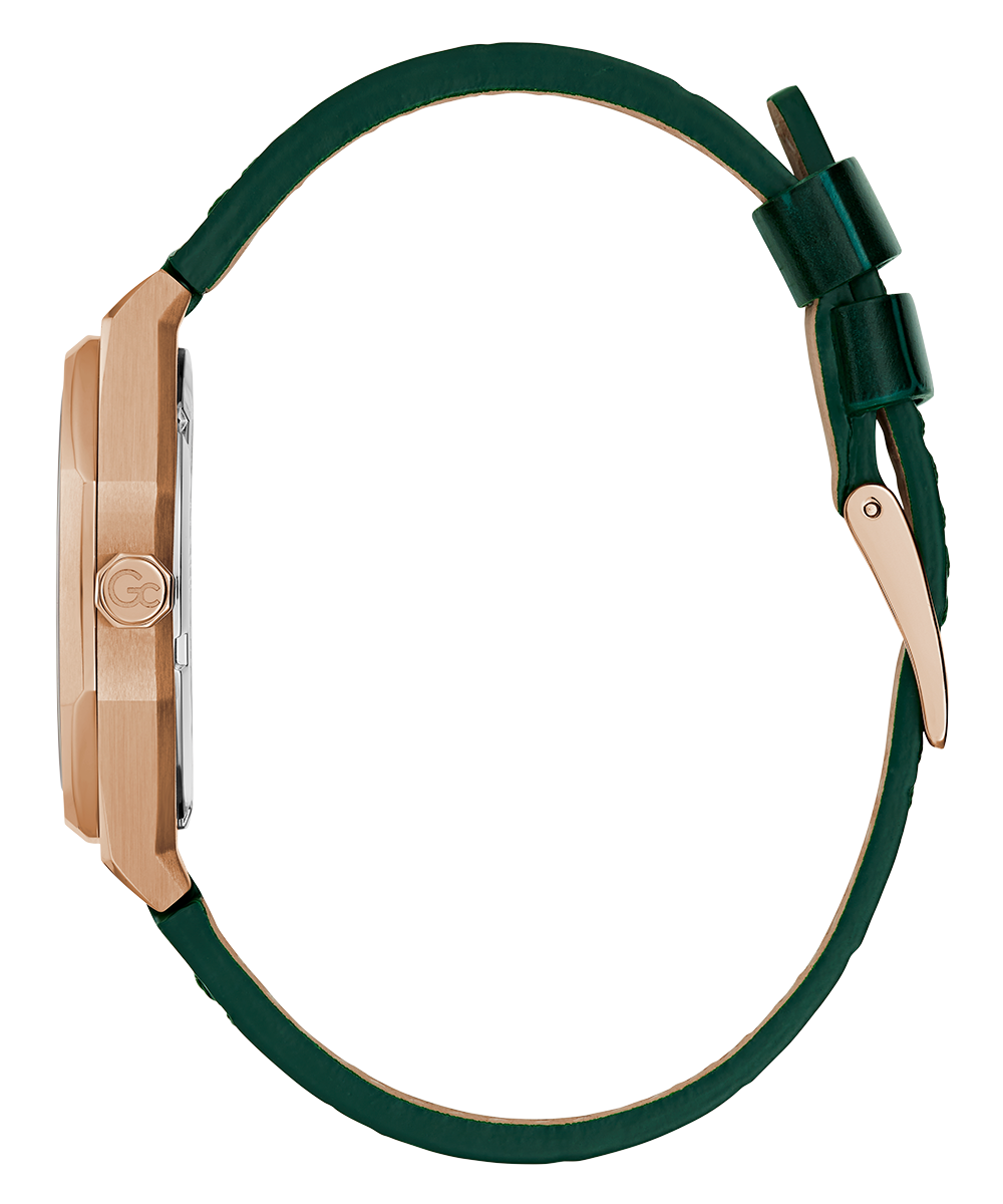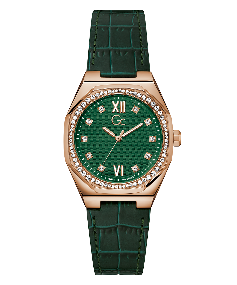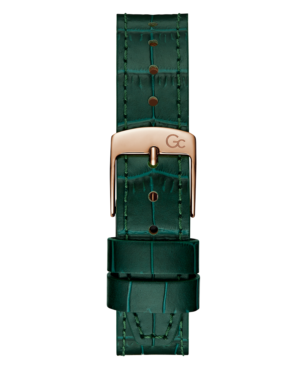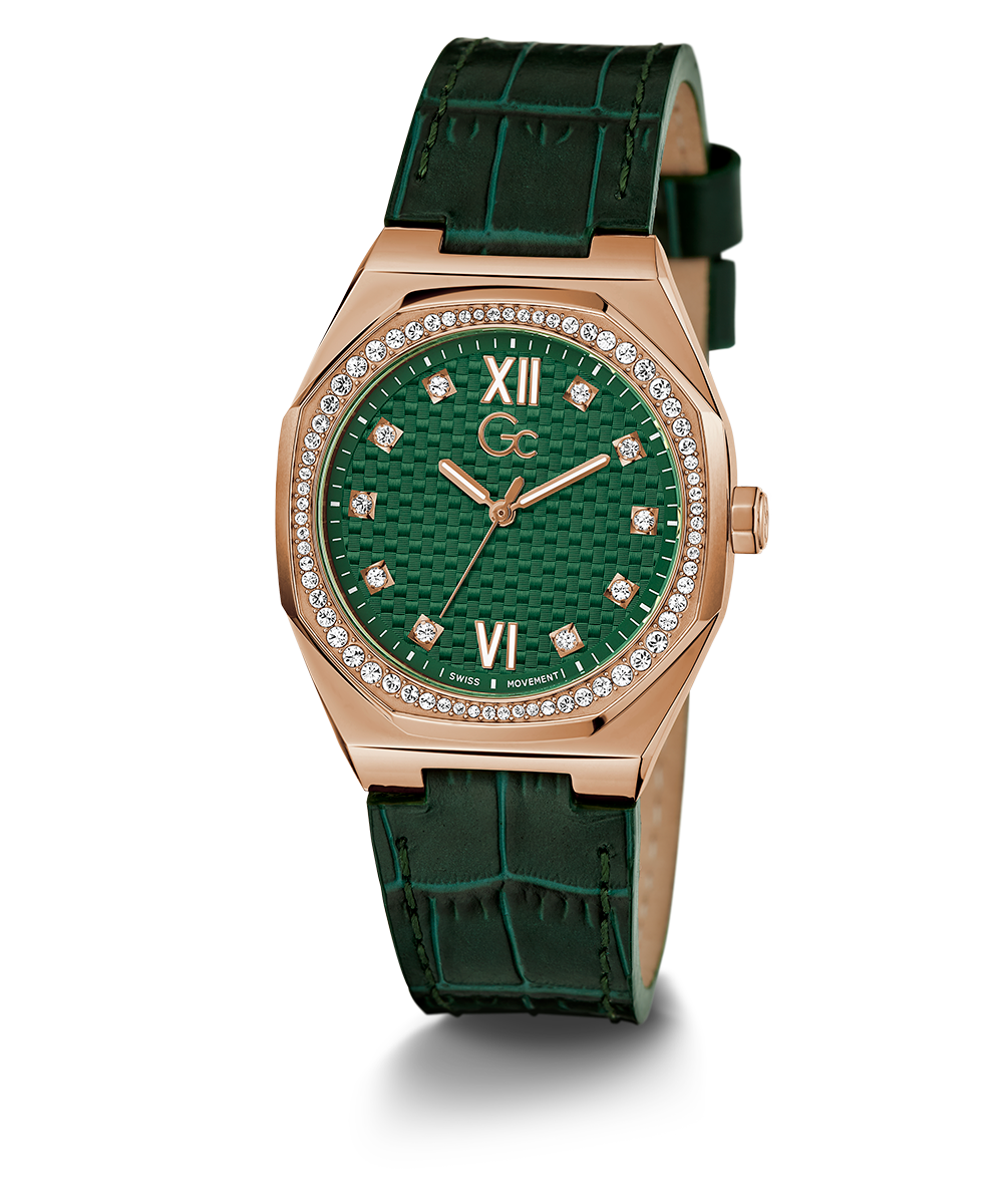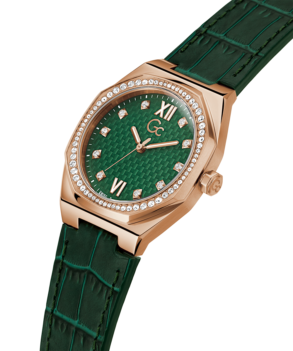 The Gc Coussin Sleek takes our iconic cushion look to a dressier twist, with its slim case in size 34mm, refined crystal setting and amazingly detailed woven dial in a rose gold PVD and emerald green dial. An eco-friendly croco patterned genuine leather strap completes the look.