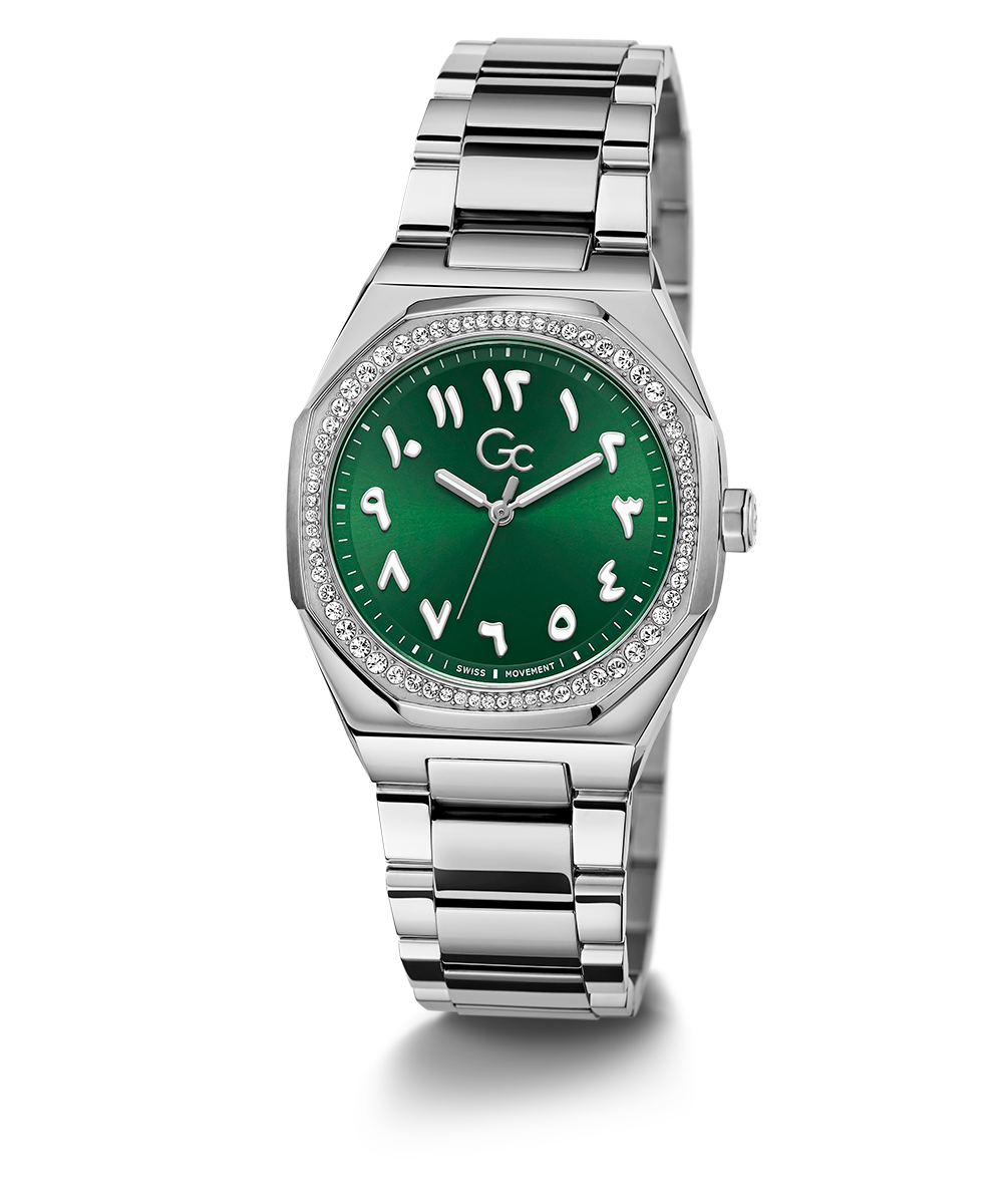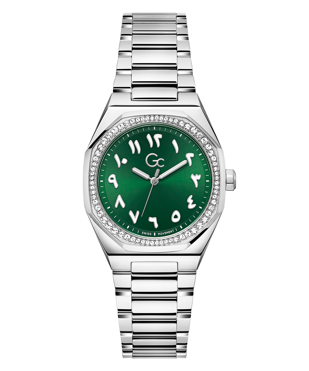 The Gc Coussin Sleek takes our iconic cushion look to a dressier twist, with its slim case in size 34mm and refined crystal setting. This silhouette features silver tone with emerald green sunray dial and Indian numerals. This unique version is inspired by Indian heritage & its rich styling.