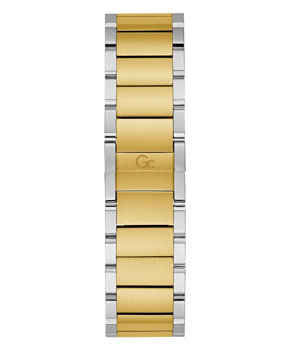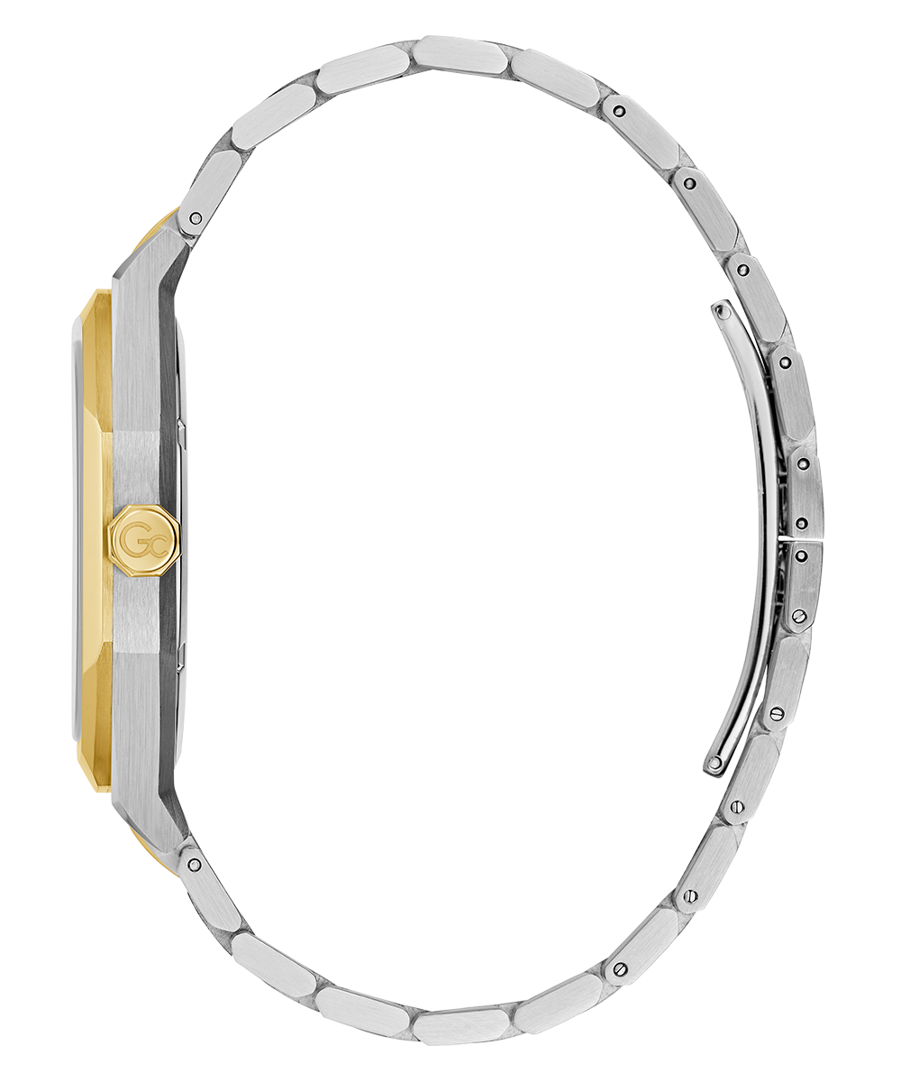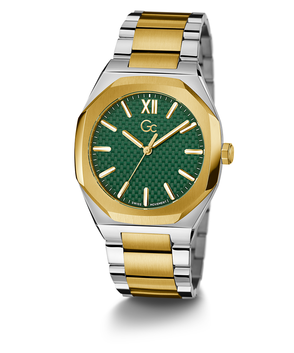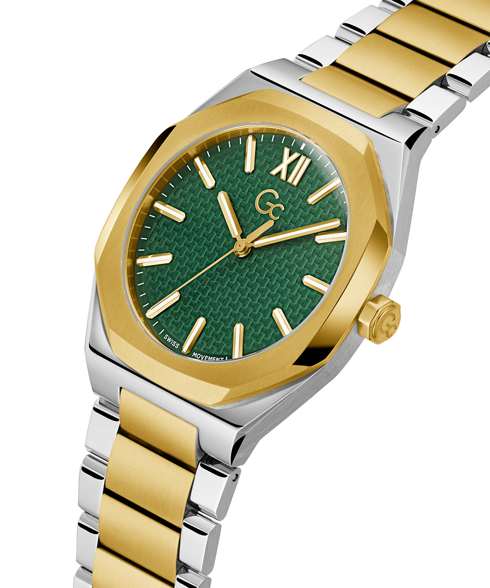 The Gc Coussin Sleek takes our iconic cushion look to a dressier twist, with its slim case in size 42mm, refined top ring design and amazingly detailed woven dial in two-tone silver & yellow gold PVD with an emerald green dial.