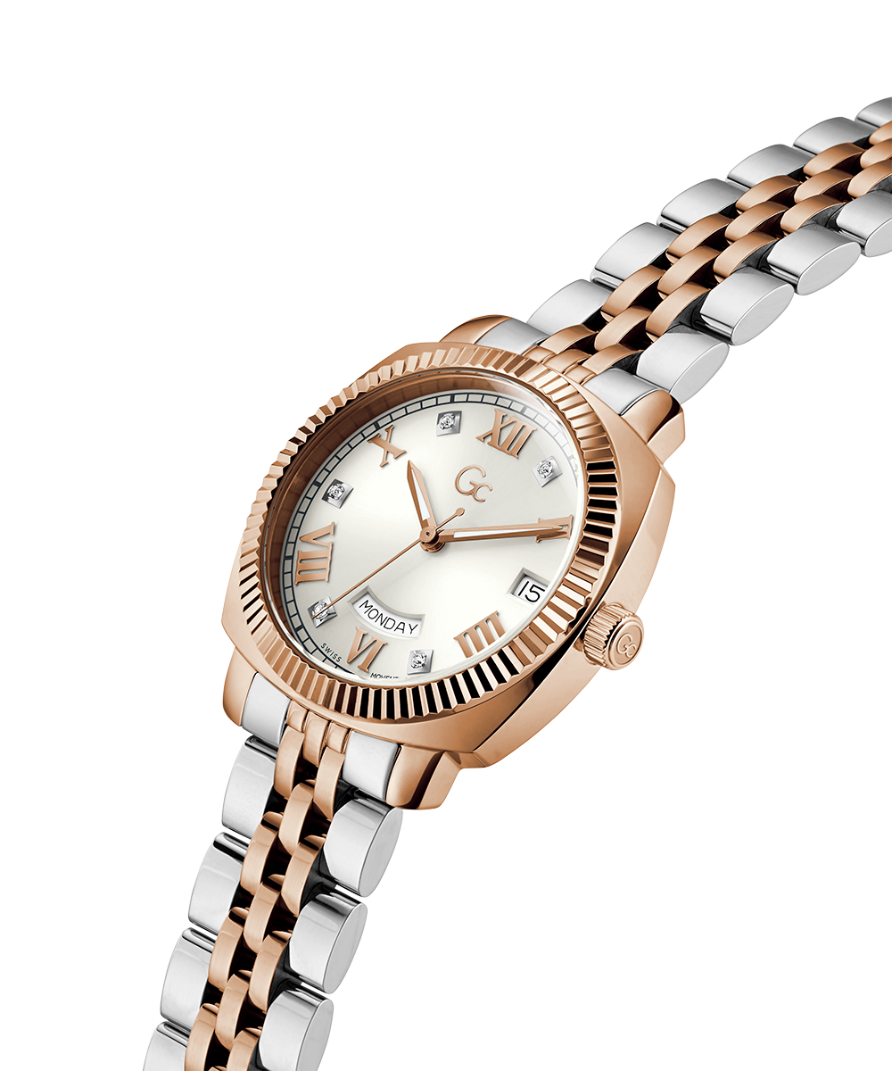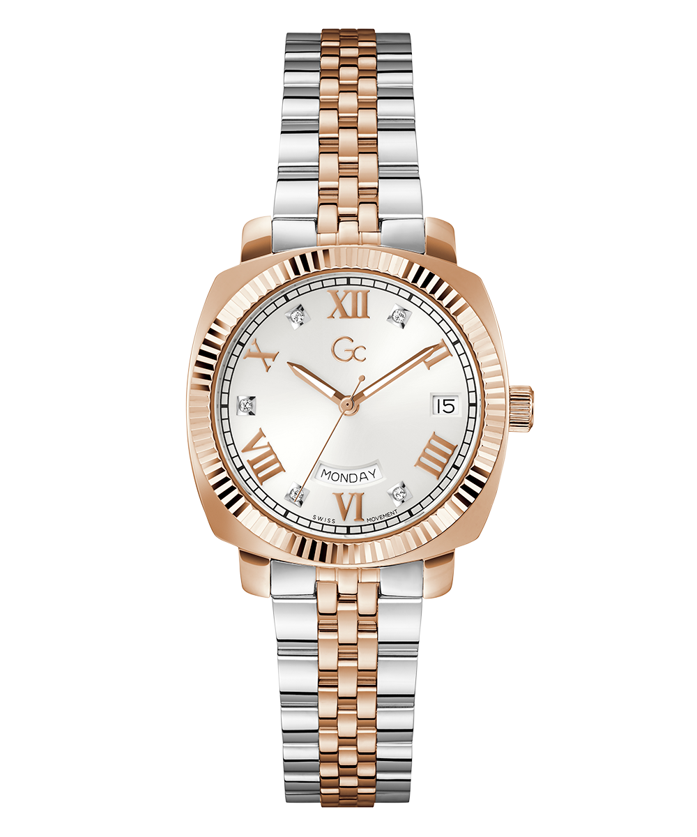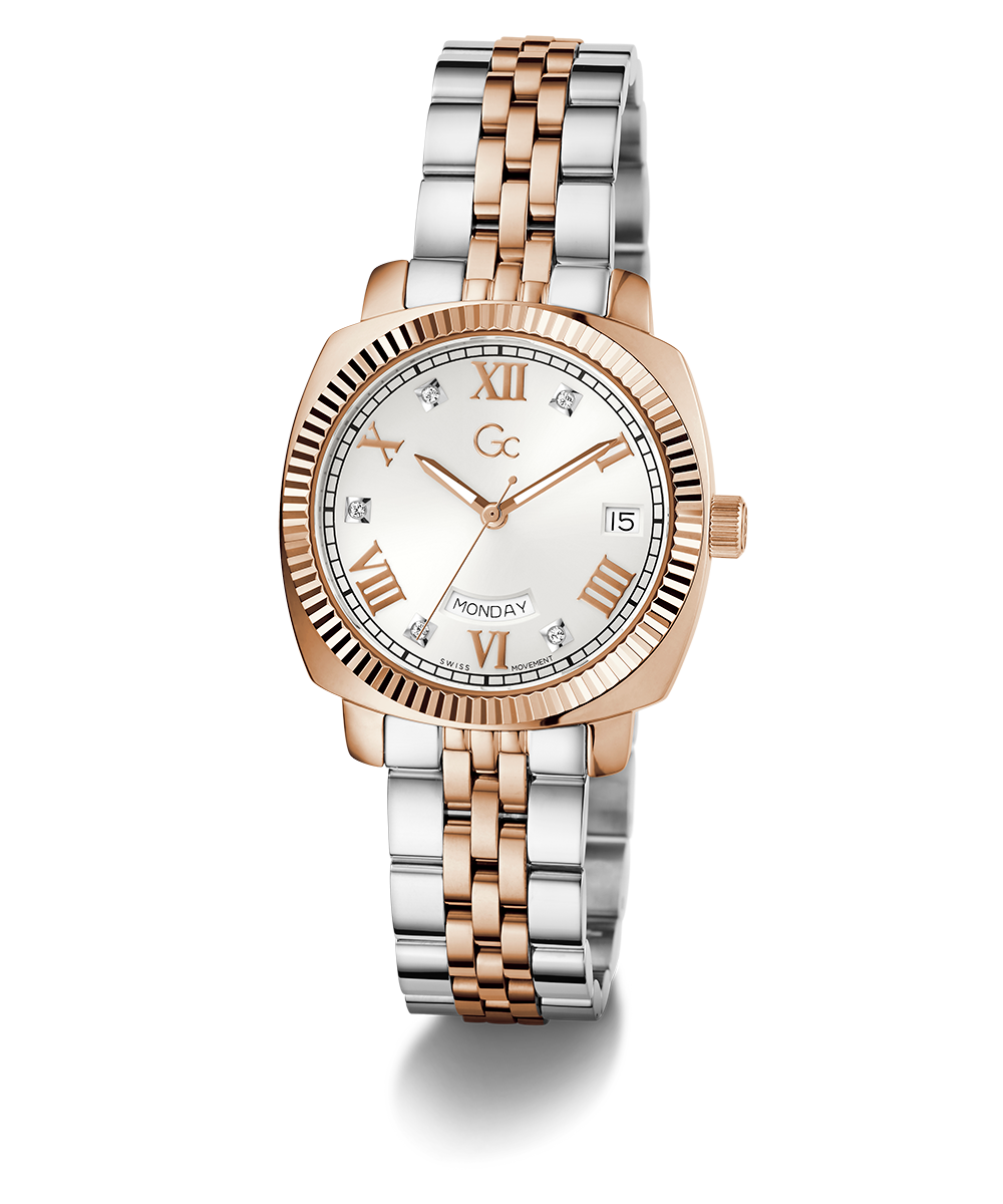 Add a touch of refinement to your everyday wardrobe with the Gc Flair, now offered in a cushion shape. This stylish timepiece features a distinctive notched bezel and a comfortable, supple five-link bracelet. The rose gold and silver two-tone version comes with a pure white sunray dial, showcasing a visible...