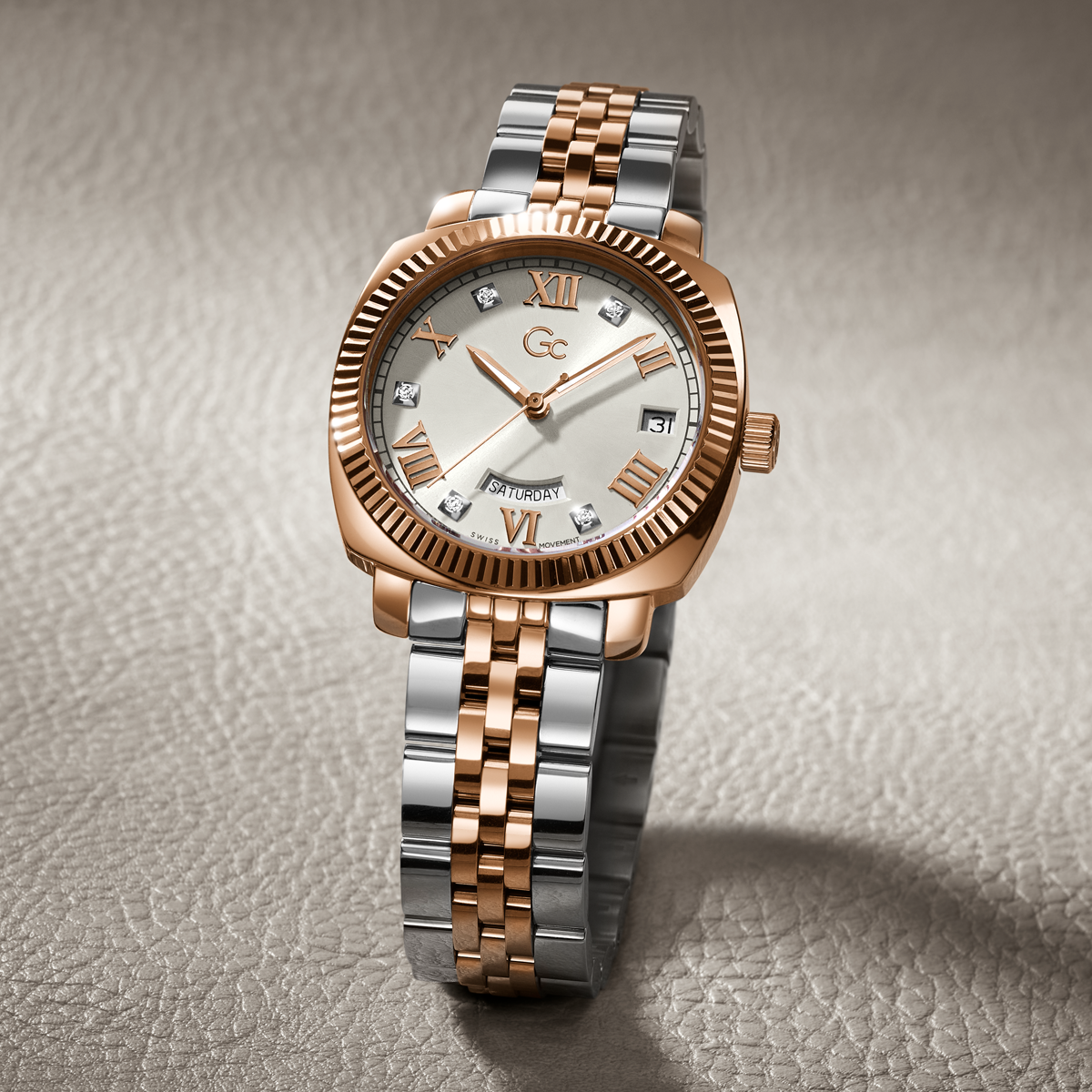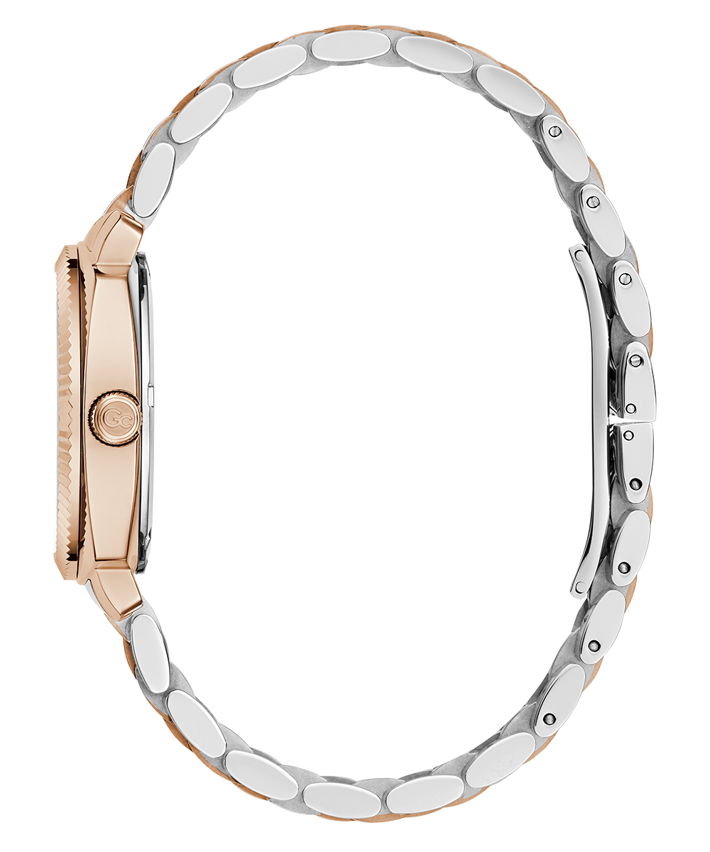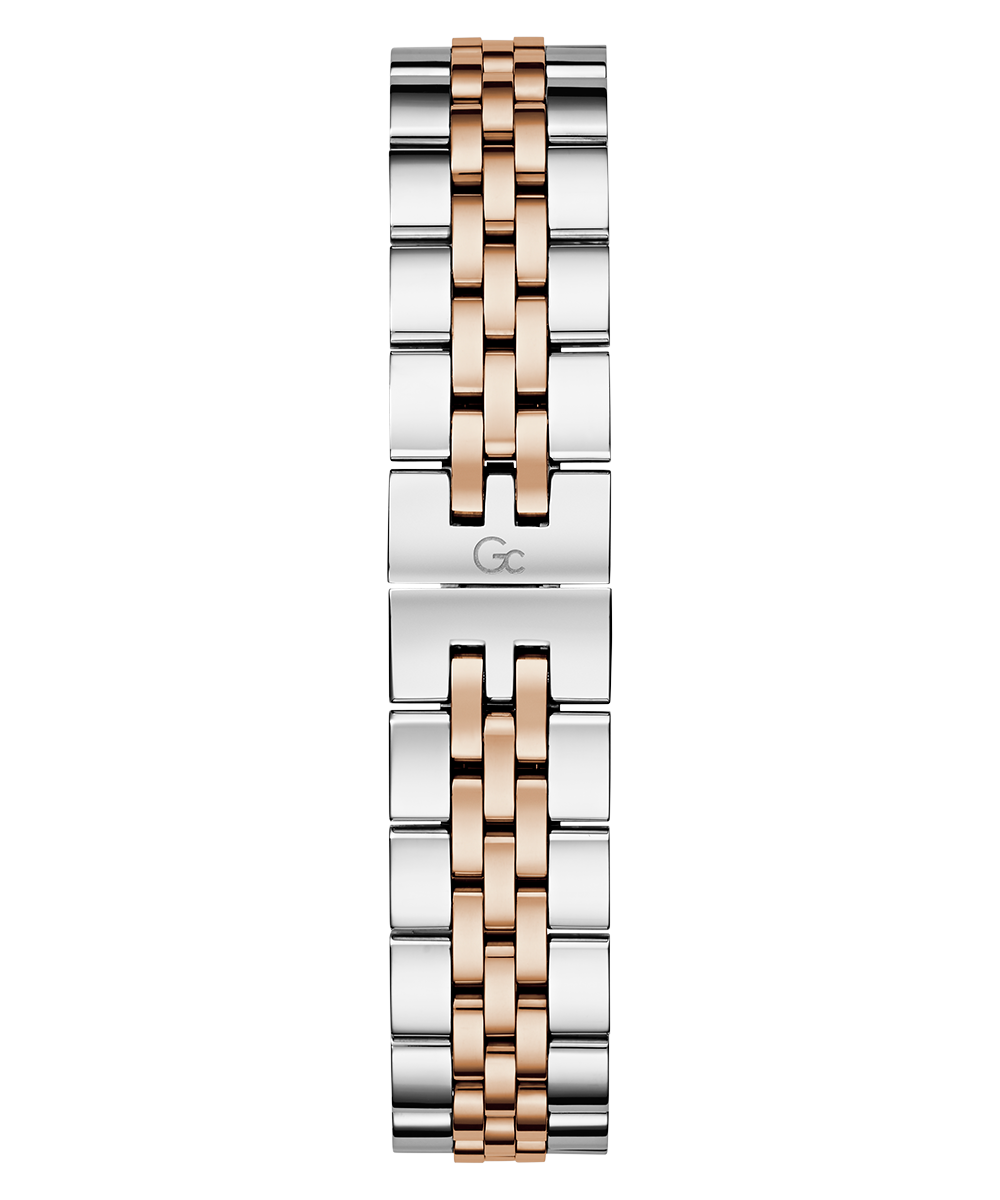 Add a touch of refinement to your everyday wardrobe with the Gc Flair, now offered in a cushion shape. This stylish timepiece features a distinctive notched bezel and a comfortable, supple five-link bracelet. The rose gold and silver two-tone version comes with a pure white sunray dial, showcasing a visible...