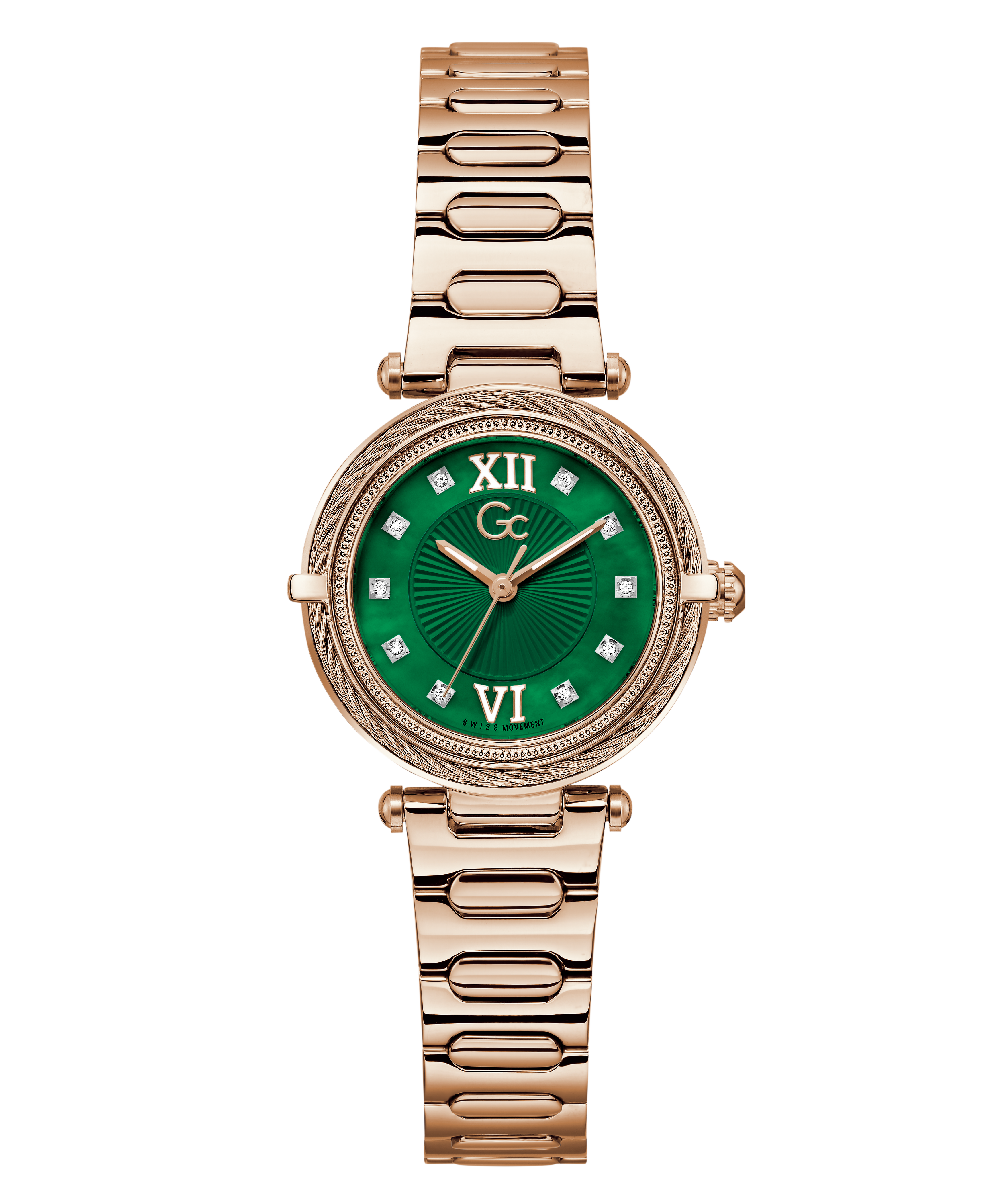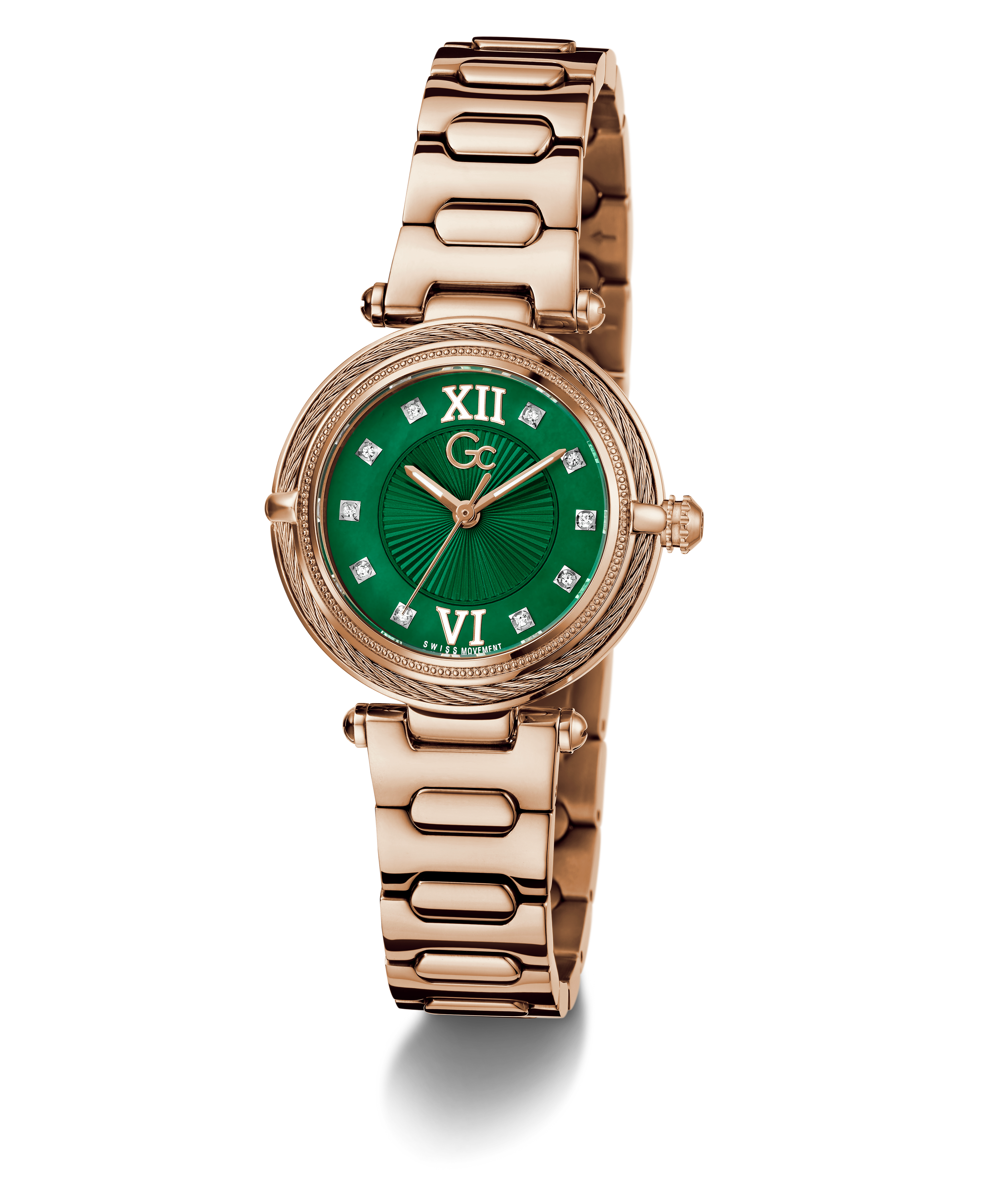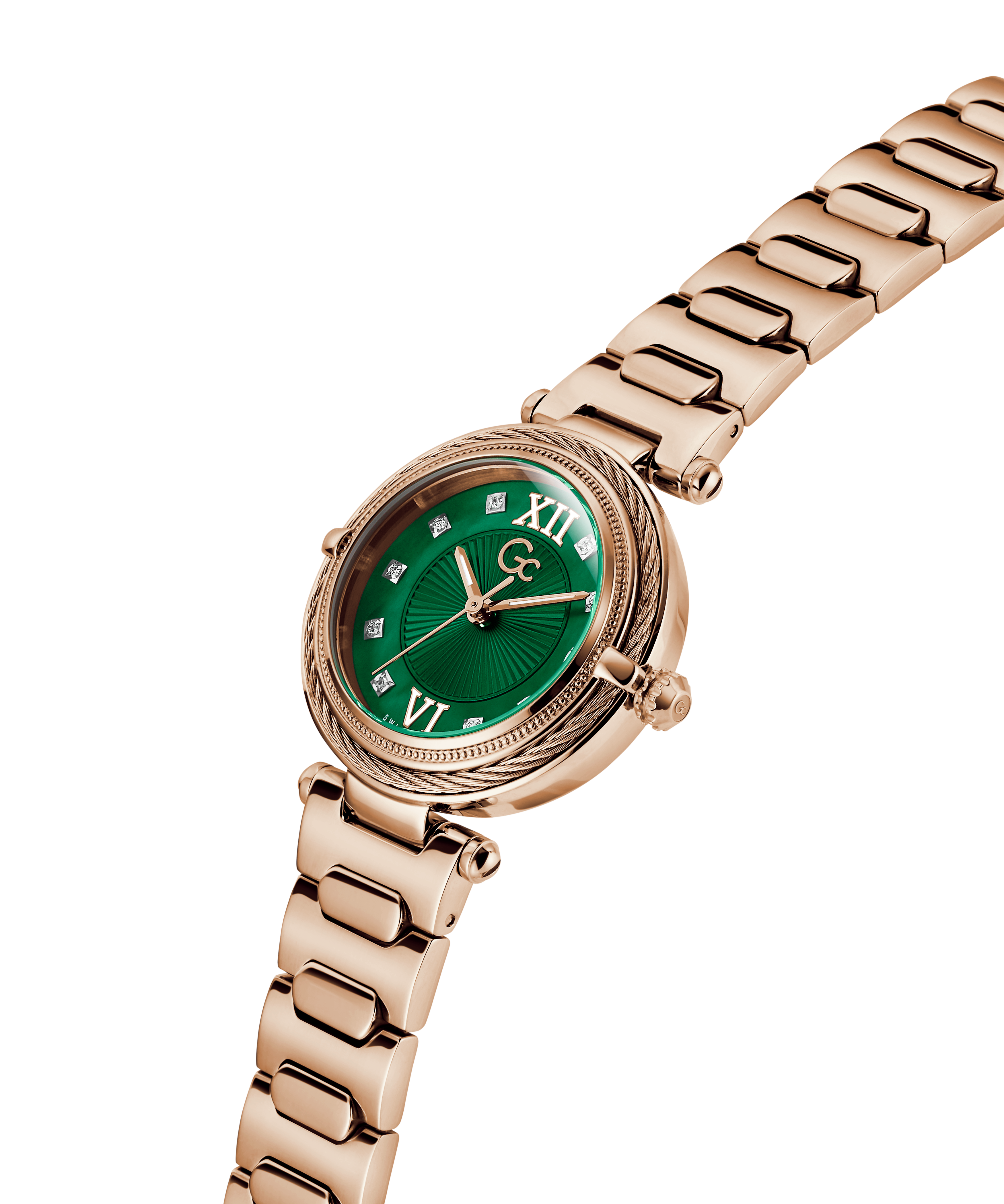 An elegant allure for the mini Gc Vogue Cable, which offers a beautiful 30mm case combining the sparkle of genuine cable with a radiant eco-friendly dark green mother-of-pearl and textured dial. The bracelet is elegantly contemporary, making the overall look very sophisticated, in a full rose gold PVD version.