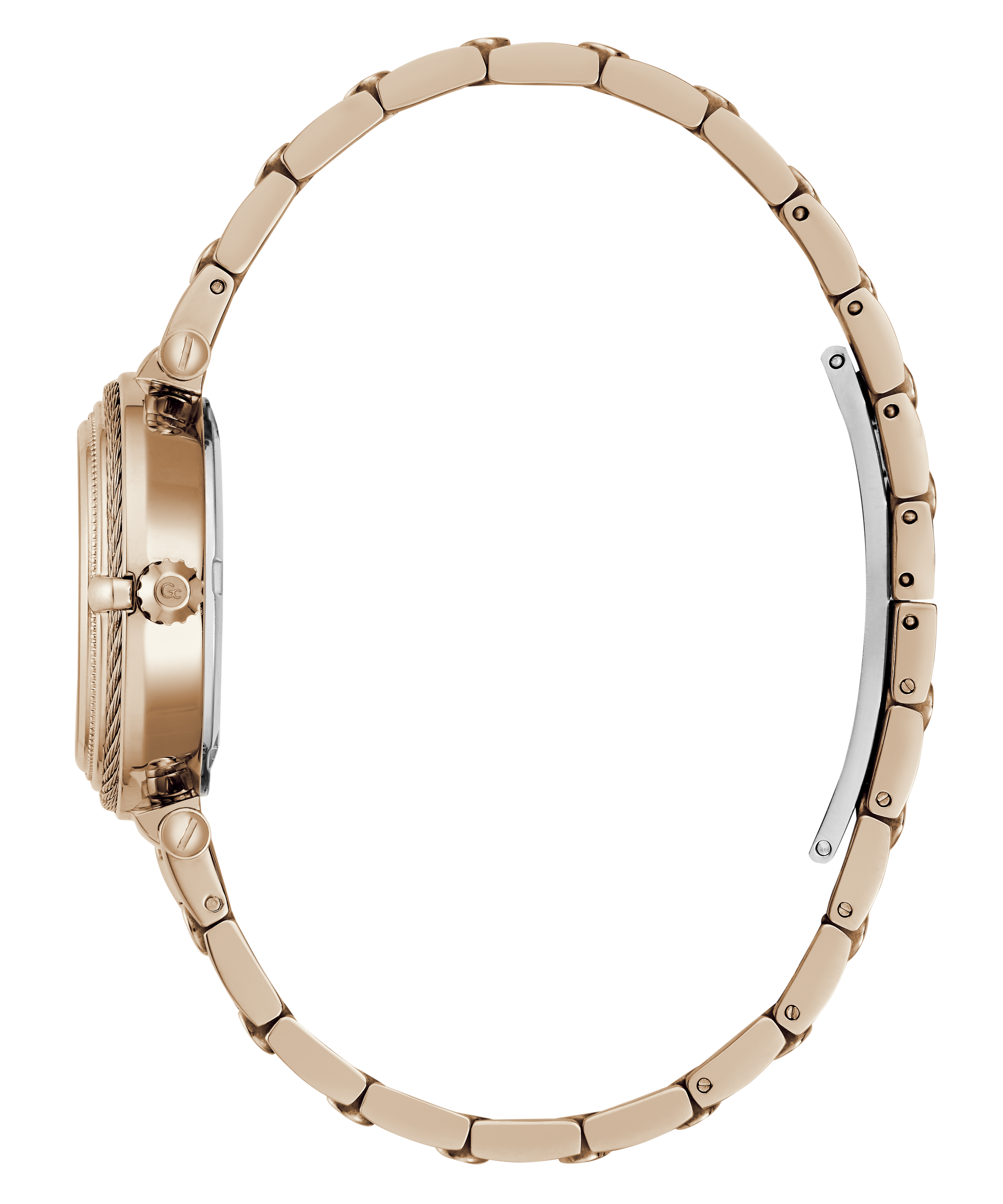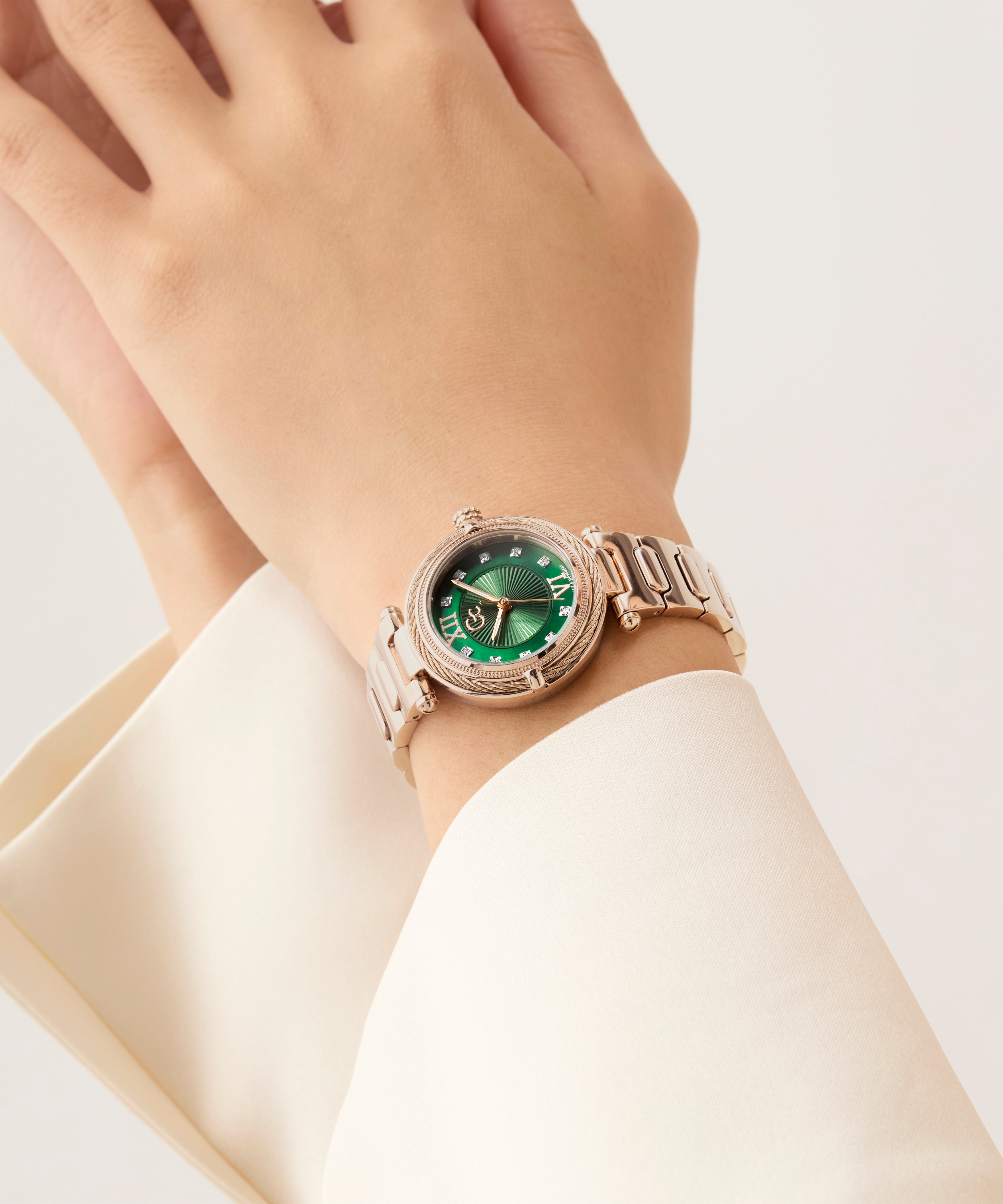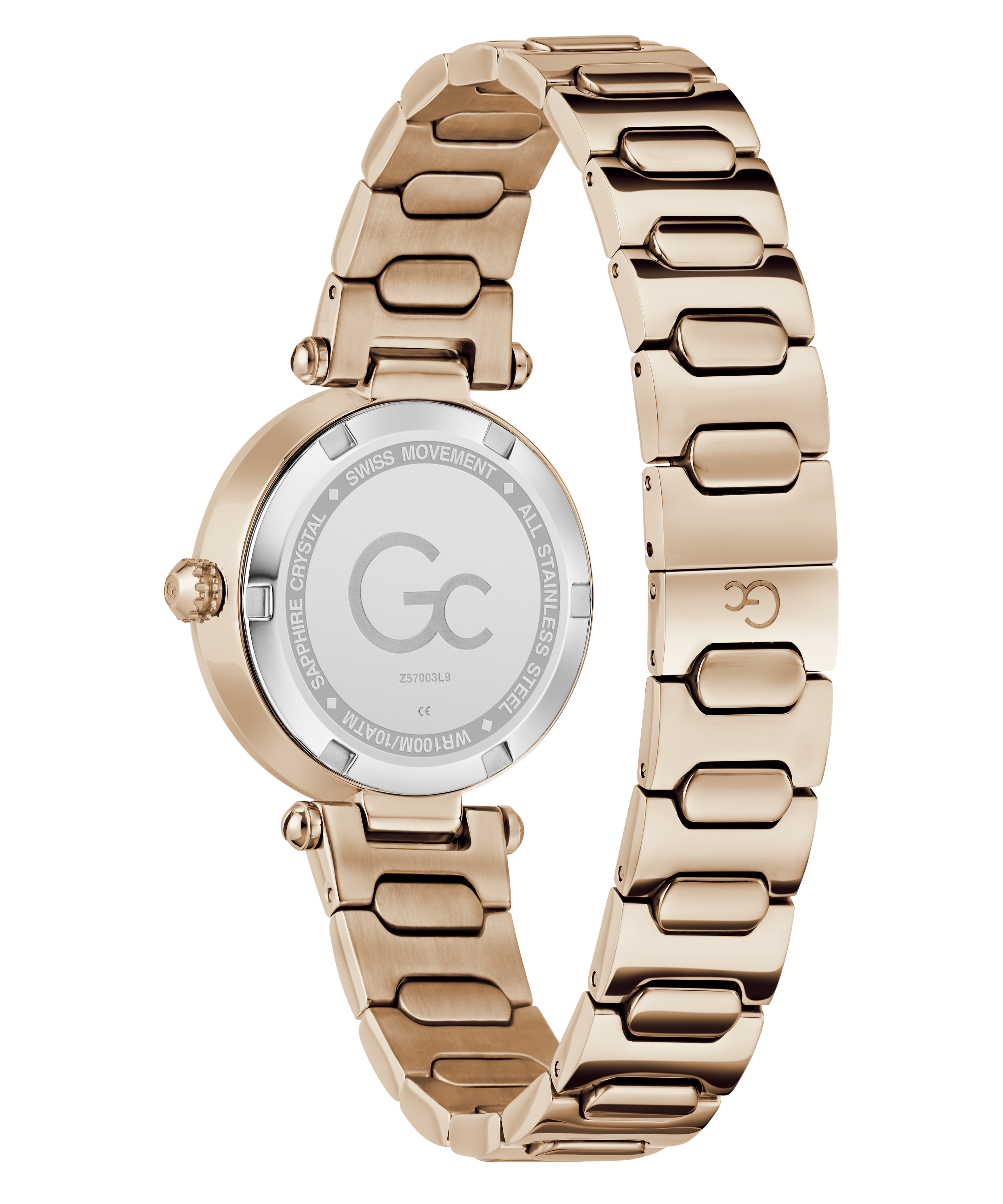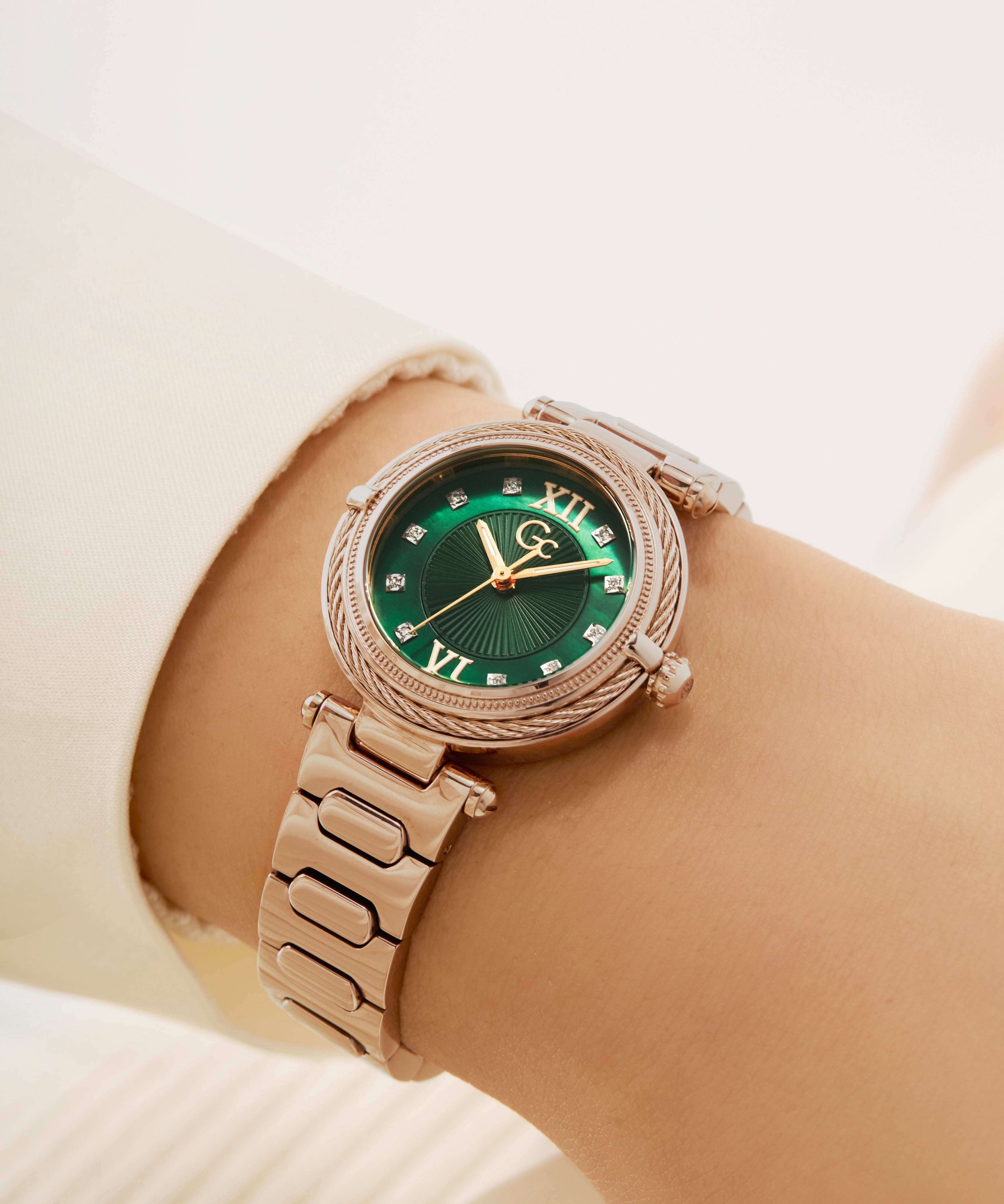 An elegant allure for the mini Gc Vogue Cable, which offers a beautiful 30mm case combining the sparkle of genuine cable with a radiant eco-friendly dark green mother-of-pearl and textured dial. The bracelet is elegantly contemporary, making the overall look very sophisticated, in a full rose gold PVD version.